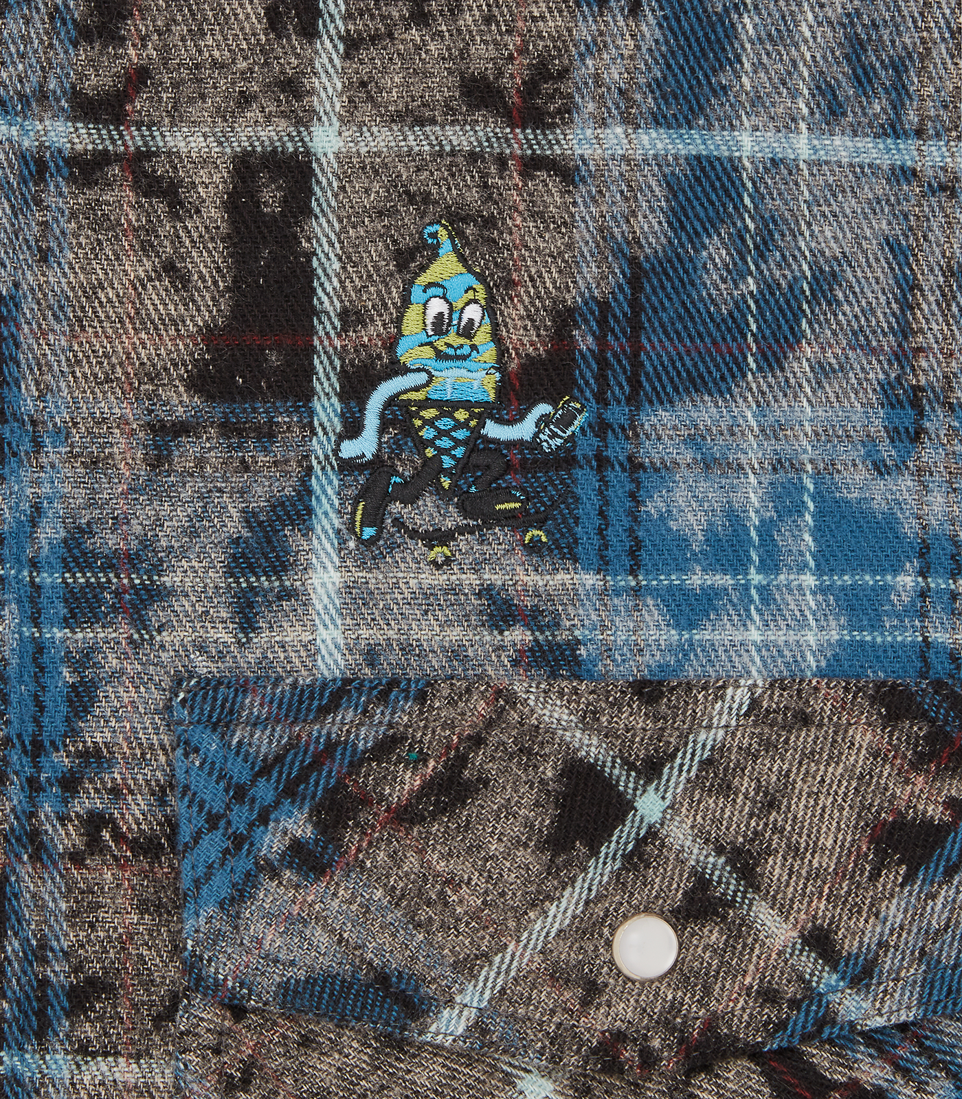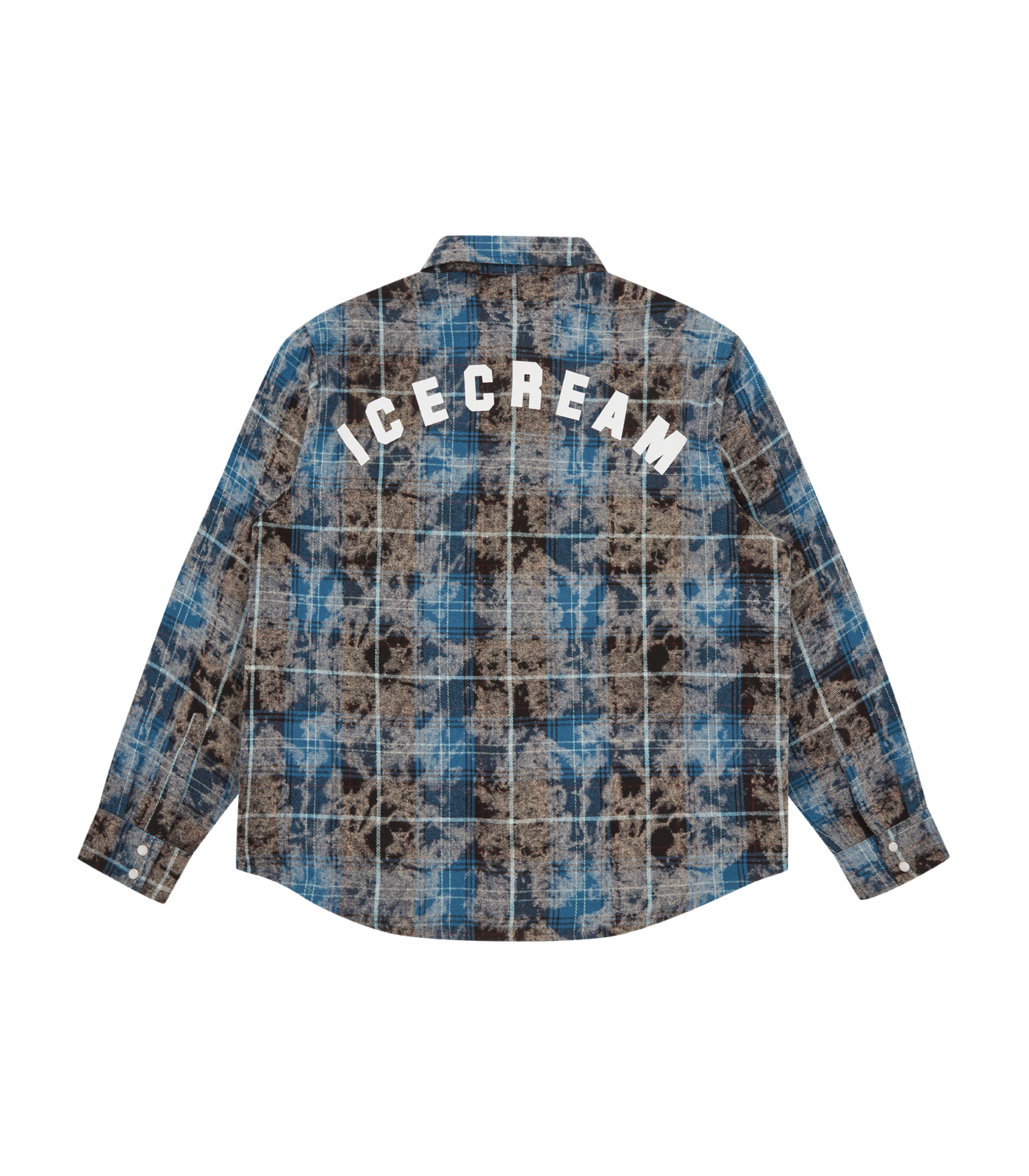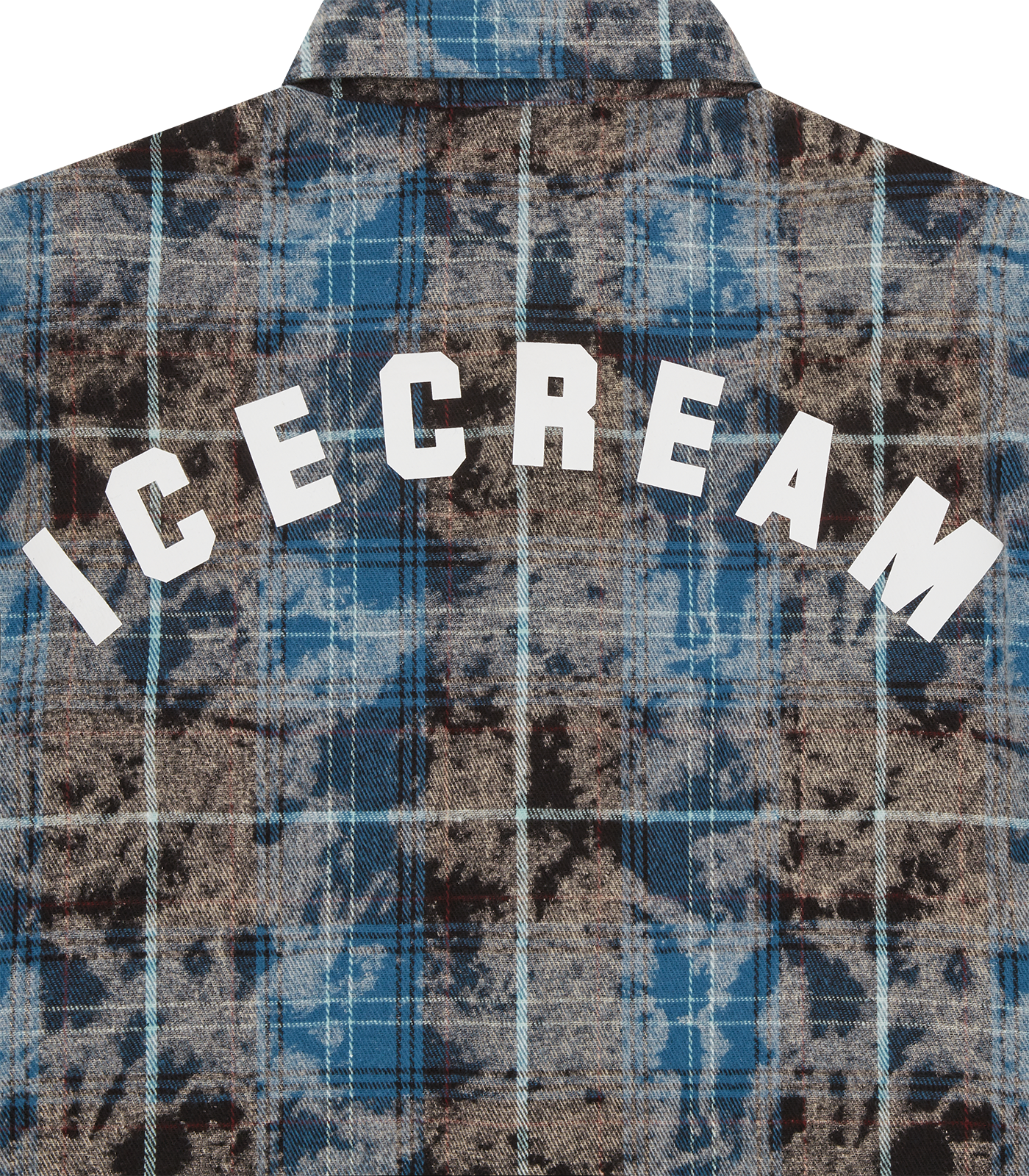 ICECREAM Spring '25 - Acid Wash Check Shirt featuring the embroidered ICECREAM staff label and the Team EU Skate Cone at chest pockets; it is finished with the printed ICECREAM lettering on the back.