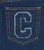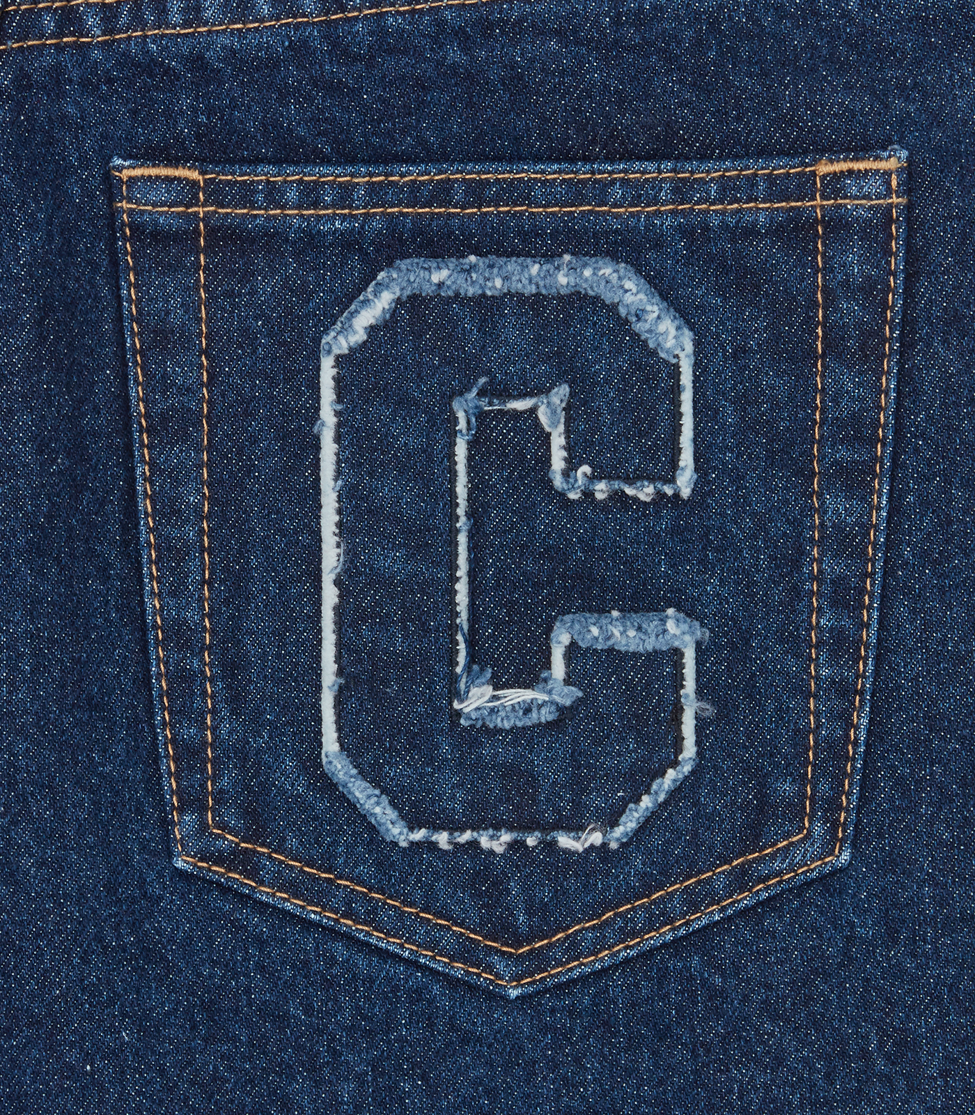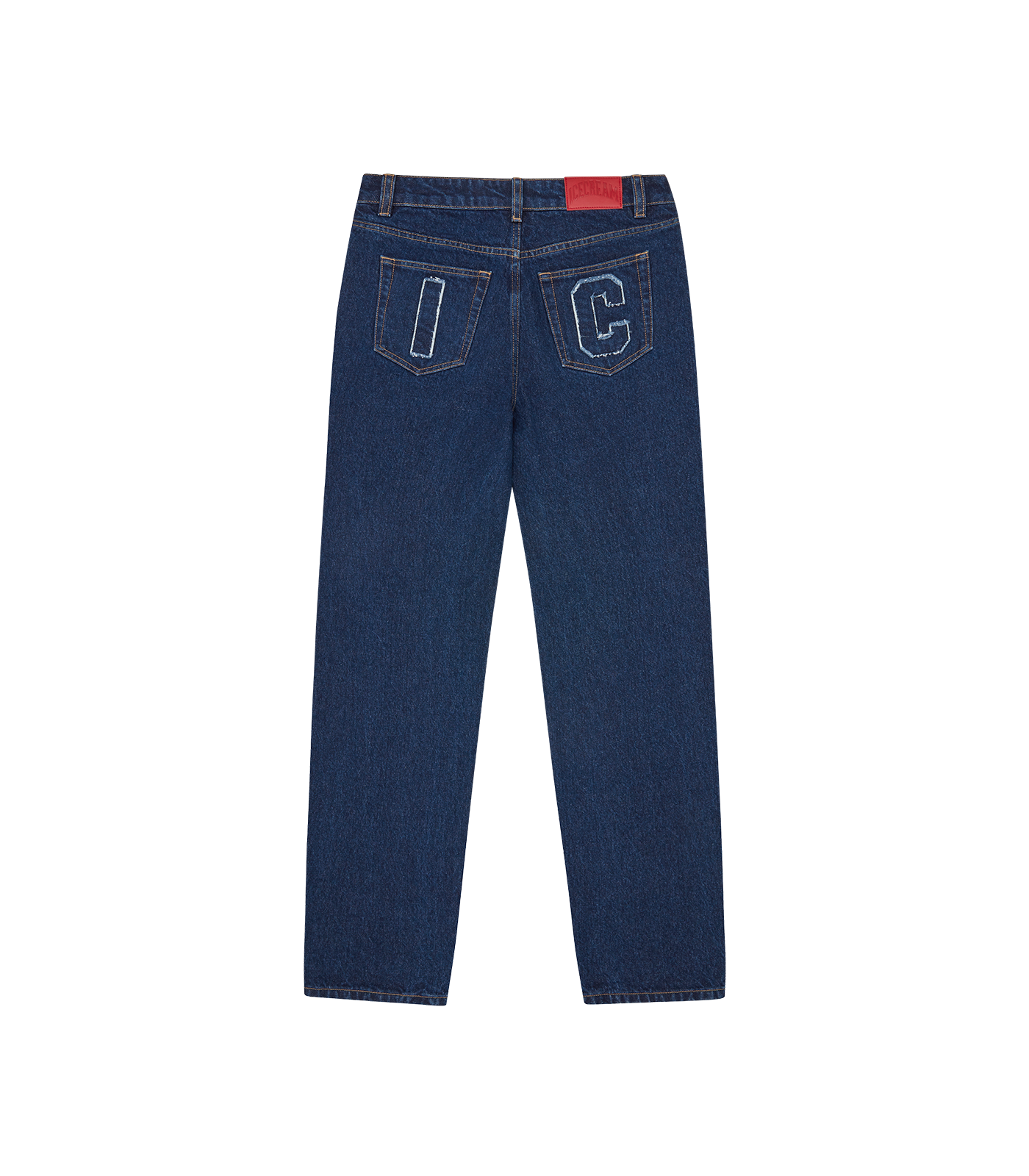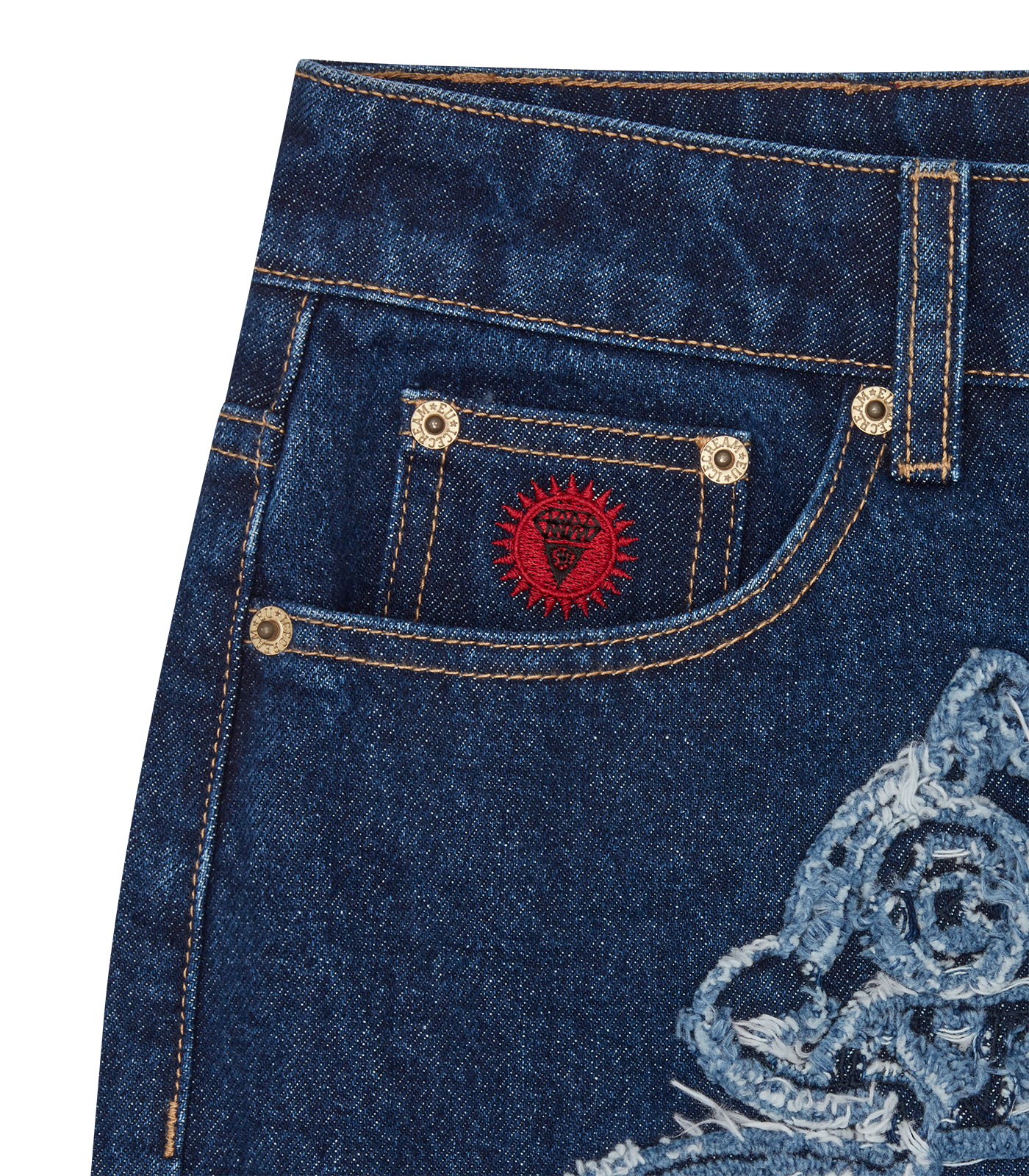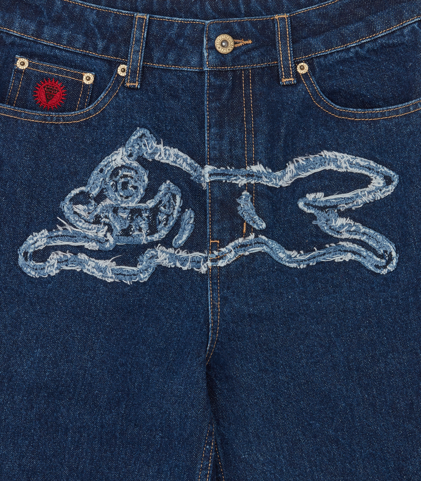 ICECREAM Women's Season 1 - Applique Running Dog Denim Pants, feature a raw edge Running Dog appliqué on the front, embroidered cone signet at coin pocket and raw edge patches on the back pockets. Zip-fastened fly. Mid rise, loose fit.