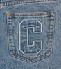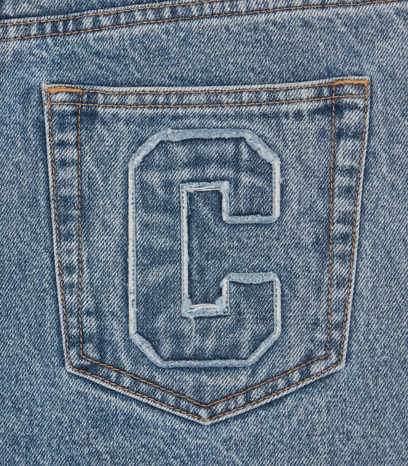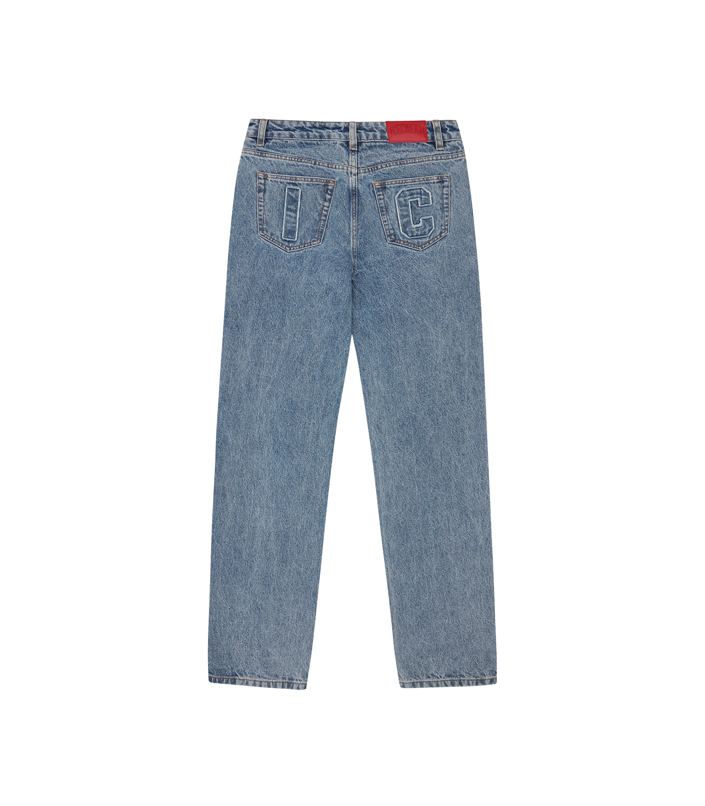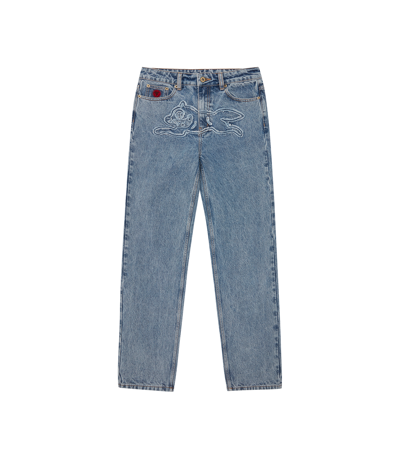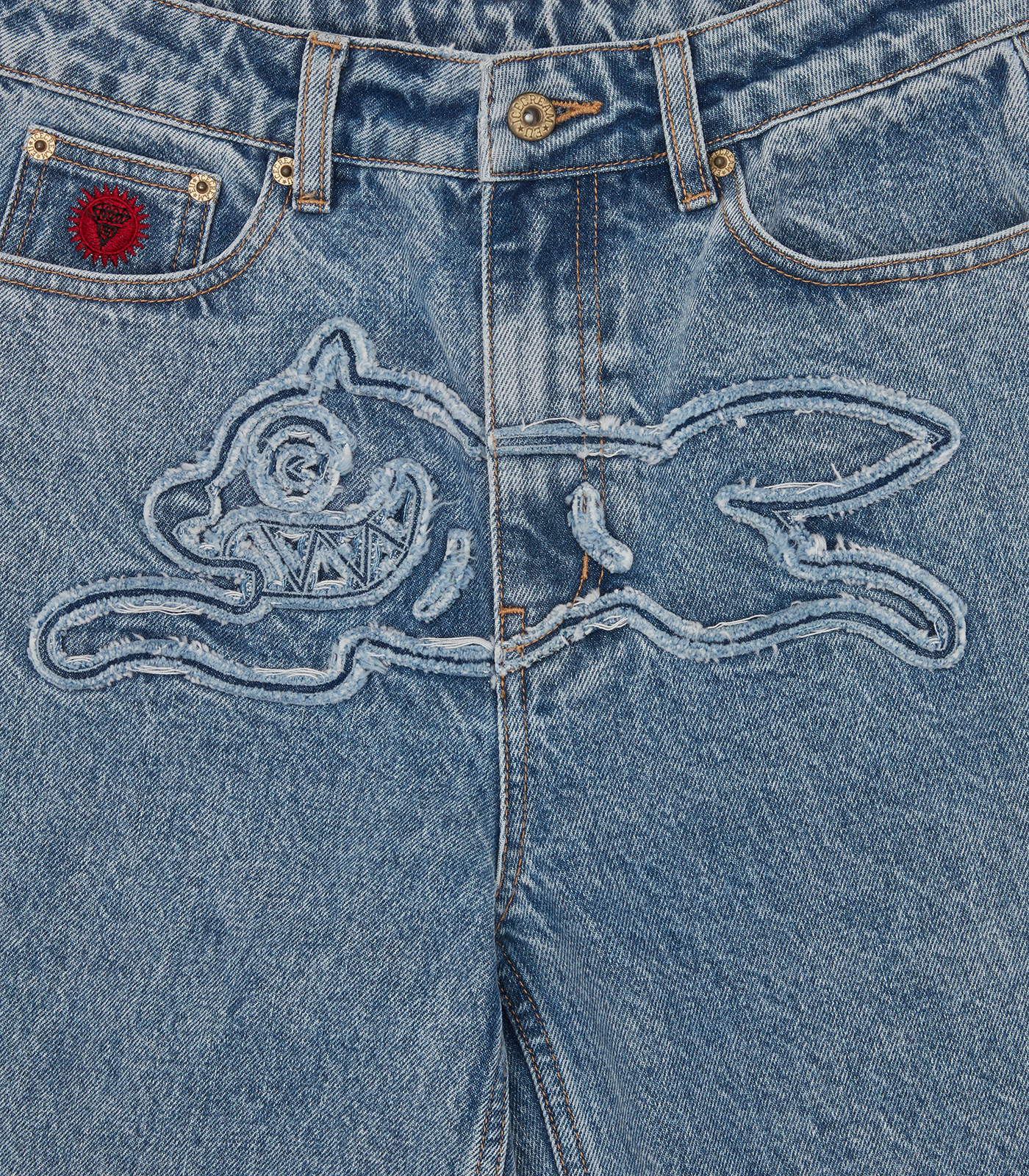 ICECREAM Women's Season 1 - Applique Running Dog Denim Pants, feature a raw edge Running Dog appliqué on the front, embroidered cone signet at coin pocket and raw edge patches on the back pockets. Zip-fastened fly. Mid rise, loose fit.