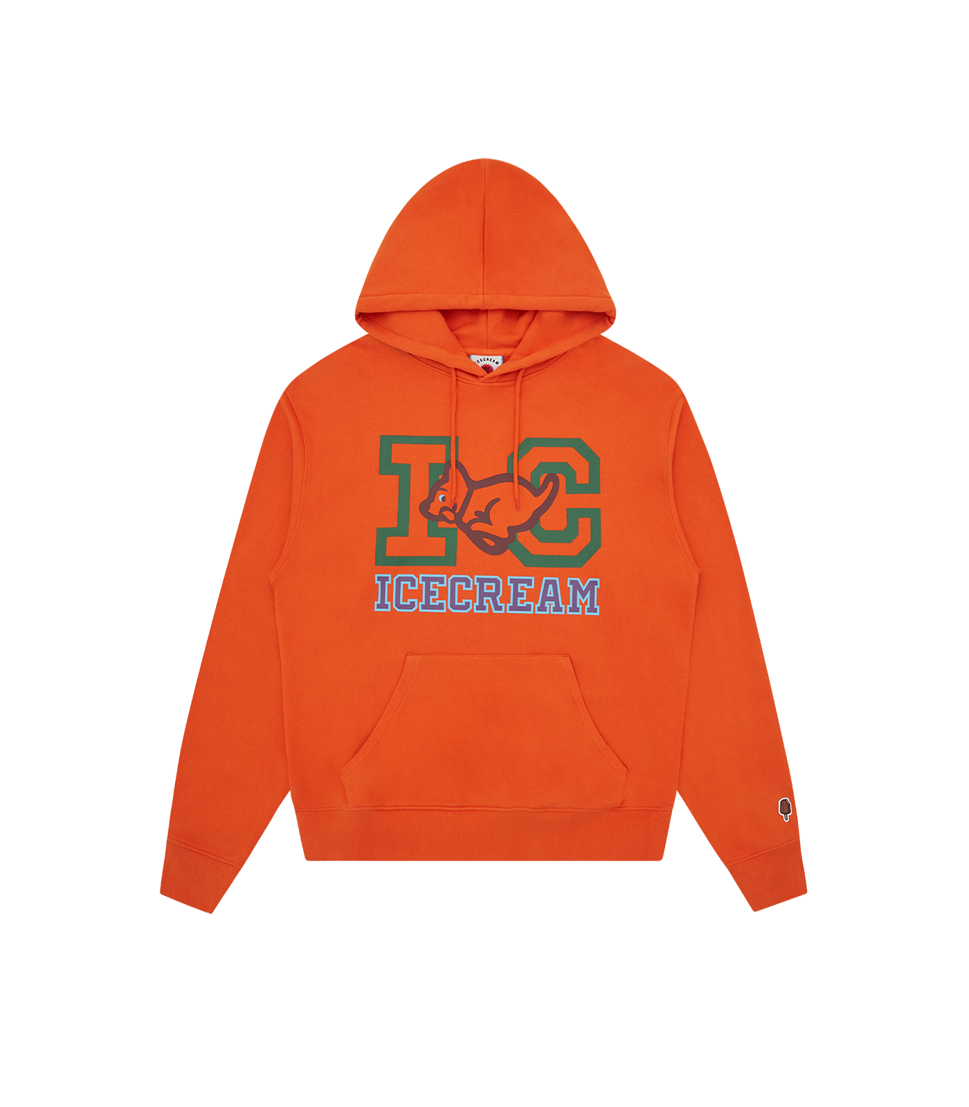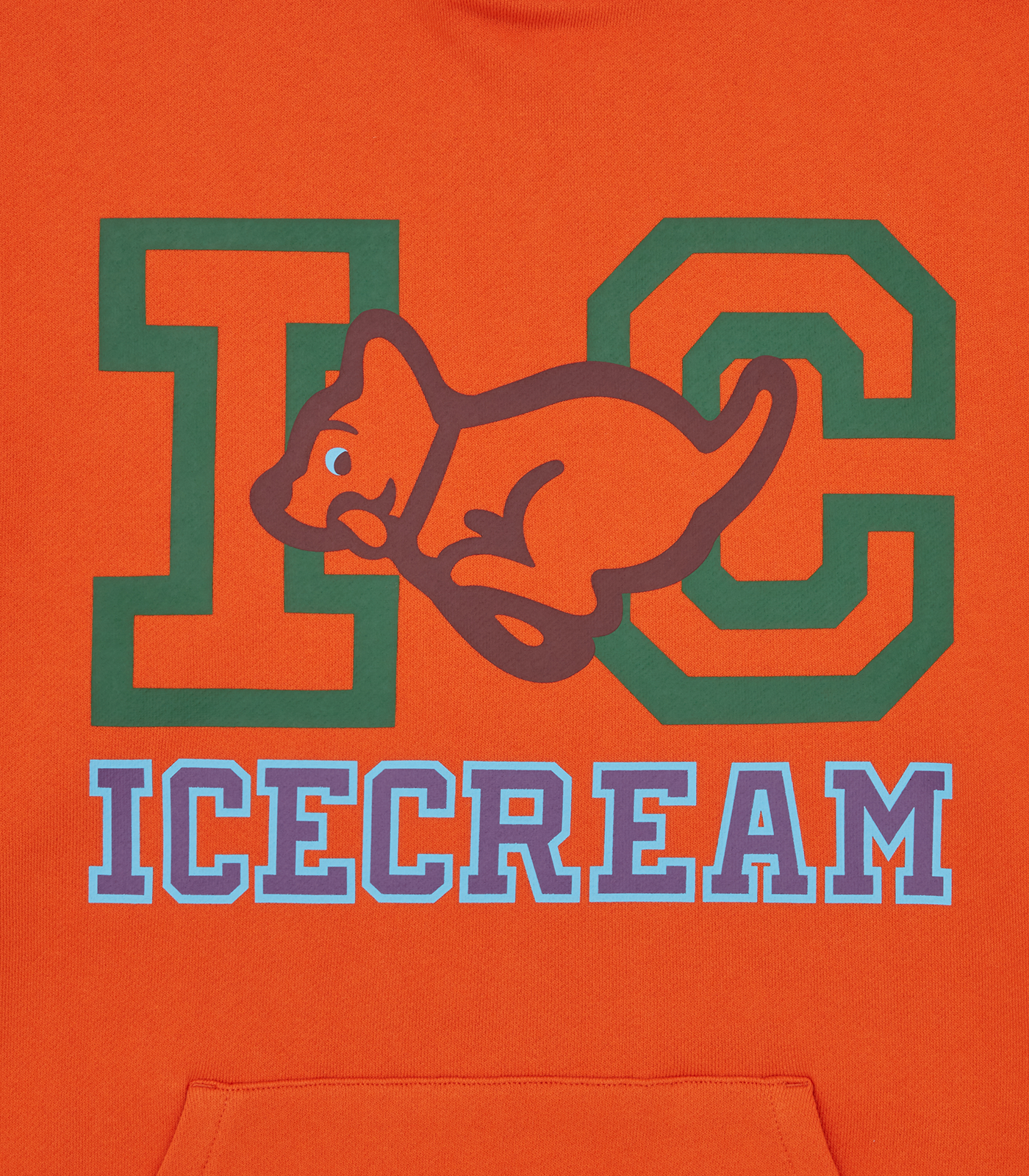 ICECREAM Pre-Fall '25 - The Collegiate Puppy Popover Hood is designed with the ICECREAM Running Puppy graphic on the front, kangaroo pouch and drawstring hood.