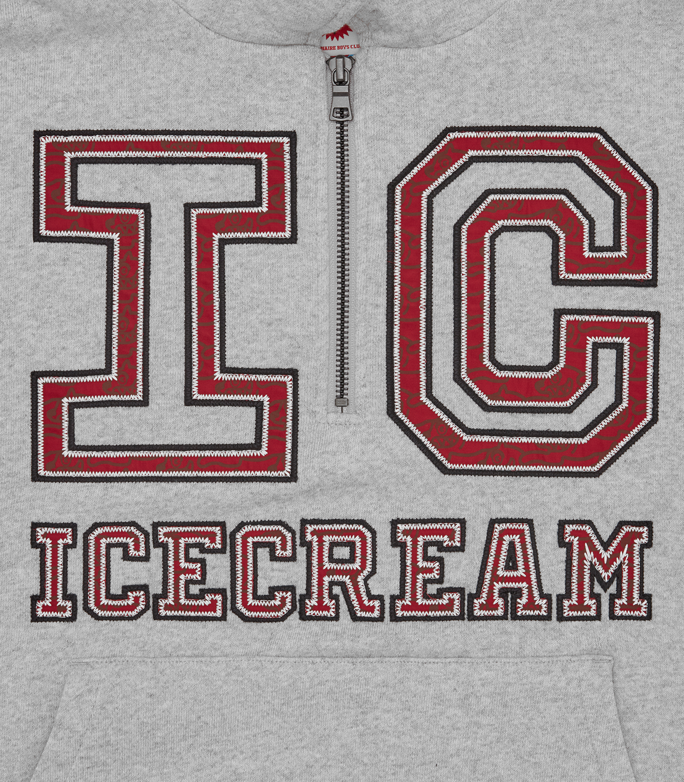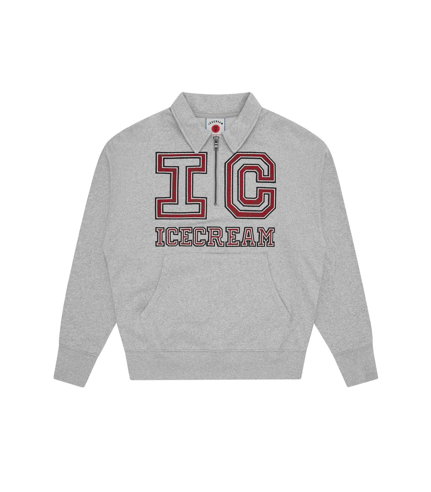 ICECREAM Pre-Fall '25 - This Collegiate Quarter Zip Sweatshirt presents a half zip on the collar and the ICECREAM twill appliqué on the chest.