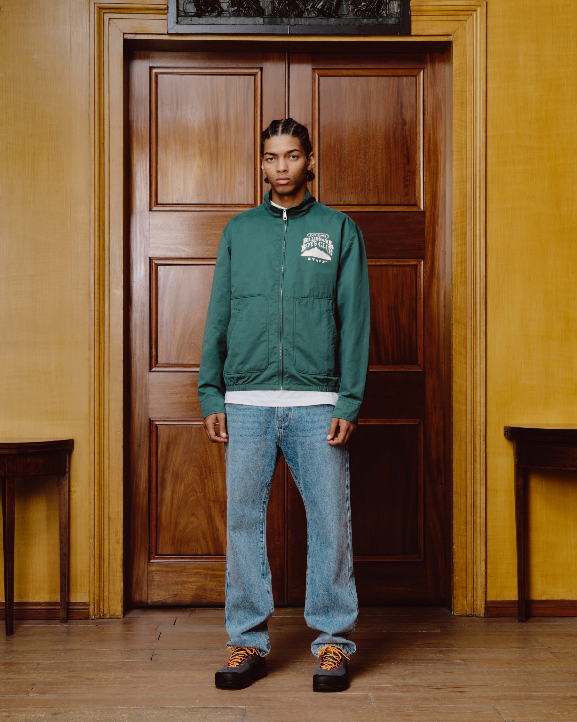 Billionaire Boys Club Pre-Fall '25 - Country Lounge Blouson Jacket presenting the printed Billionaire Boys Club Country Lounge logo on the chest and repeated on the back.