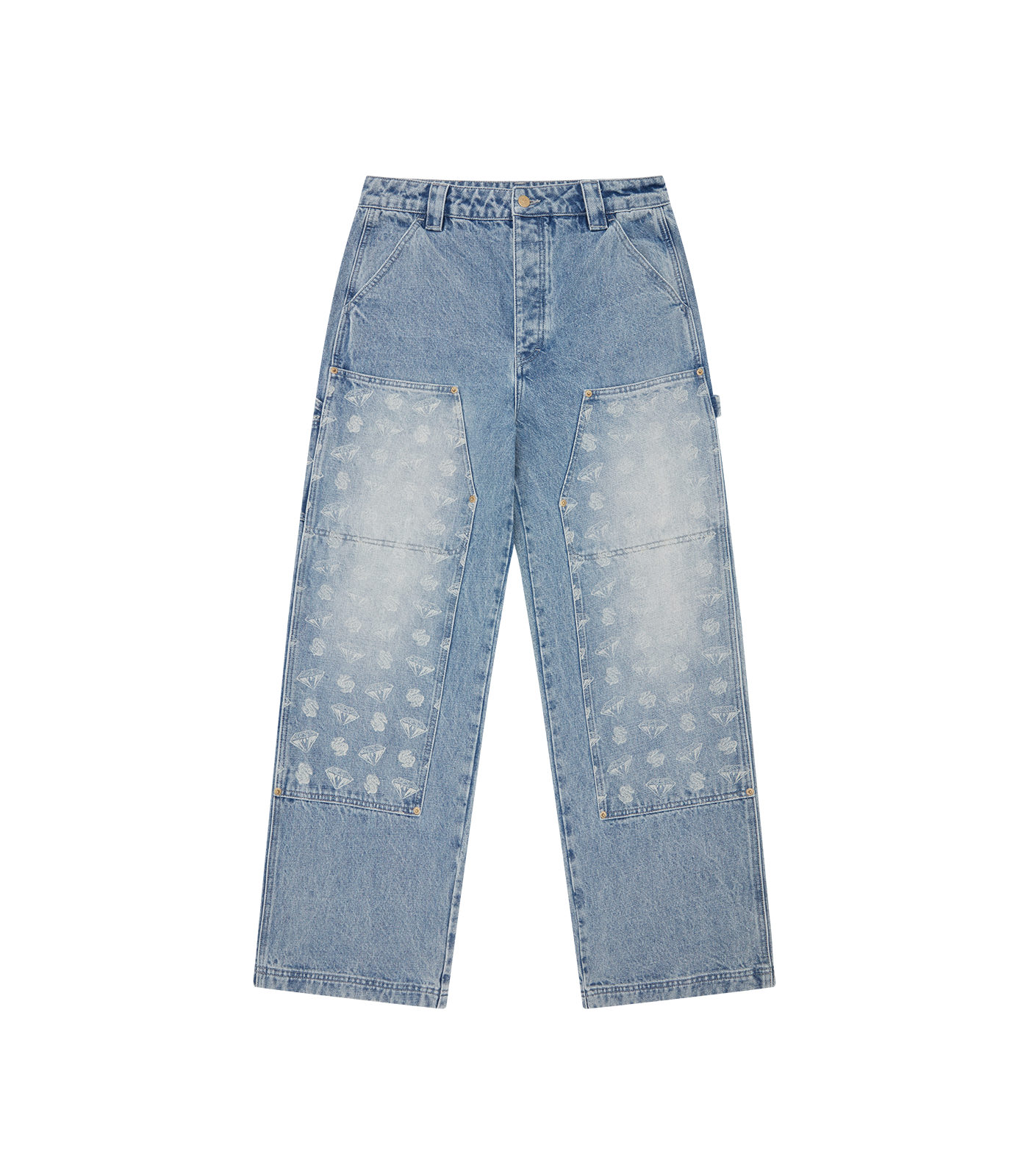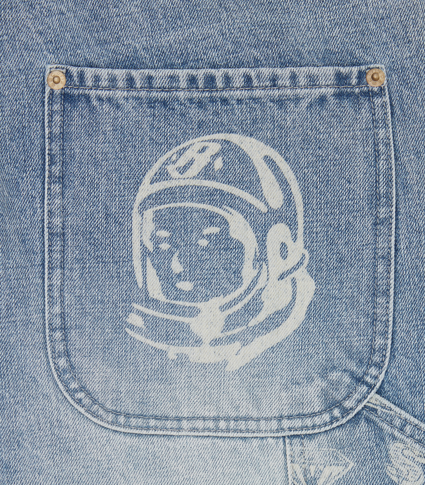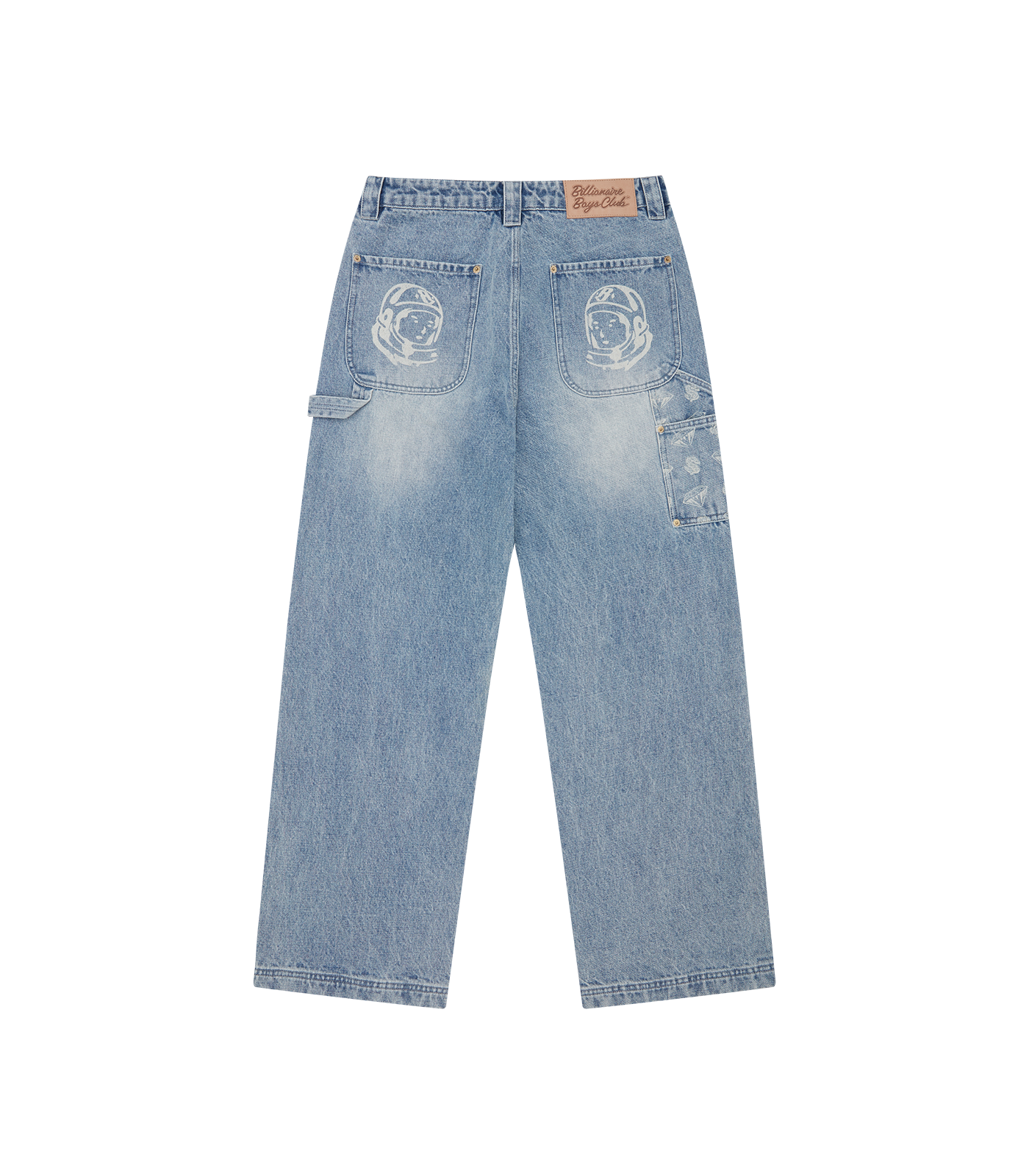 Billionaire Boys Club Fall '25 - Diamonds & Dollars Denim Carpenter Pants in light wash blue present an all-over Diamonds & Dollar print pattern on the front leg panels and the Astro helmet on back pockets.