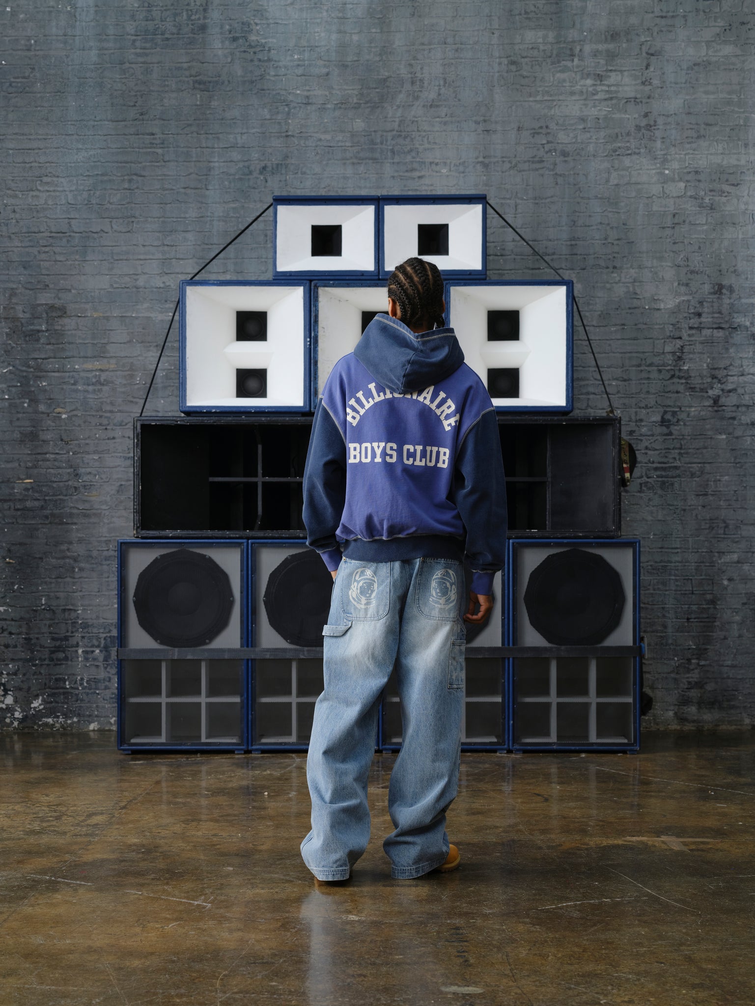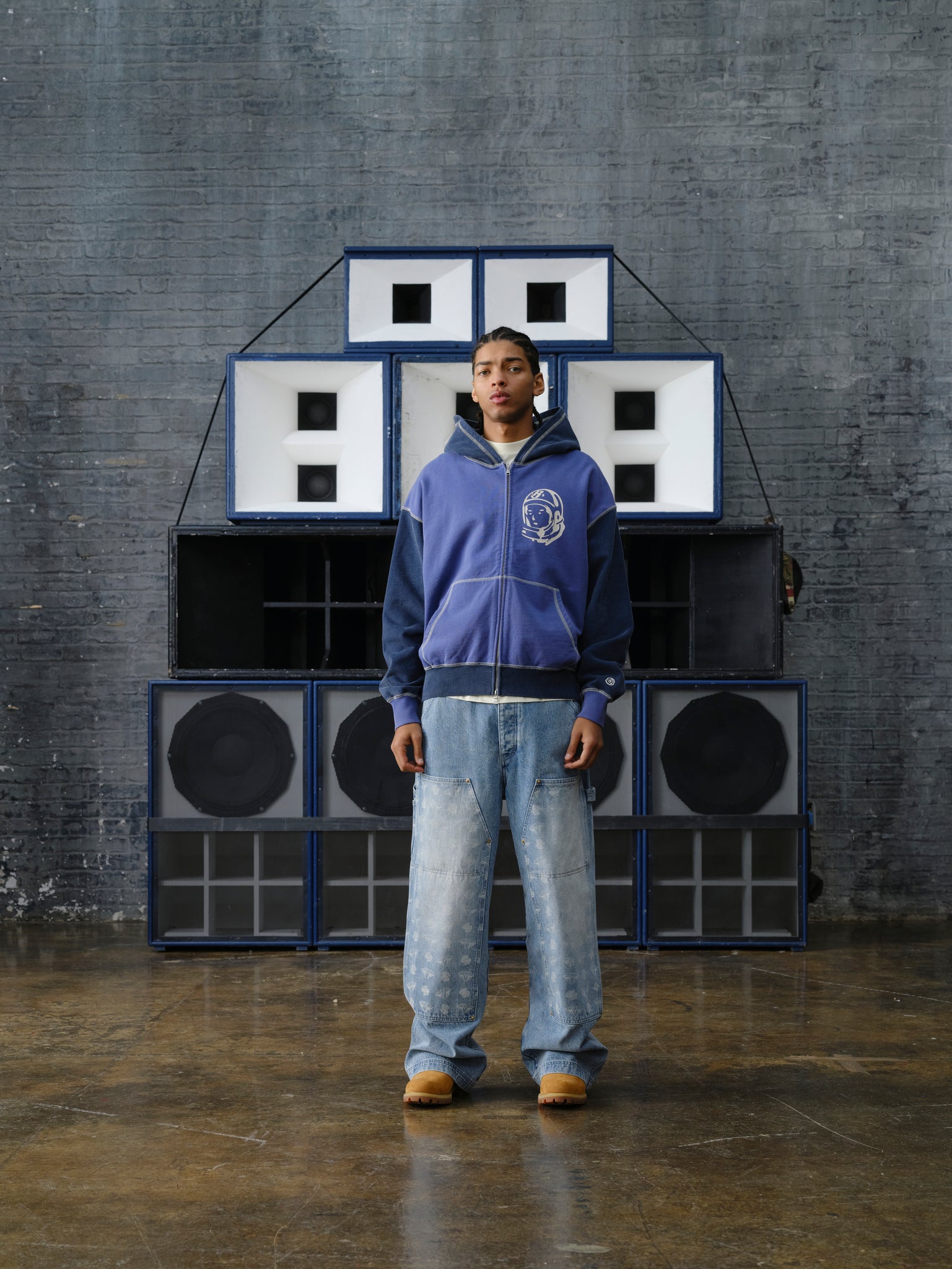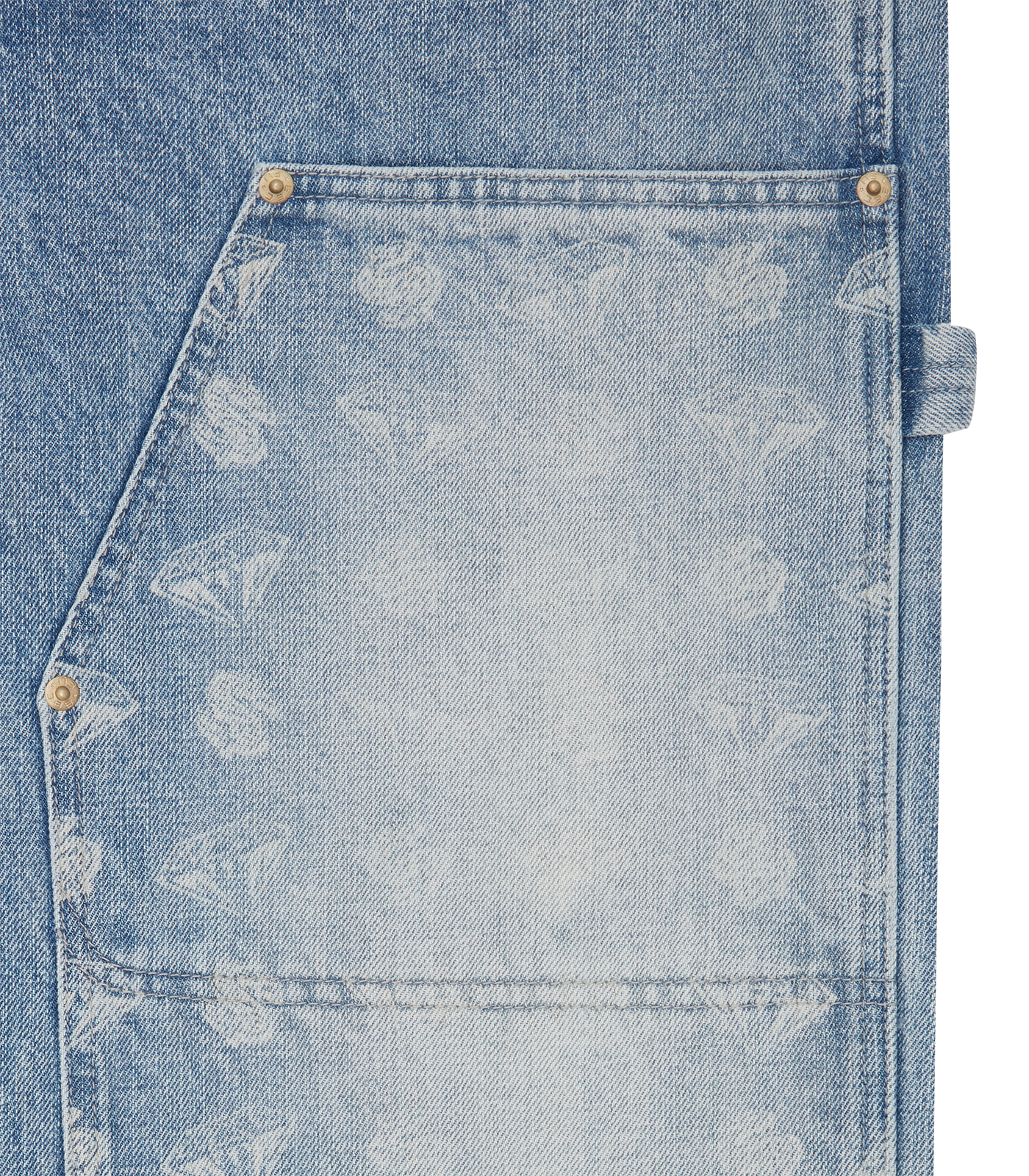 Billionaire Boys Club Fall '25 - Diamonds & Dollars Denim Carpenter Pants in light wash blue present an all-over Diamonds & Dollar print pattern on the front leg panels and the Astro helmet on back pockets.