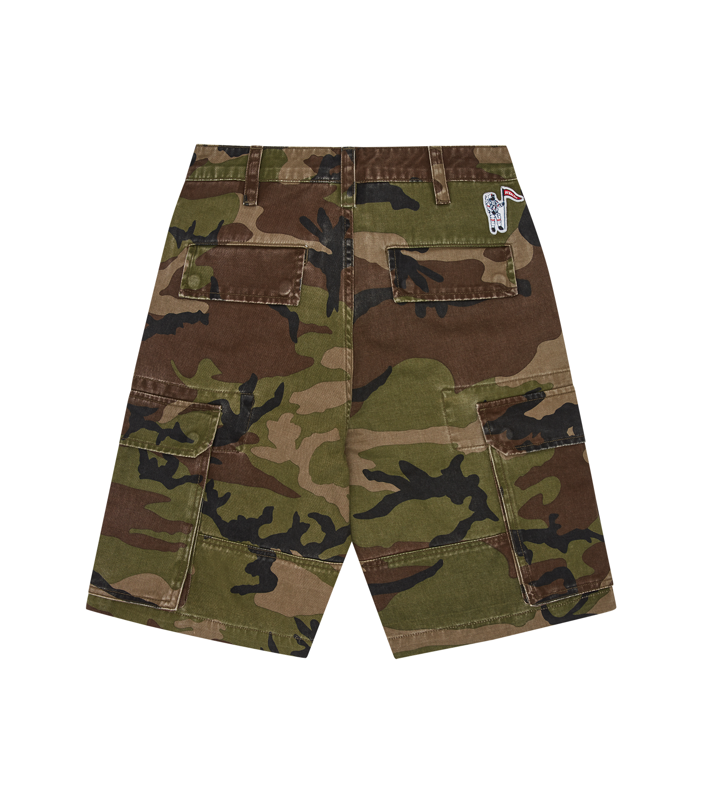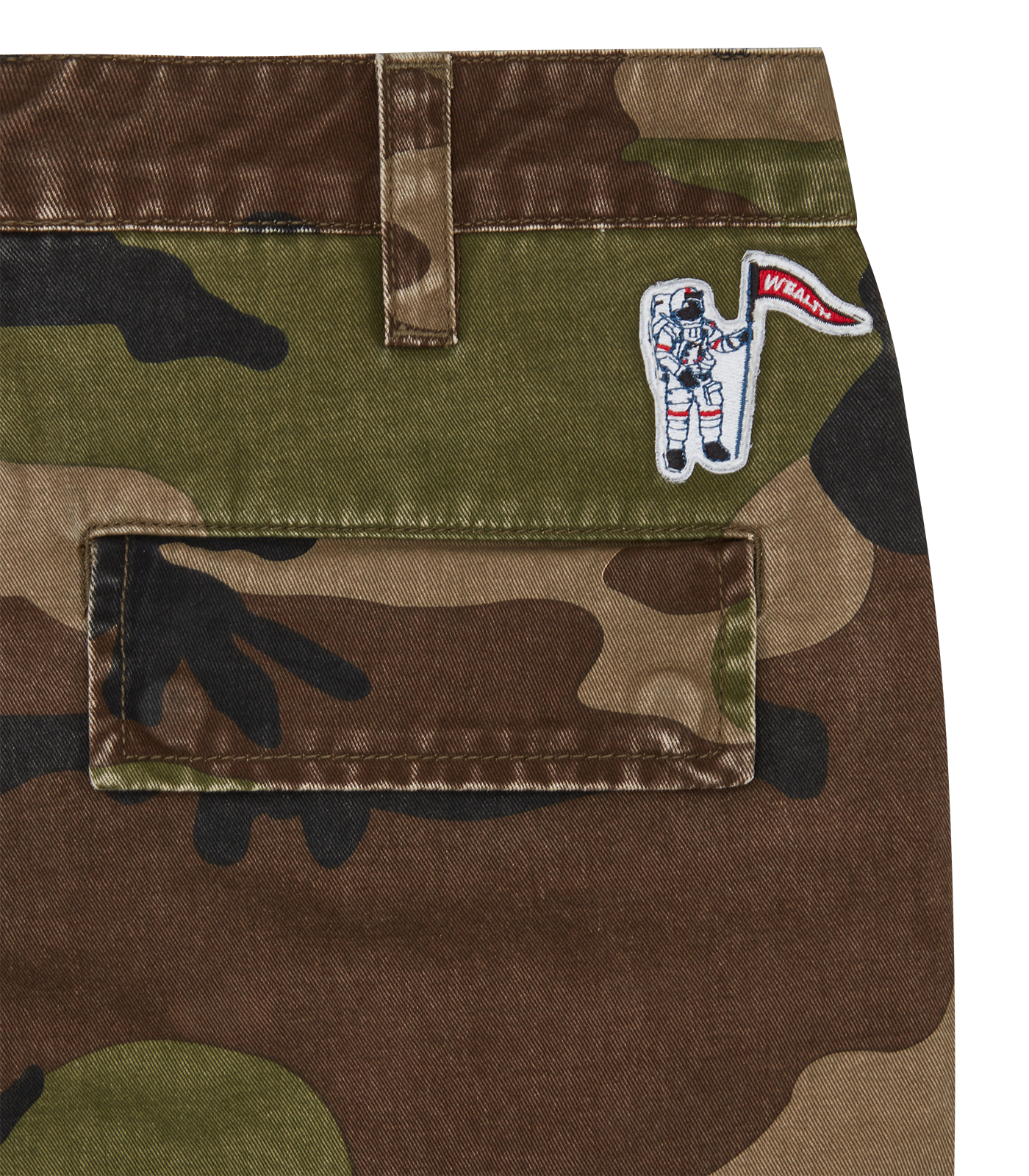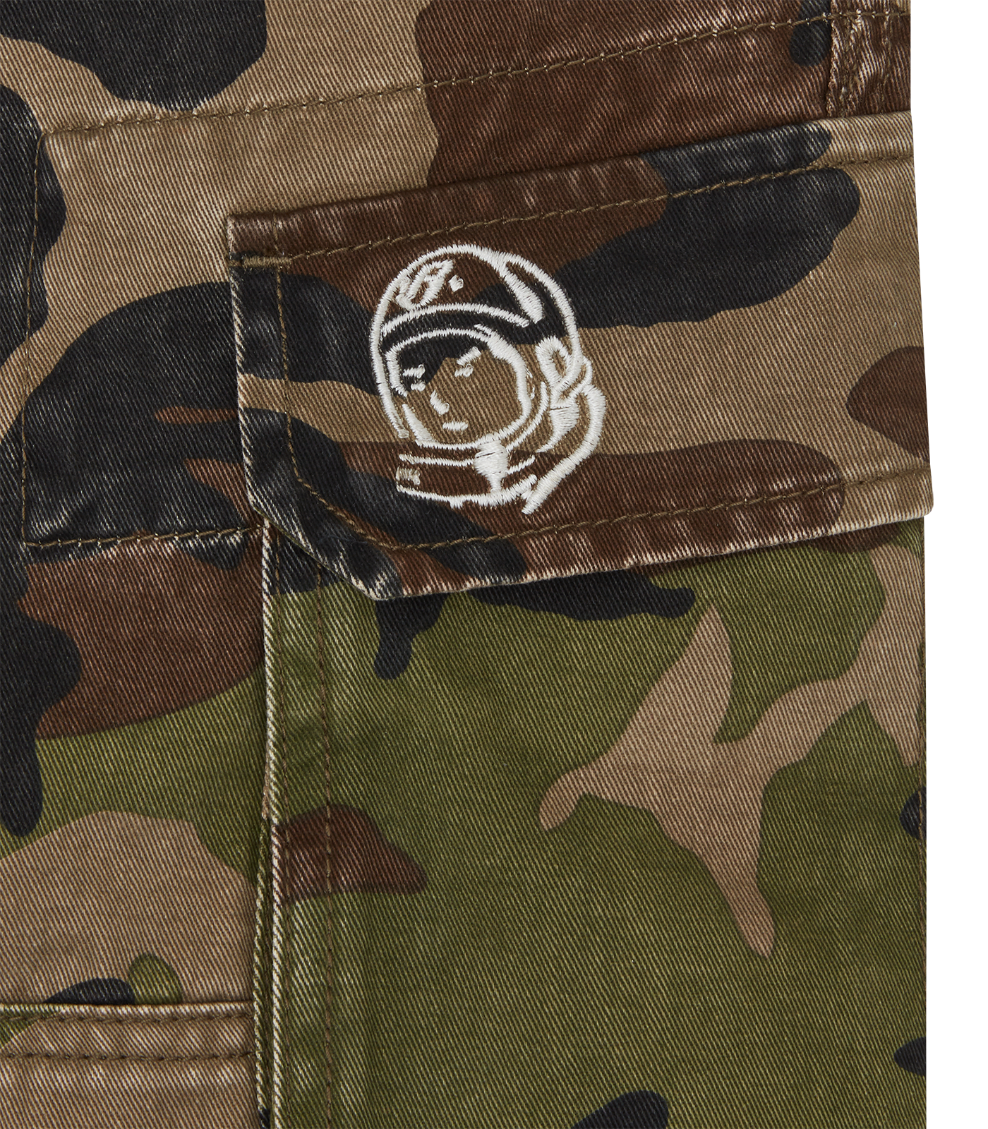 Billionaire Boys Club Pre-Fall '25 - The Distressed Camo Cargo Shorts feature an all-over camo print and the embroidered Astro helmet on the pocket flap.