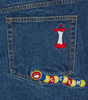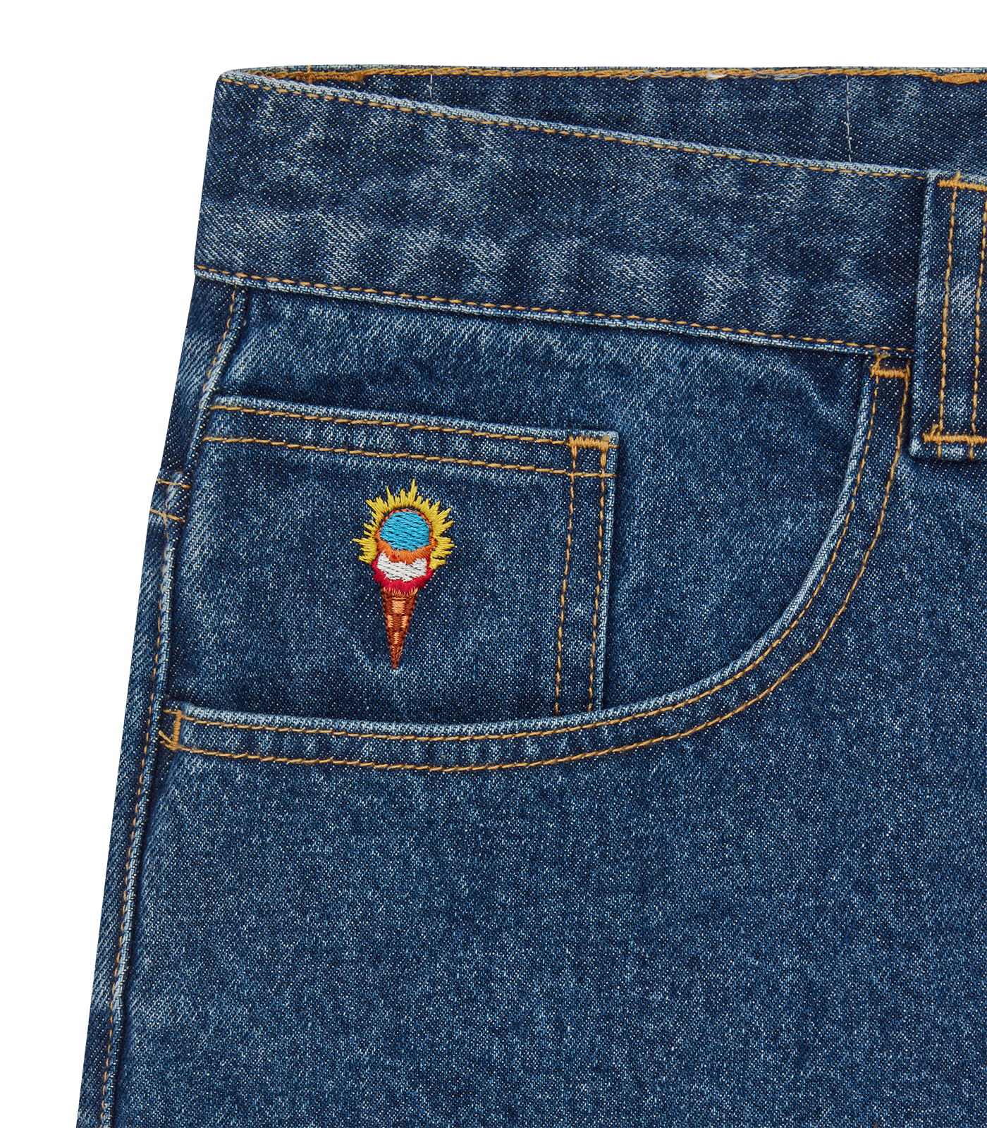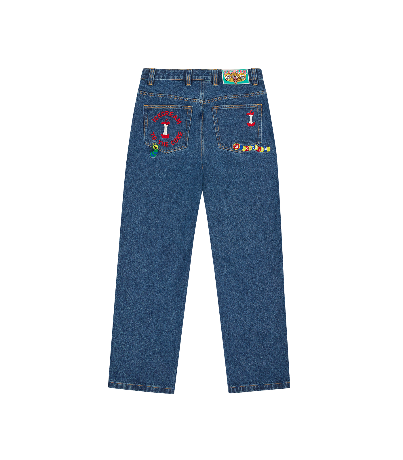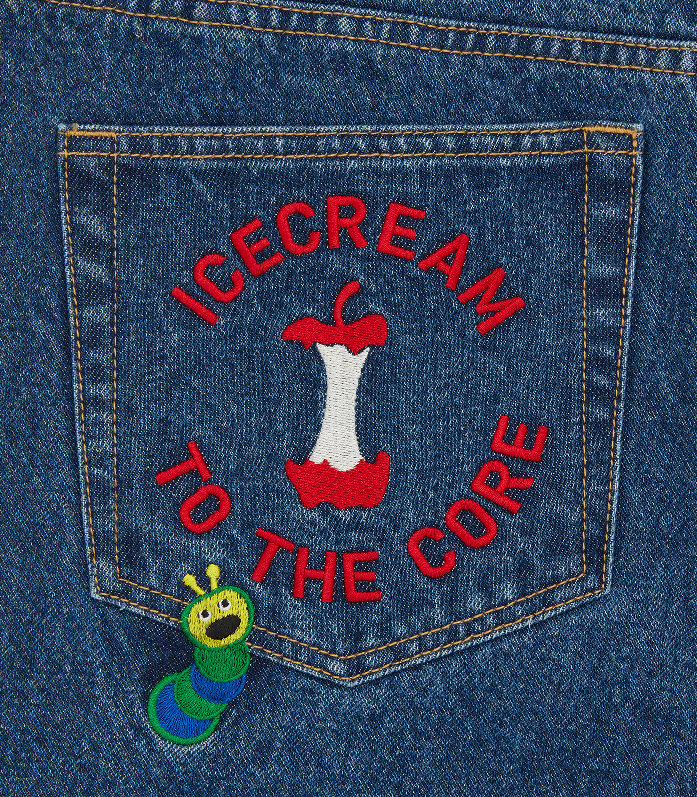 ICECREAM Spring '25 - The Double Scoop Apple Denim Pant presents the embroidered double scoop signet at coin pocket and detailed with the ICECREAM logo and graphics on the back pockets. Zip-fastened fly. Loose fit.