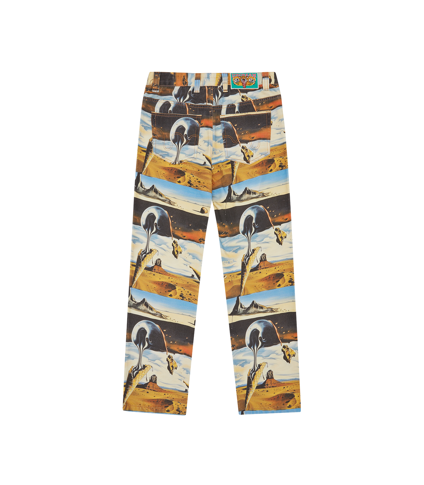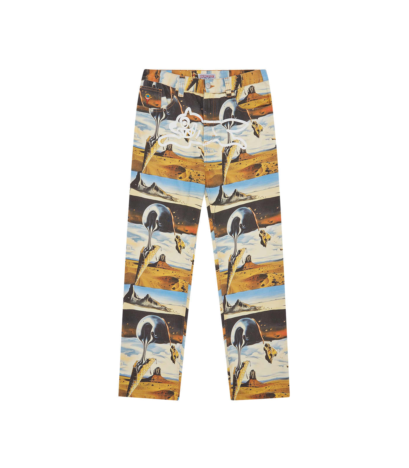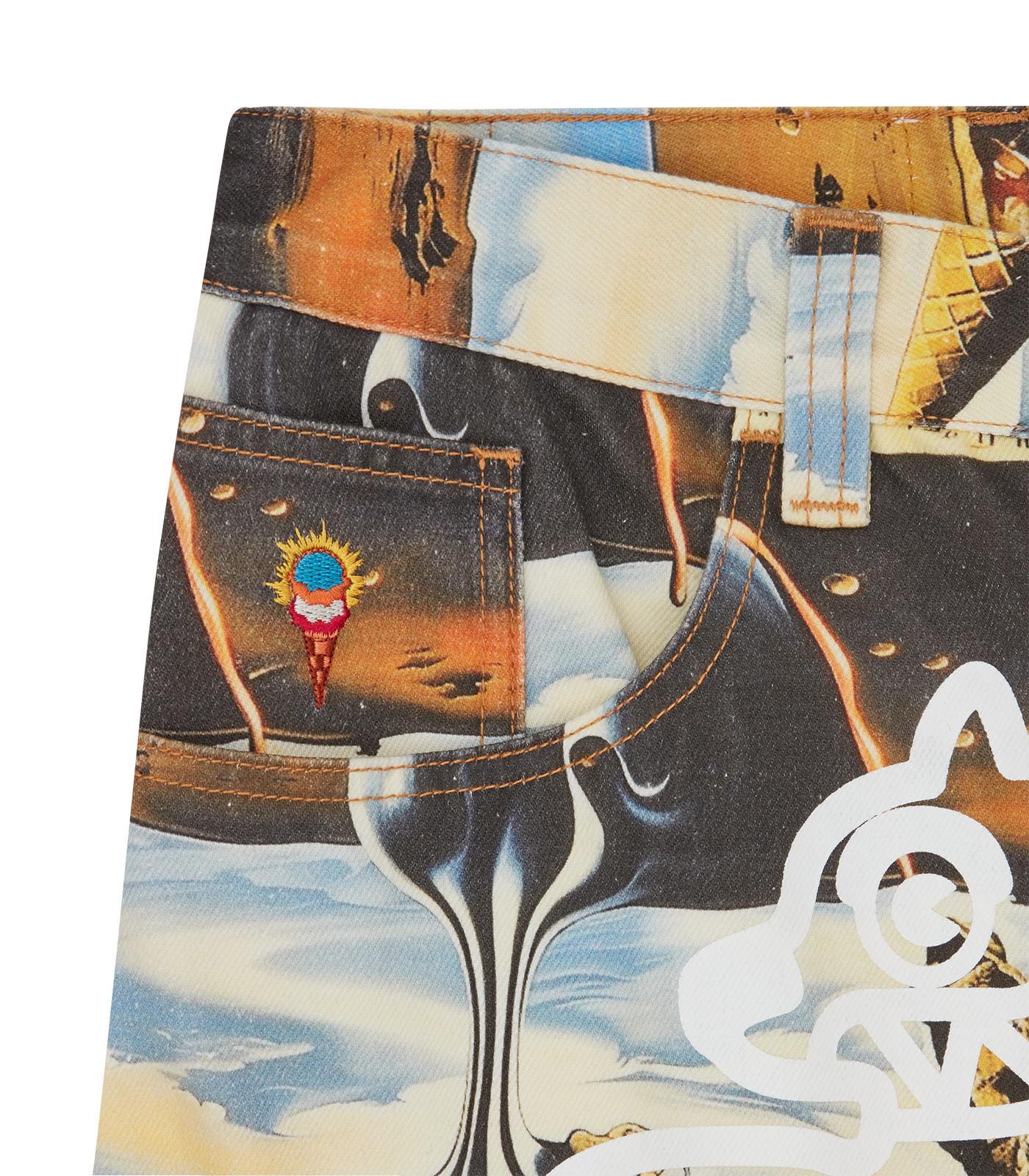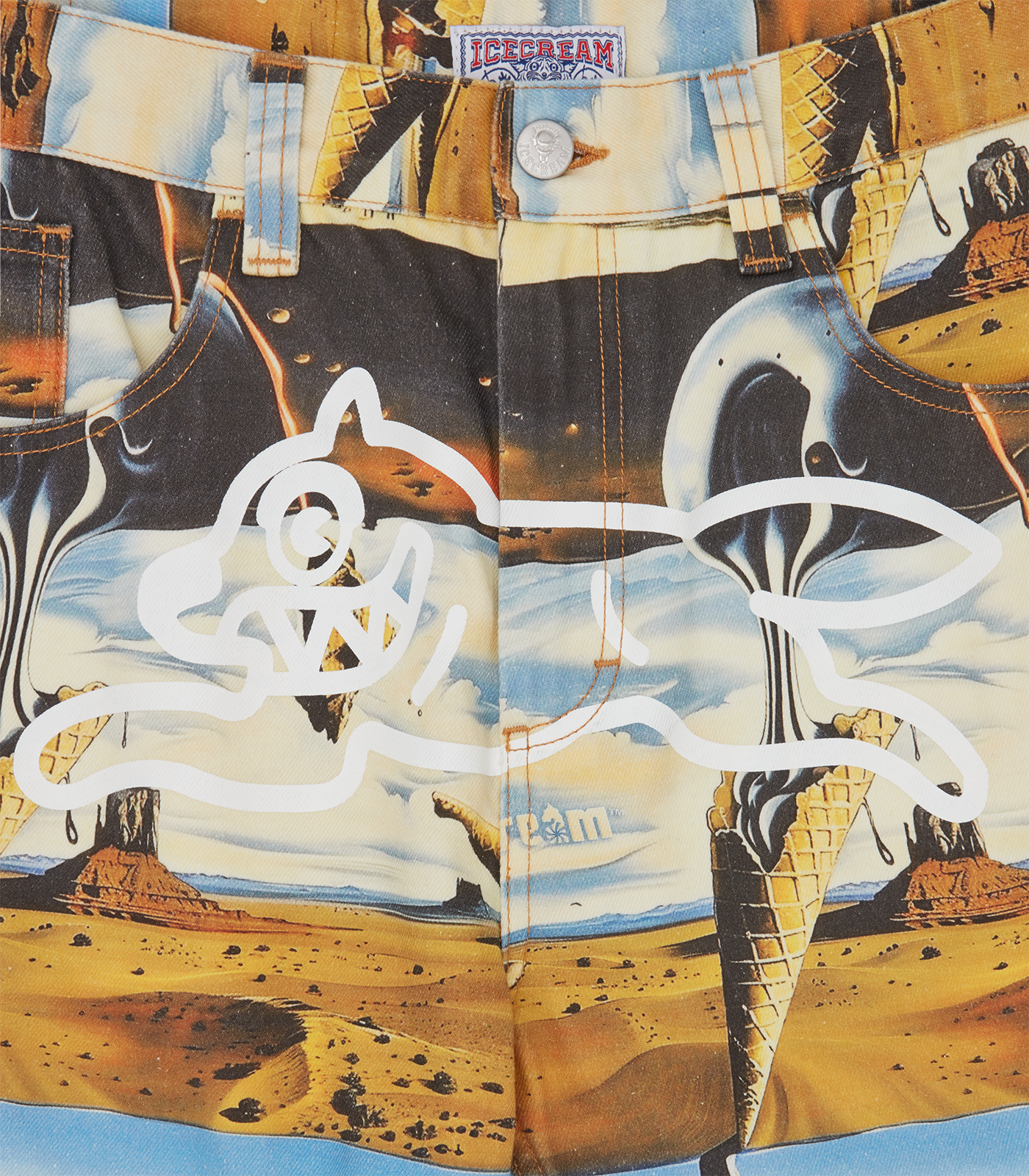 ICECREAM Pre-Fall '25 - Dreamscape Double Scoop Denim Pants, feature an all-over dreamscape graphic and the Running Dog at front. Zip-fastened fly. Loose fit.