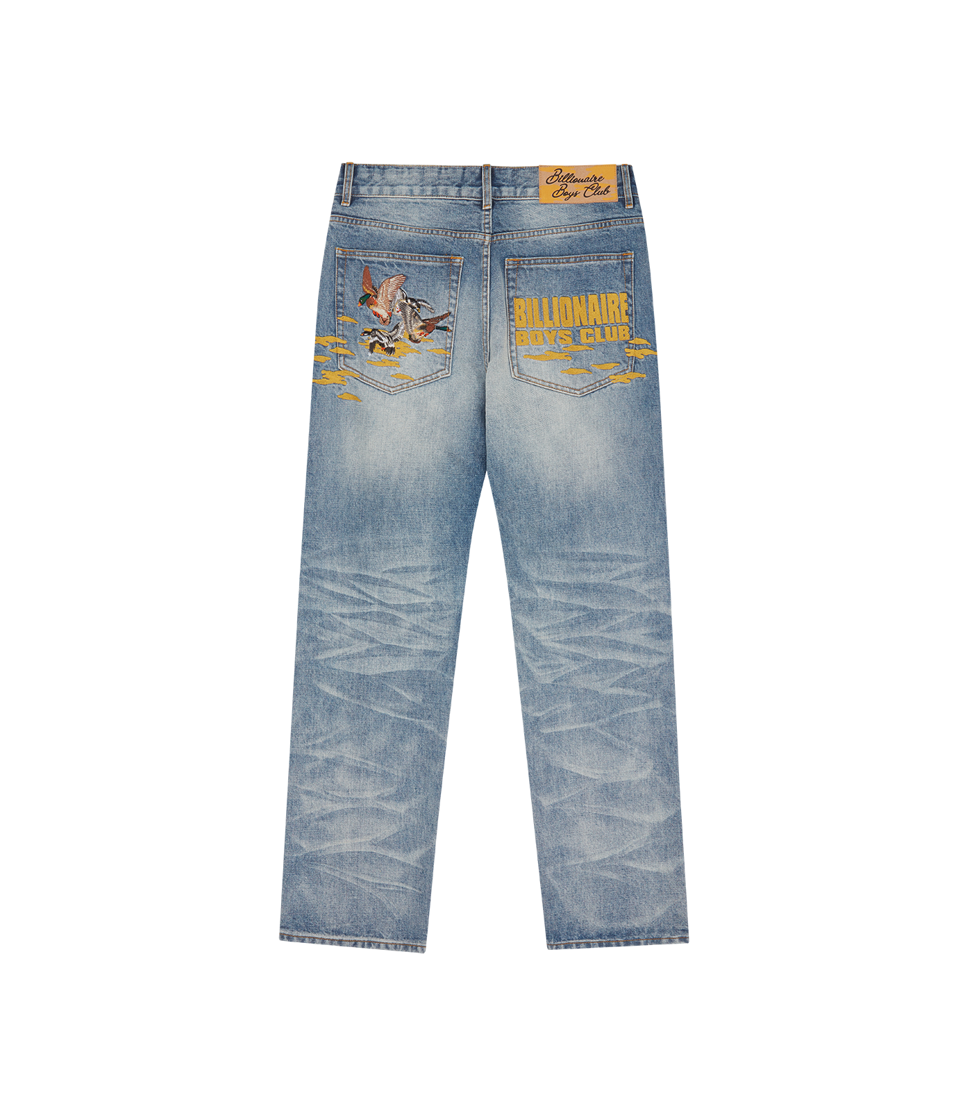 Billionaire Boys Club Pre-Spring '25 - Duck Embroidered Denim Pants in heavy wash blue presents the Billionaire Boys Club embroidered graphics both back pockets. Detailed with embroidered Astro Helmet logo.