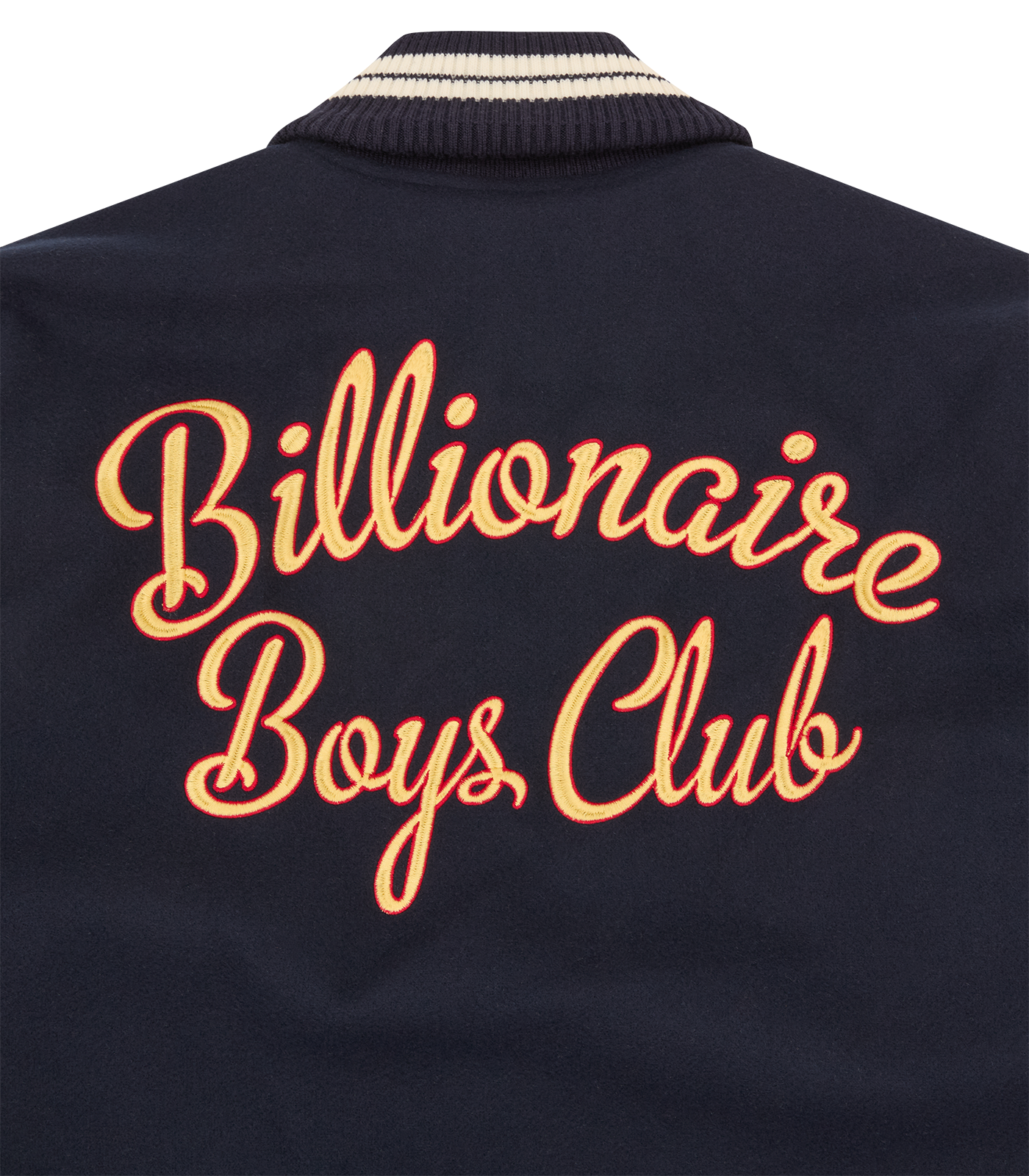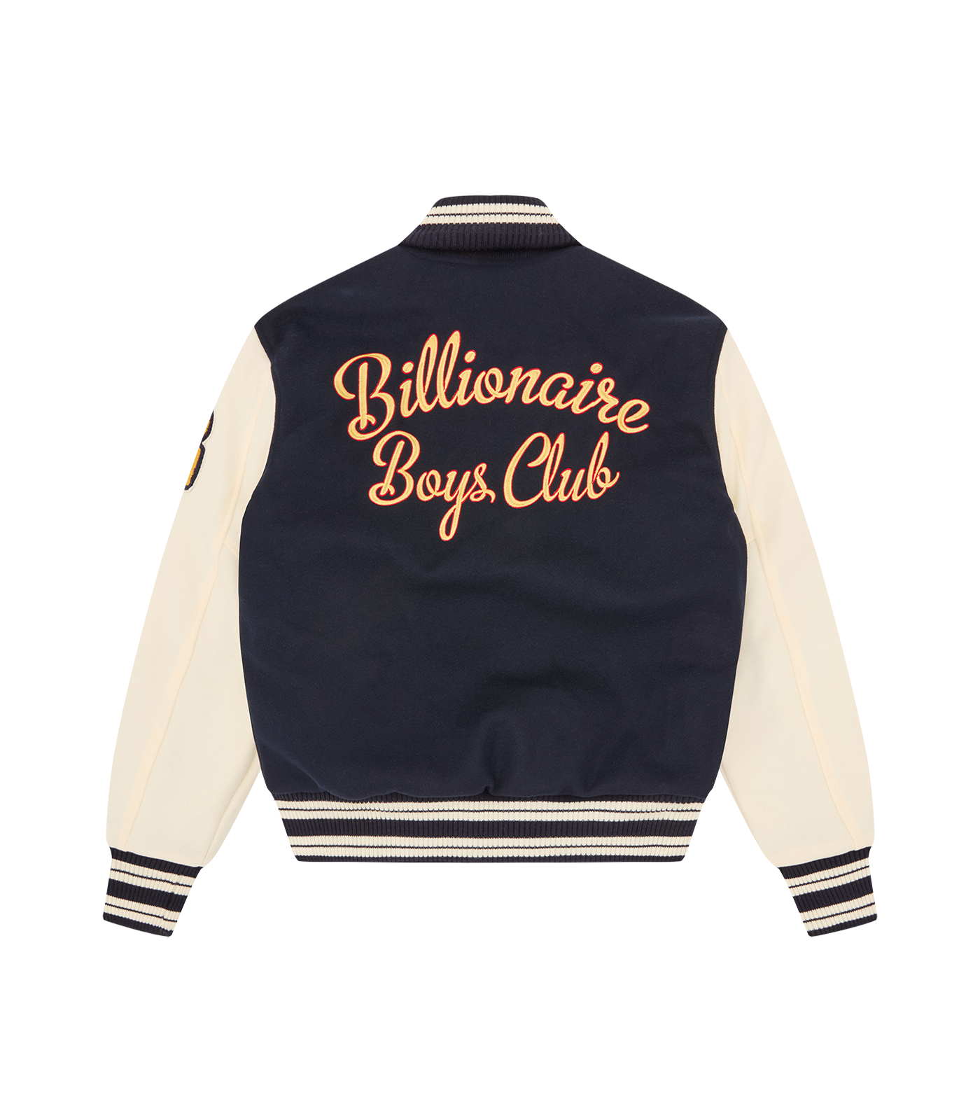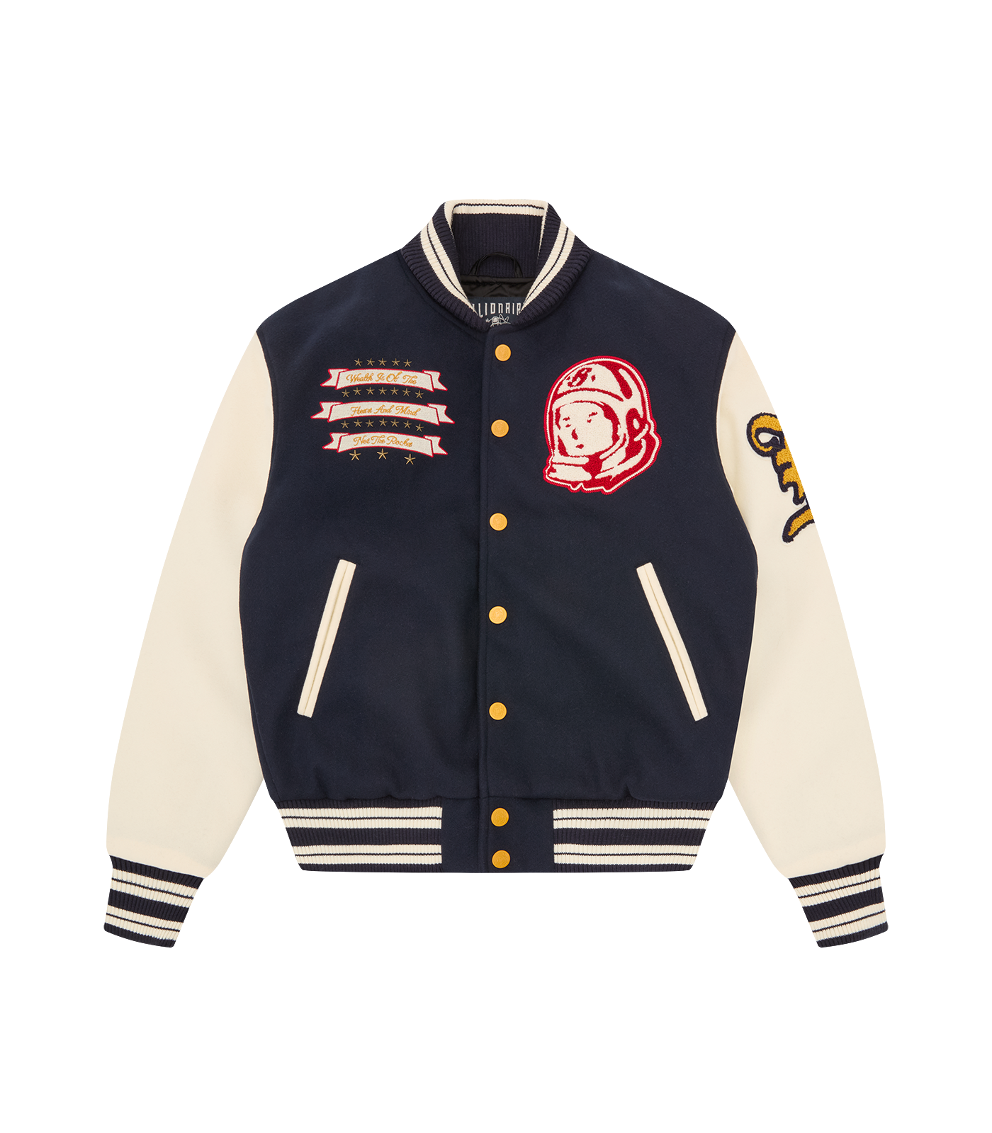 Billionaire Boys Club Pre-Spring '26 - The Fanfare Script Varsity Jacket is shaped like a classic Billionaire Boys Club varsity jacket. It showcases signature Billionaire Boys Club appliqués, including the iconic astronaut emblem and “Wealth is of the Heart and Mind” embroidered across the chest. It is finished with the embroidered Billionaire Boys Club Script logo on the back.