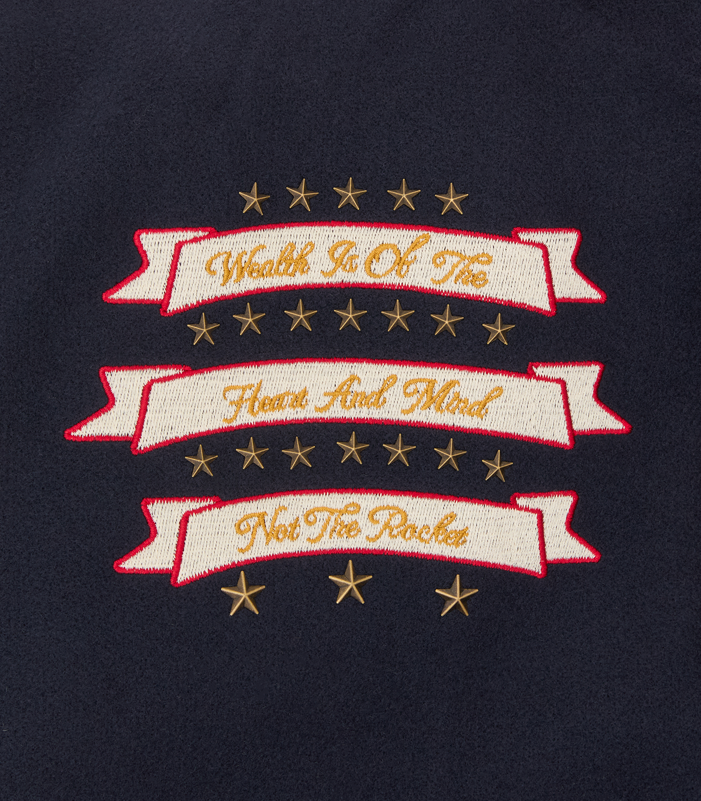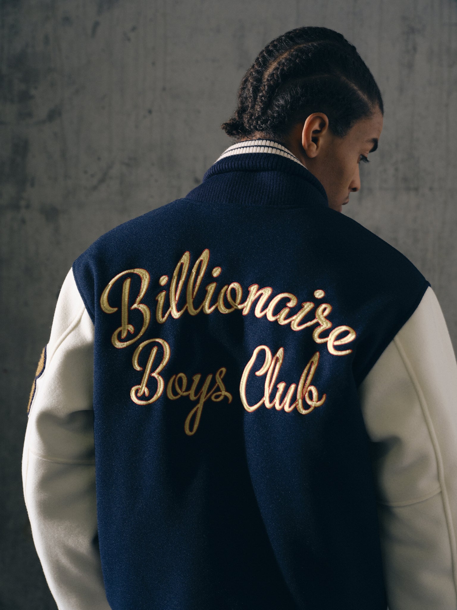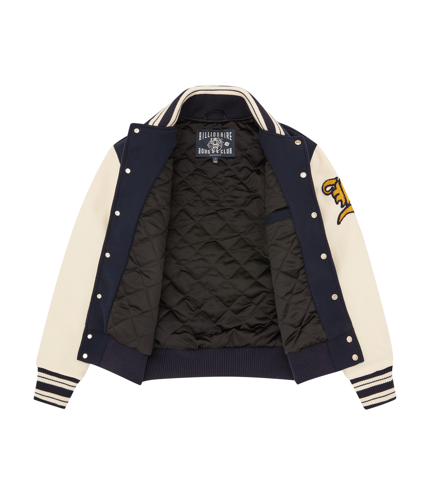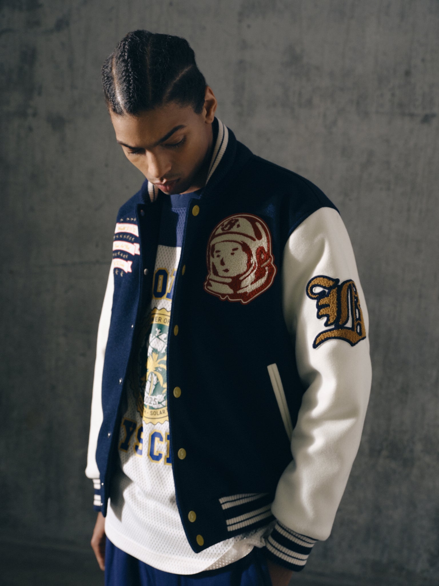 Billionaire Boys Club Pre-Spring '26 - The Fanfare Script Varsity Jacket is shaped like a classic Billionaire Boys Club varsity jacket. It showcases signature Billionaire Boys Club appliqués, including the iconic astronaut emblem and “Wealth is of the Heart and Mind” embroidered across the chest. It is finished with the embroidered Billionaire Boys Club Script logo on the back.