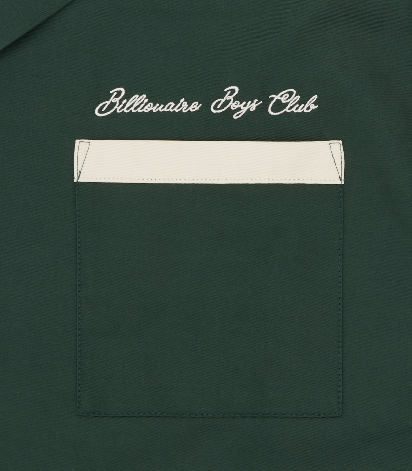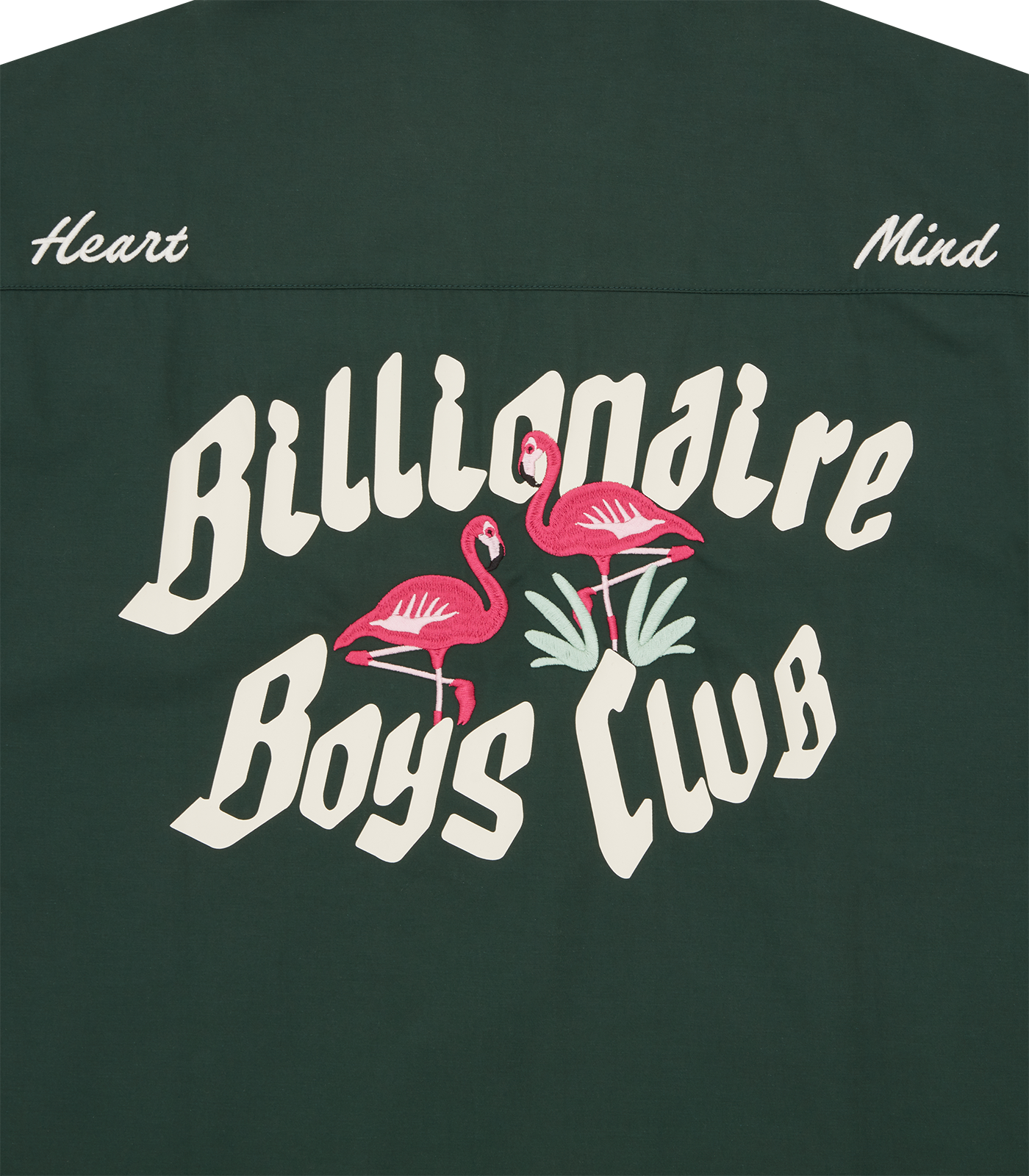 Billionaire Boys Club Pre-Fall '25 - Flamingo Bowling Shirt featuring a direct Billionaire Boys Club logo embroidery on the chest pocket and on back yoke. It is completed with a printed flamingo graphic on the back.
