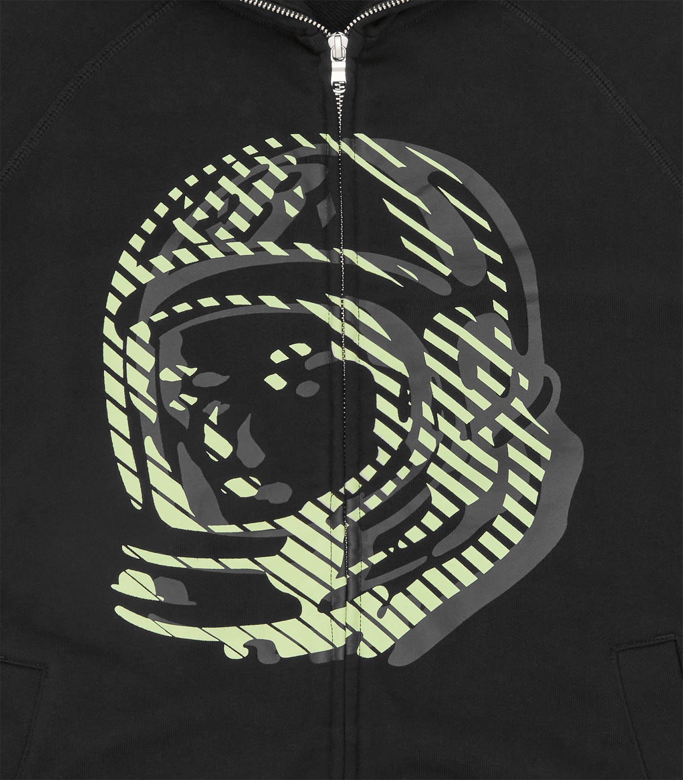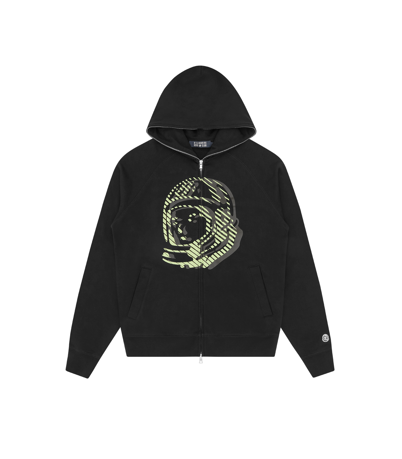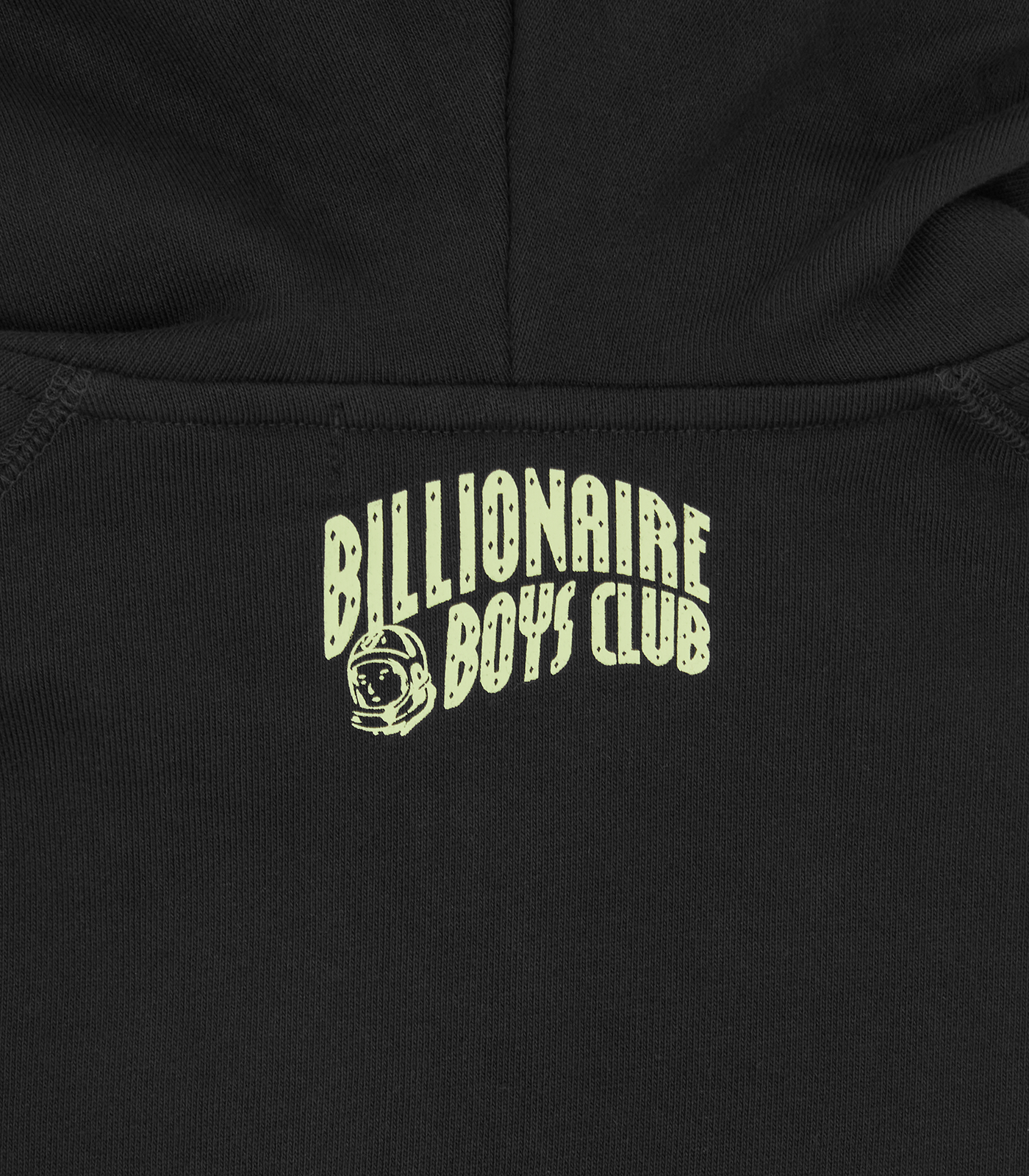 Billionaire Boys Club Pre-Spring '26 - The Glow Astro Zip Through Hood features the Astro helmet astronaut at front and the iconic Billionaire Boys Club Arch logo at back neck with a glow-in-the-dark effect.