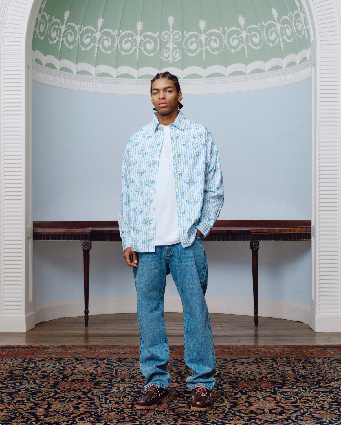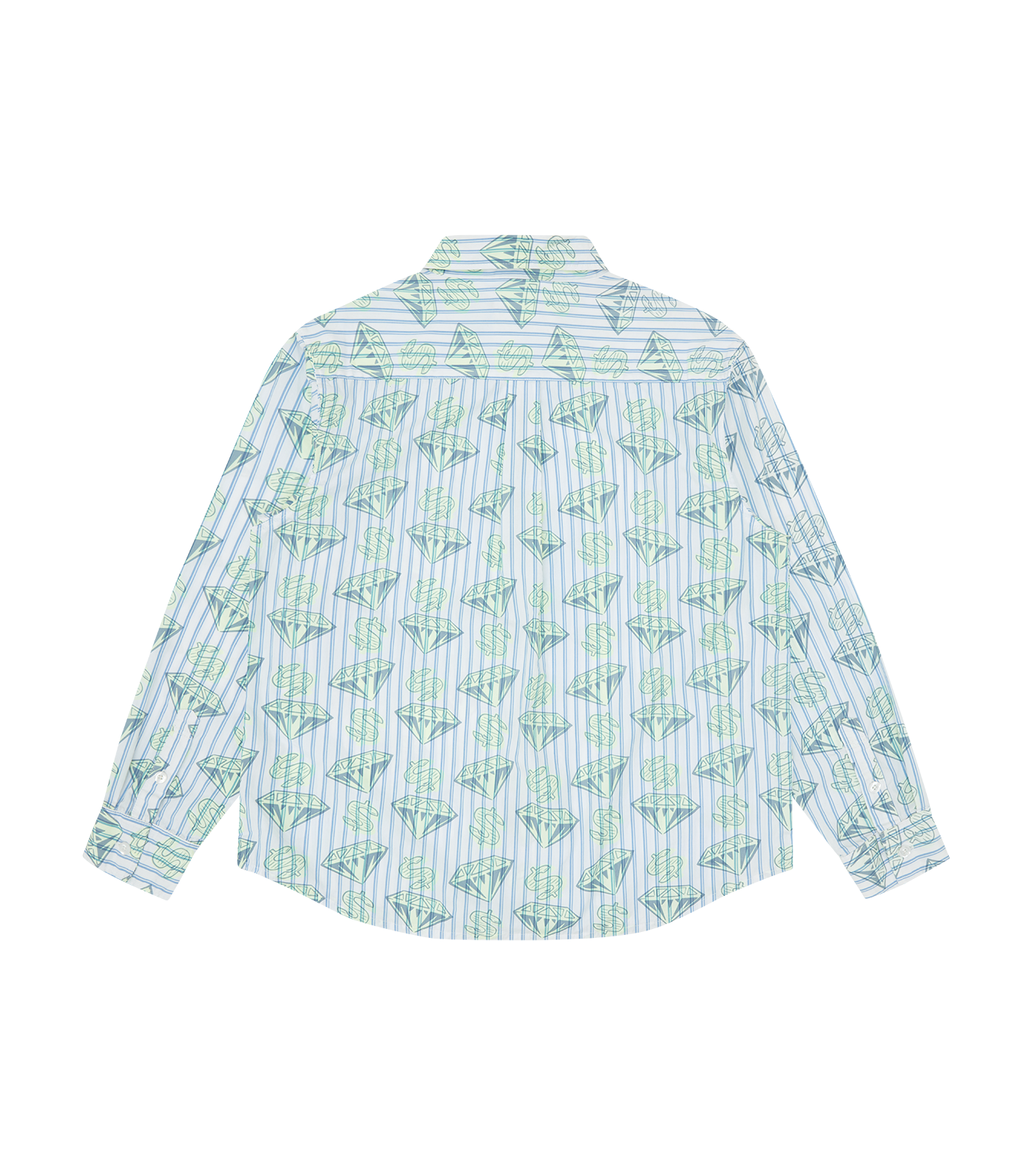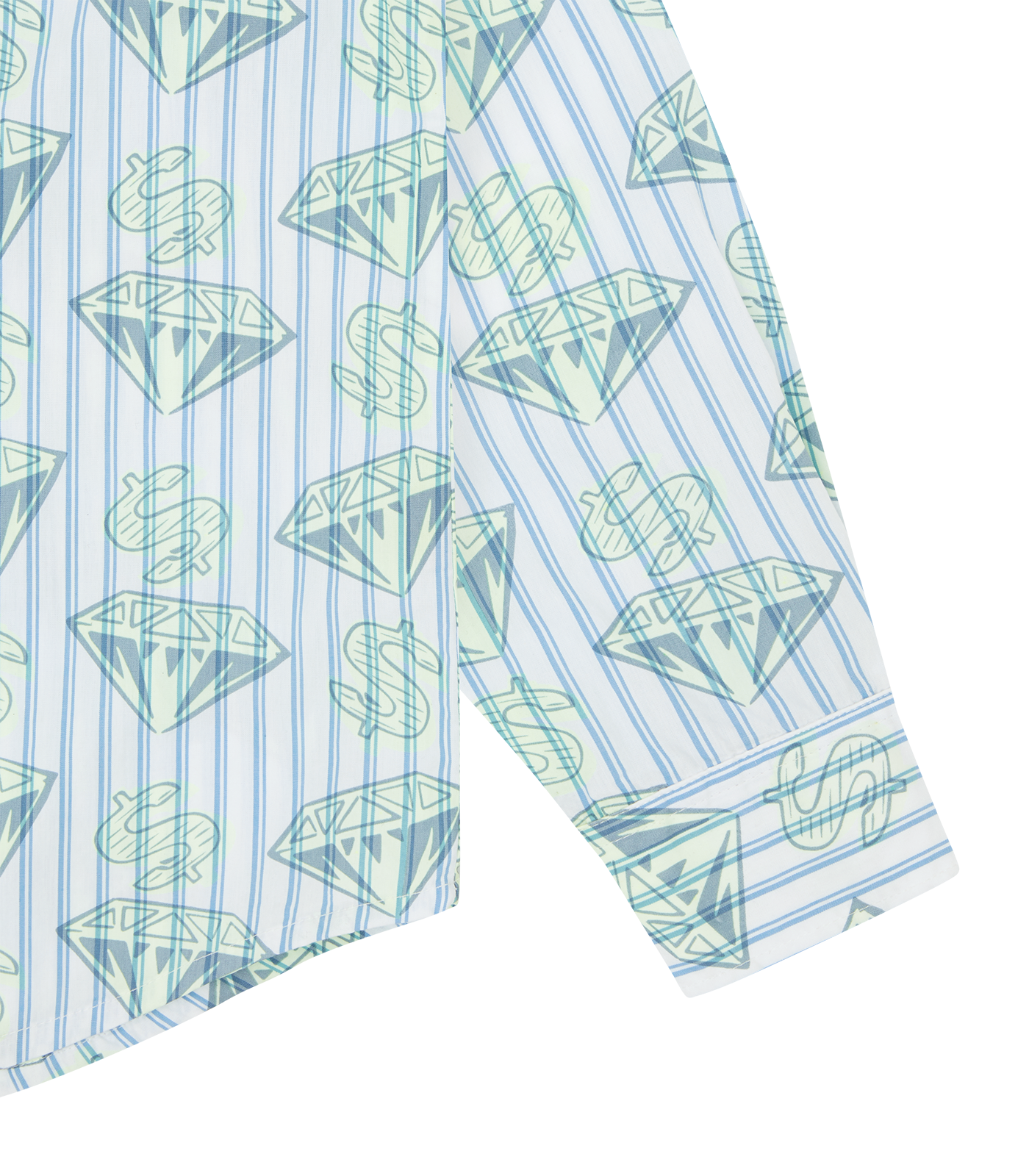 Billionaire Boys Club Pre-Fall '25 - This Glow in the dark Diamonds & Dollar Striped Shirt presents an all-over glow in the dark Diamonds & Dollars print on striped 100% cotton fabric.