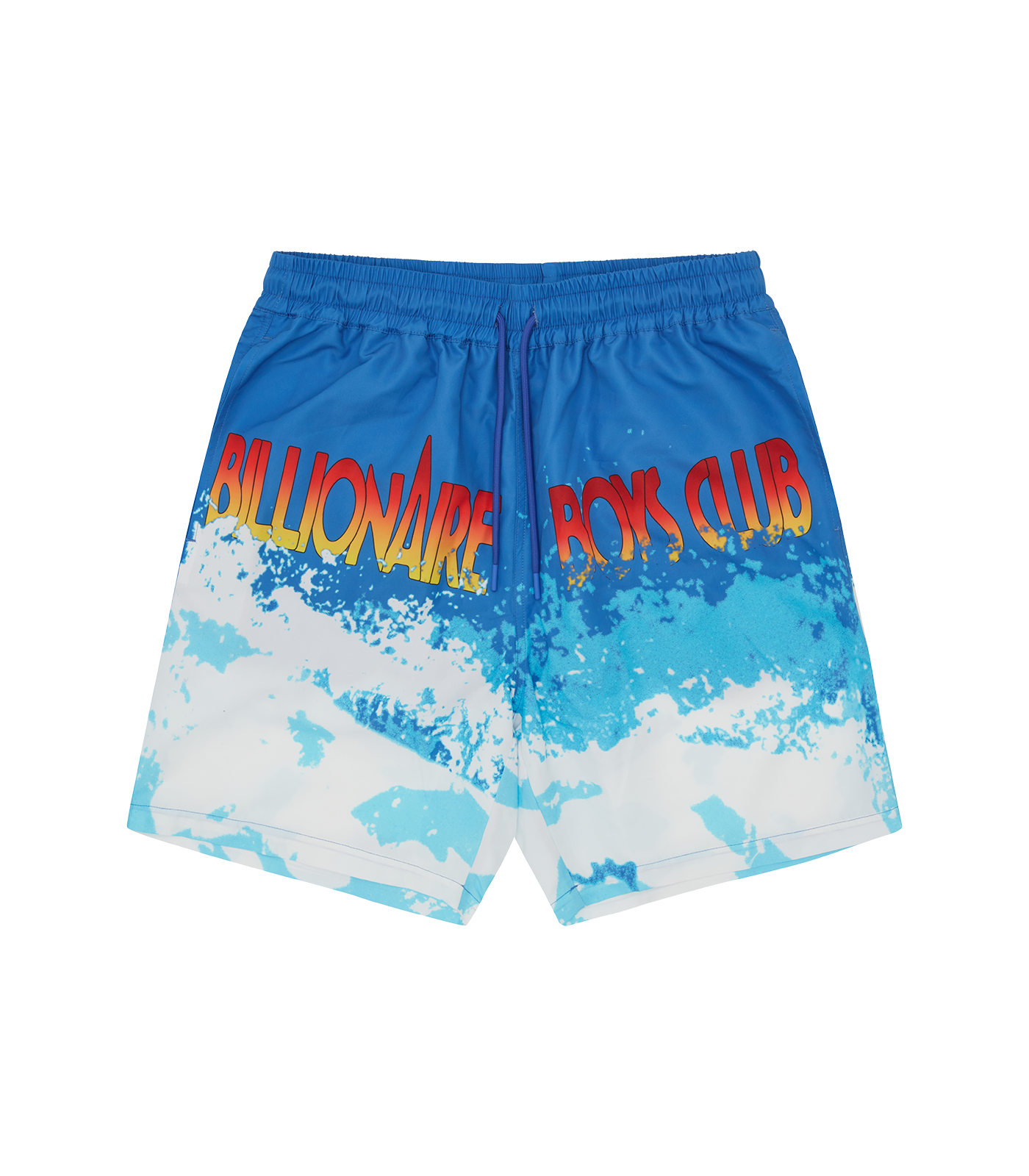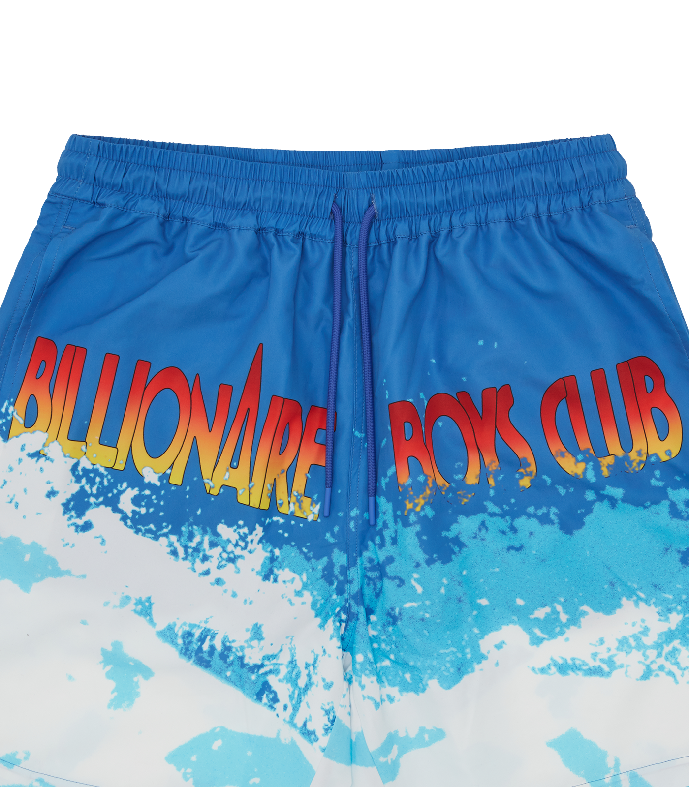 Billionaire Boys Club Pre-Fall '25 - The Great Wave Swimshorts present an all-over digital wave graphic and the Billionaire Boys Club logo on the front.