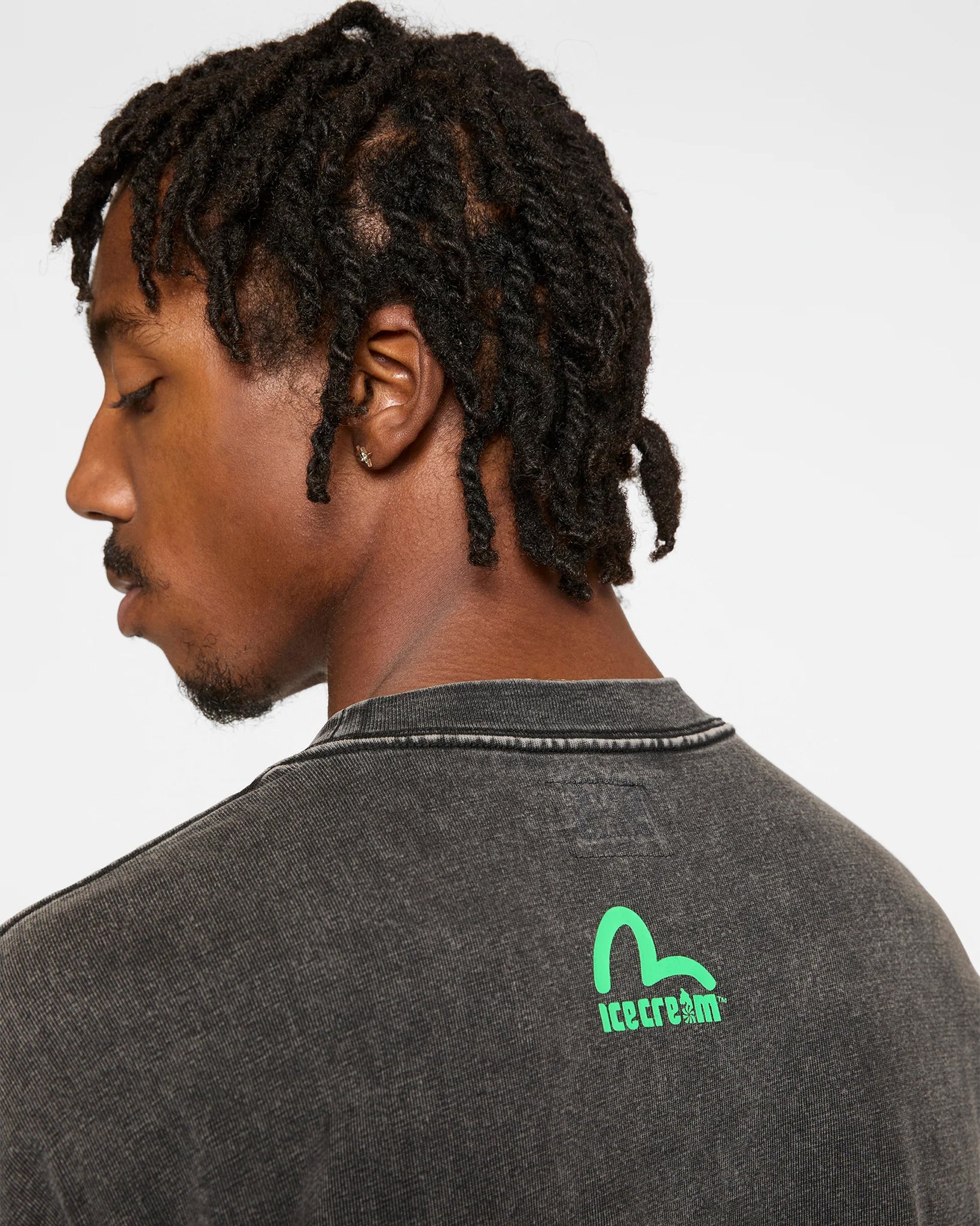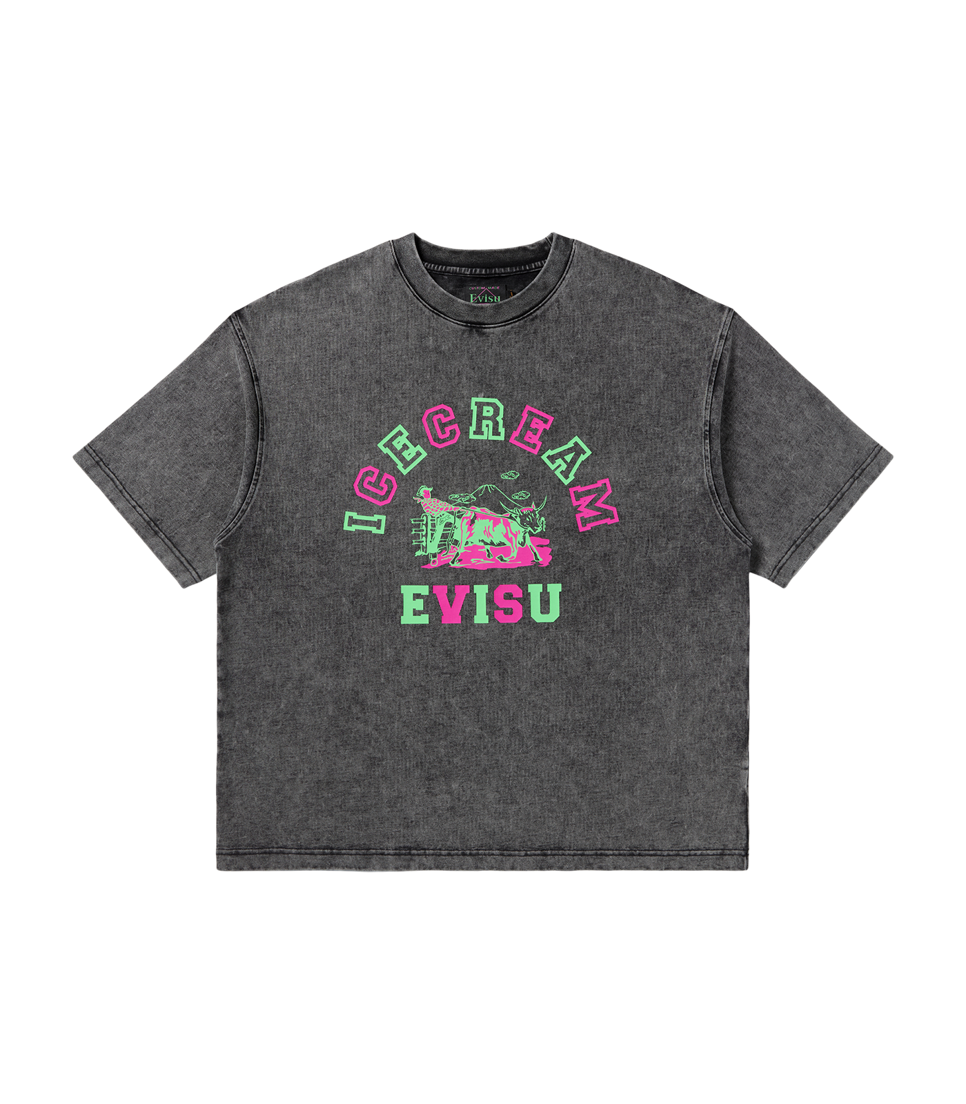 EVISU X ICECREAM - An oversized short sleeve tee featuring the ICECREAM x EVISU printed graphic, celebrating the collaboration’s fusion of streetwear heritage and Japanese denim culture. Crafted from 16S/1 100% cotton jersey for a premium feel and structured drape.