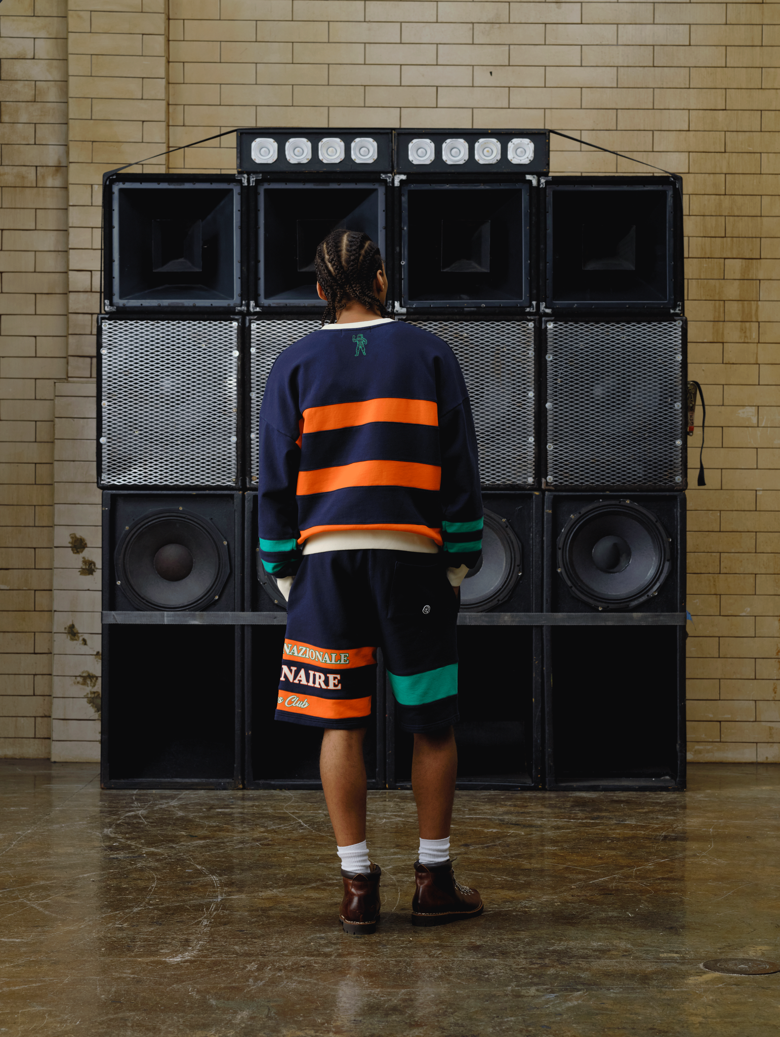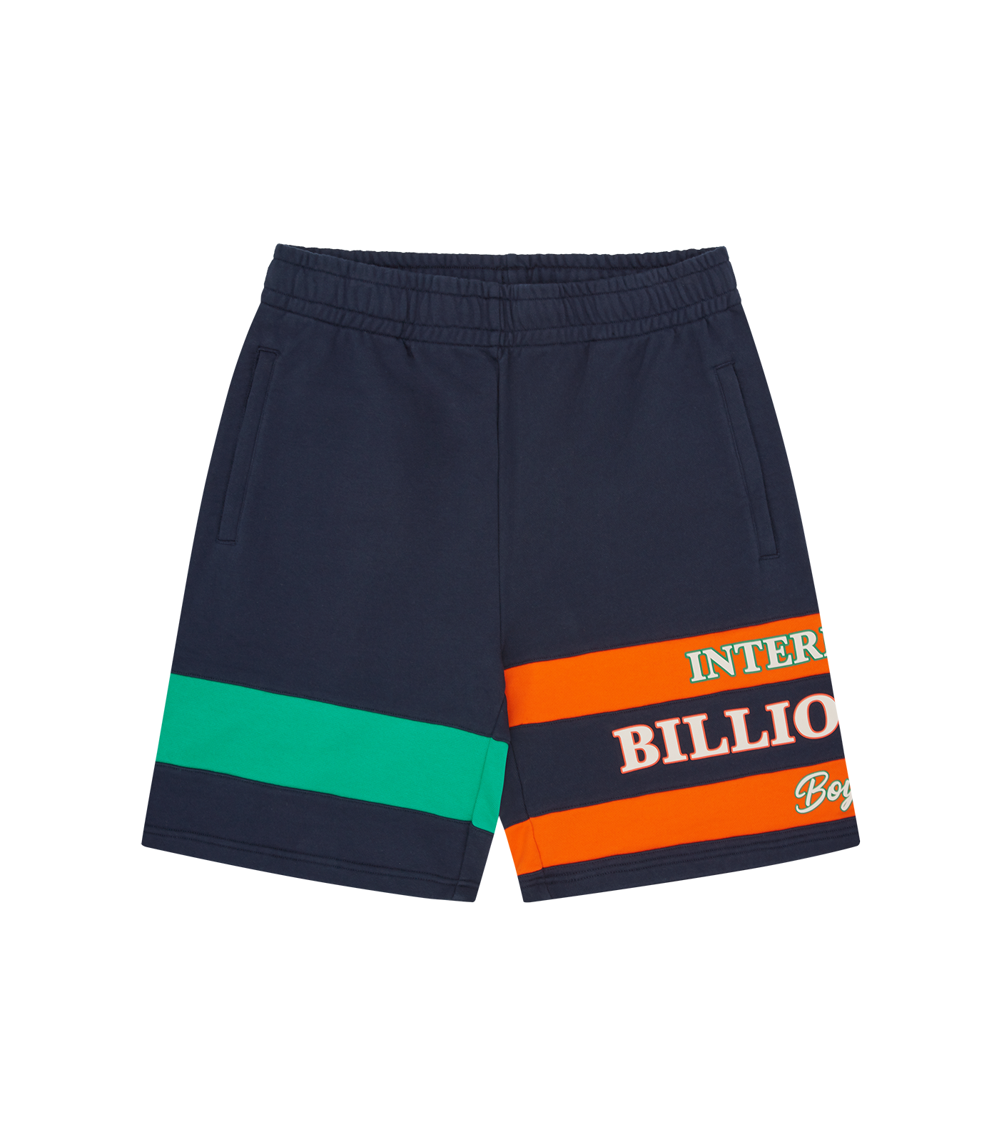 Billionaire Boys Club Fall '25 - Internazionale Panelled Sweatshorts featuring the Billionaire Boys Club logo with decorative stripes on the thigh.