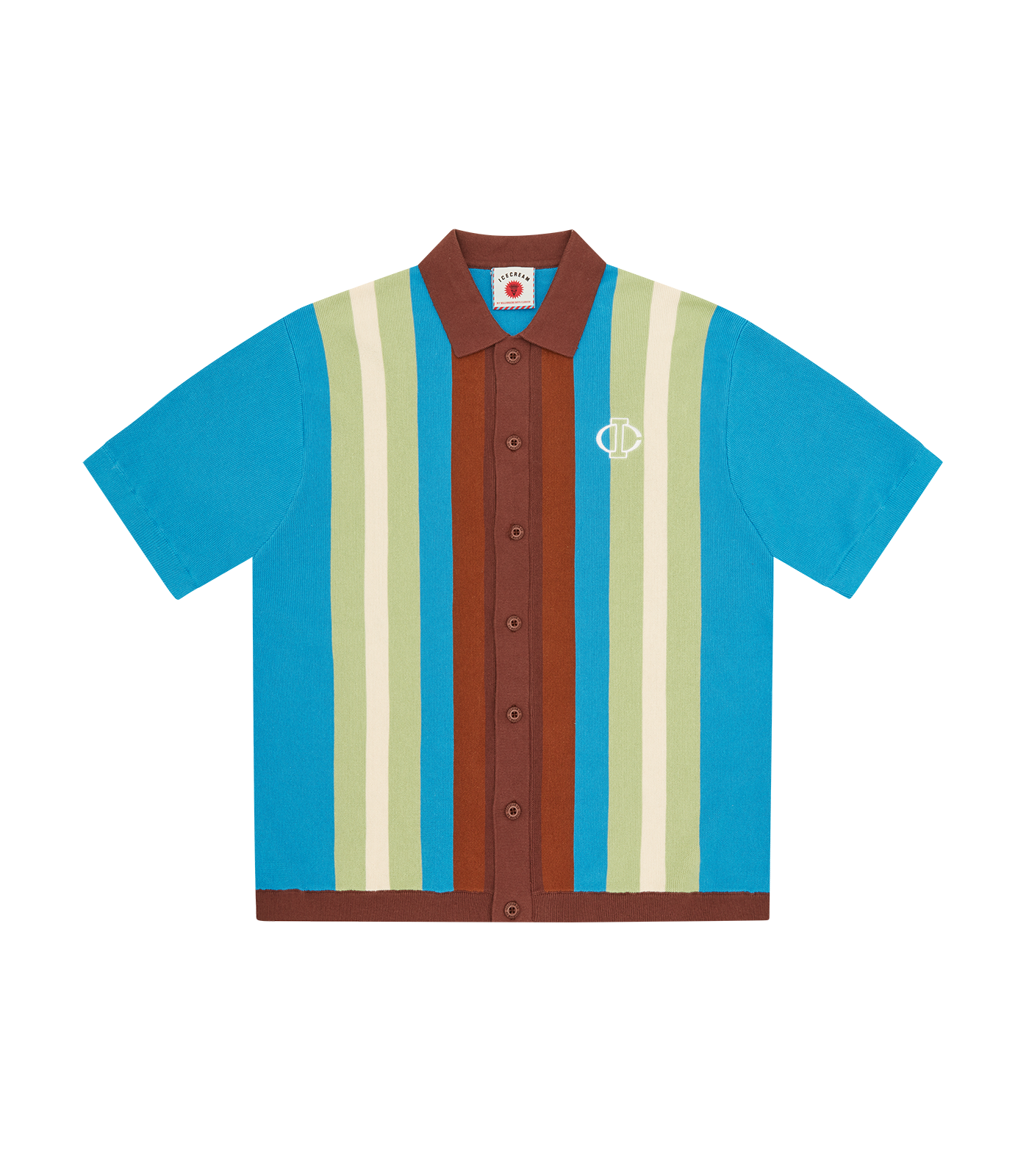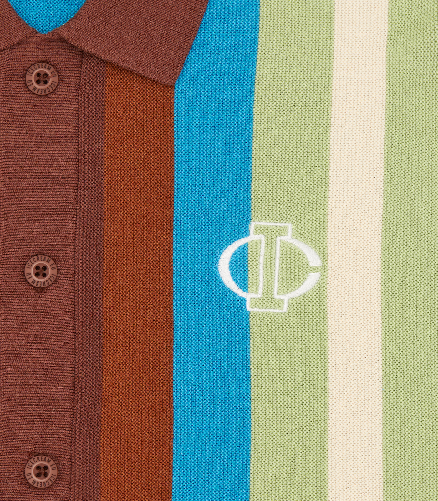 ICECREAM Spring '25 - The Jacquard Knit Short Sleeve Polo Cardigan features the embroidered IC signet at chest with contrasting stripes and branded buttons.