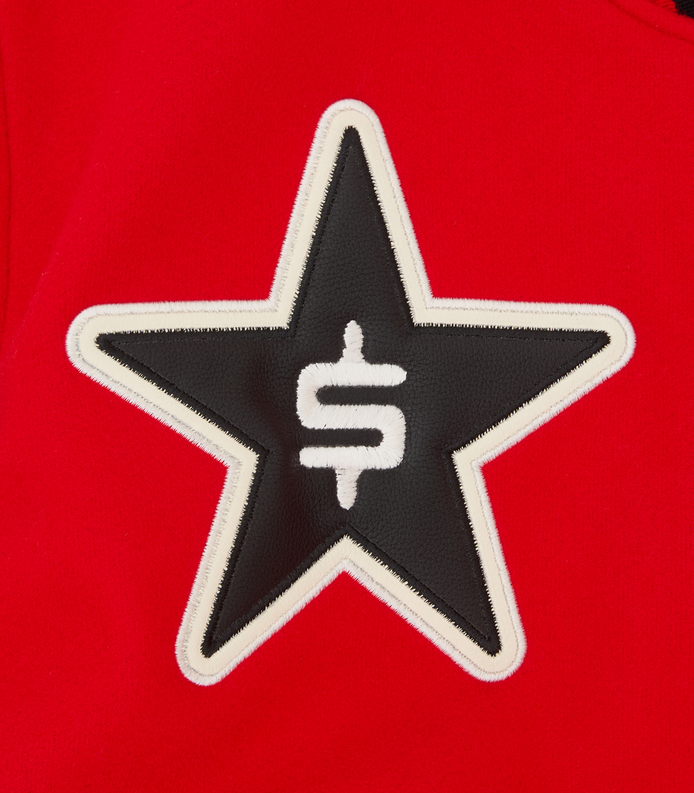 Share: LEATHER SLEEVE COLLEGE SCRIPT VARSITY JACKET - RED/BLACK