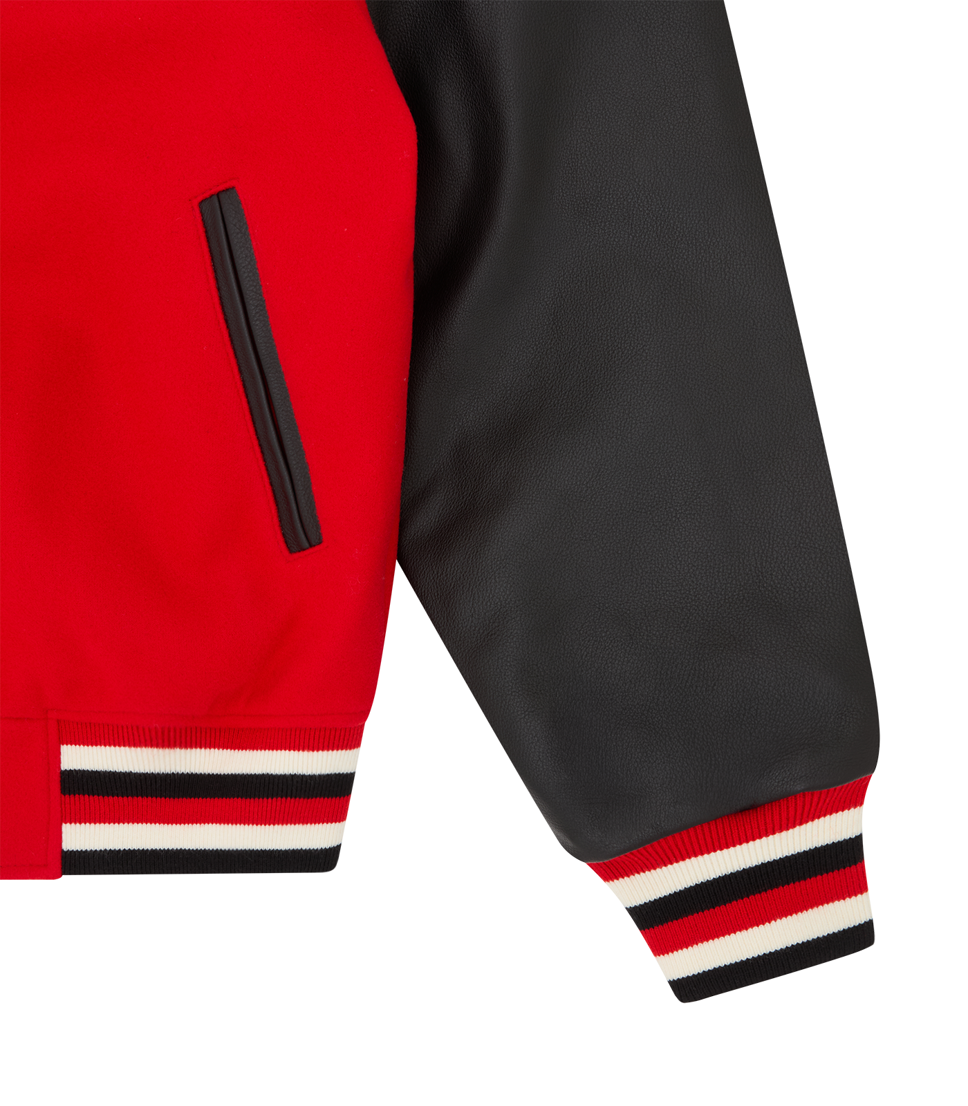 LEATHER SLEEVE COLLEGE SCRIPT VARSITY JACKET - RED/BLACK