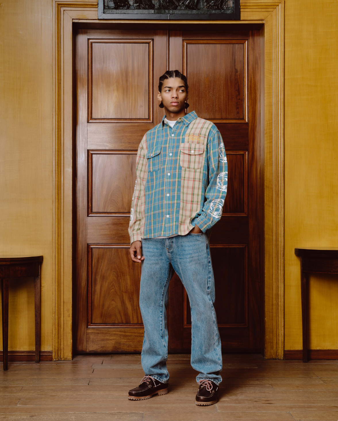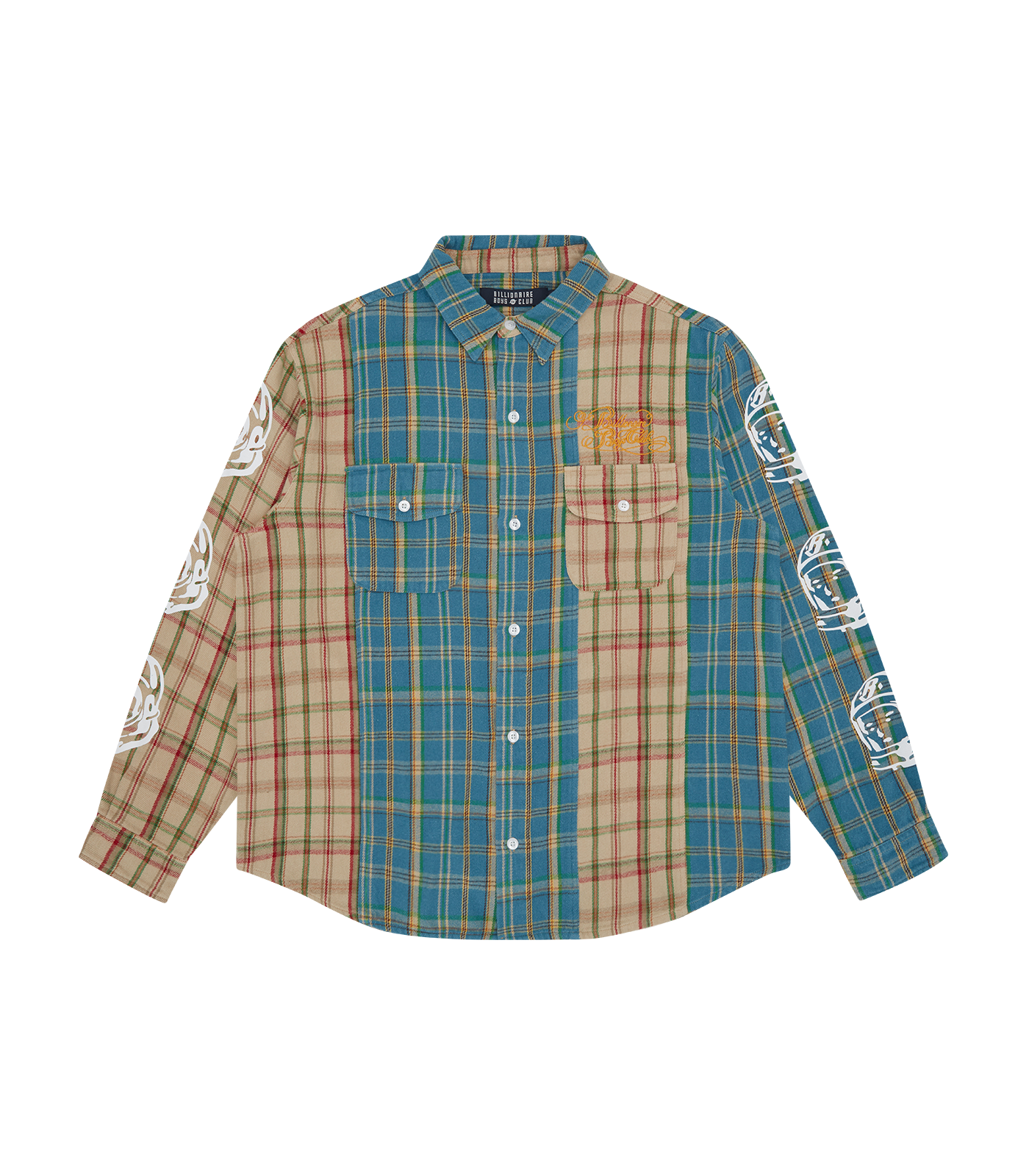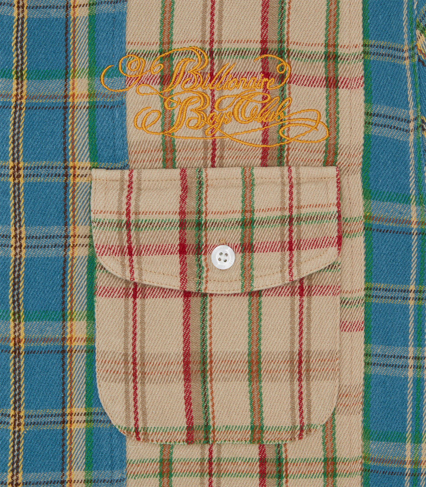 Billionaire Boys Club Pre-Fall '25 - This Panelled Check Shirt presents a block patchwork on the front and back; it is detailed with a printed Astro helmets on both the sleeves.