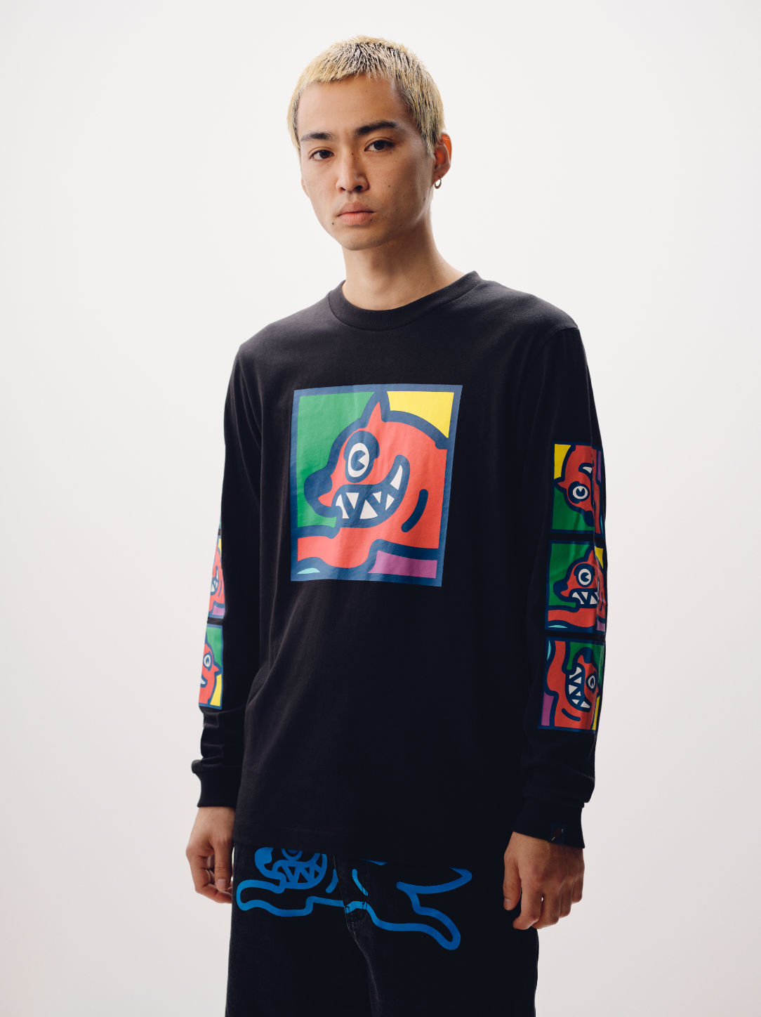 ICECREAM Pre-Fall '25 - The Pop Art Running Dog L/S T-shirt presents a pop art Running Dog graphic on the chest and repeated on the sleeves.