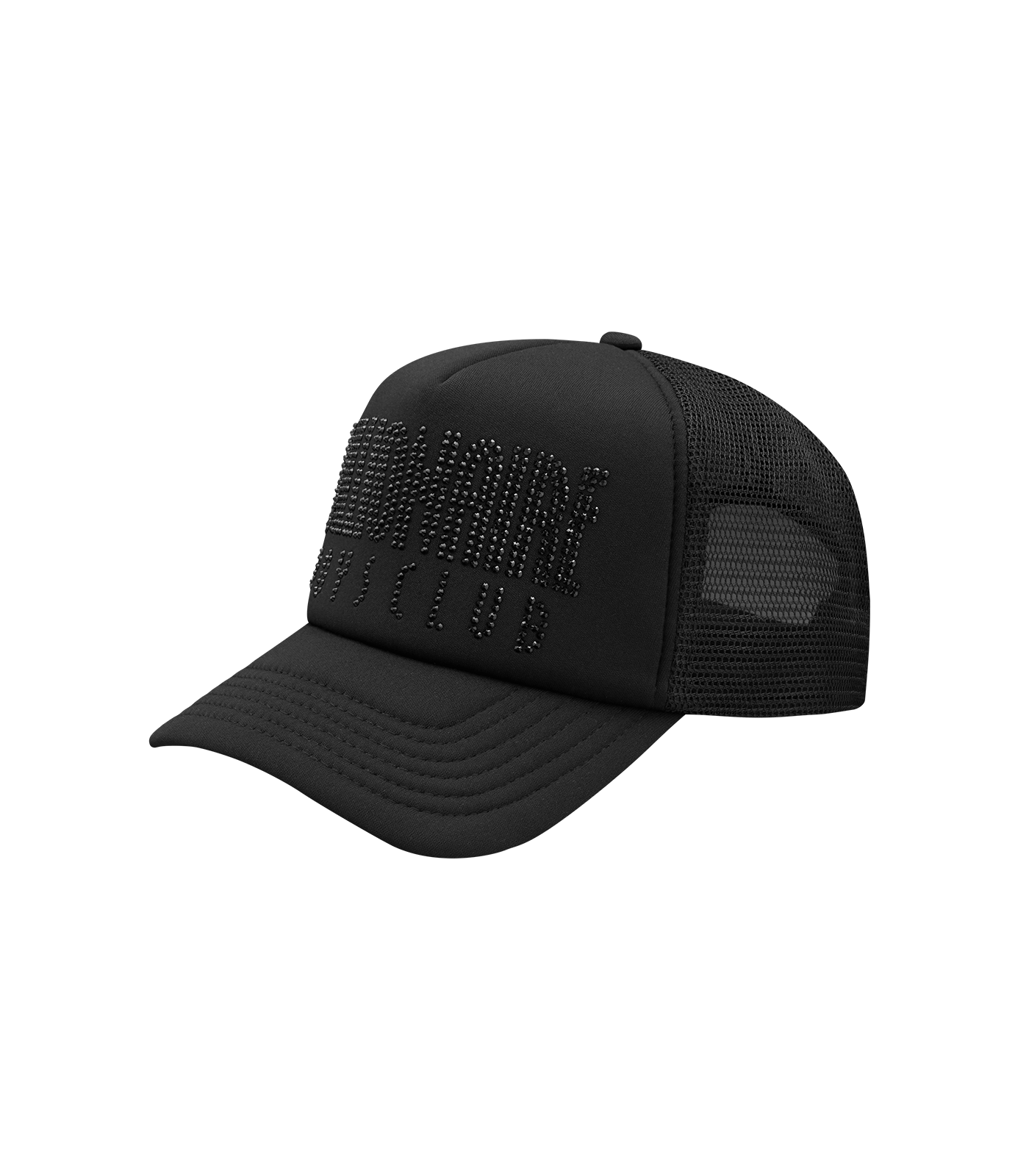 RHINESTONE STRAIGHT LOGO TRUCKER CAP - BLACK