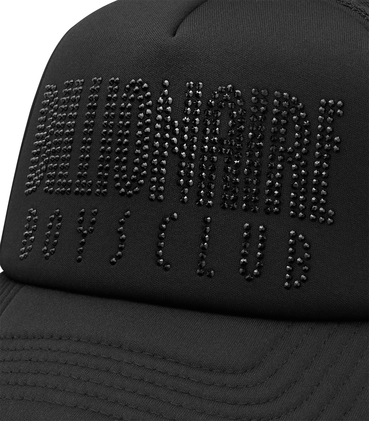 Billionaire Boys Club Pre-Fall '25 - The Rhinestone Straight Logo Trucker features the Billionaire Boys Club straight logo filled with rhinestones at the front and mesh back.