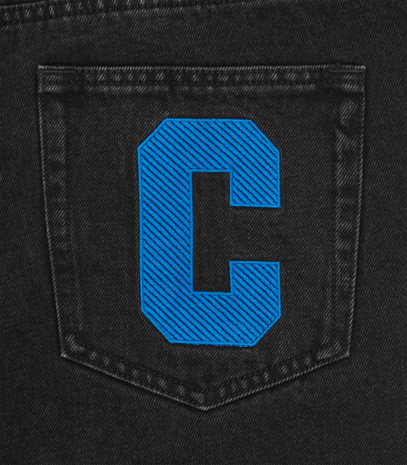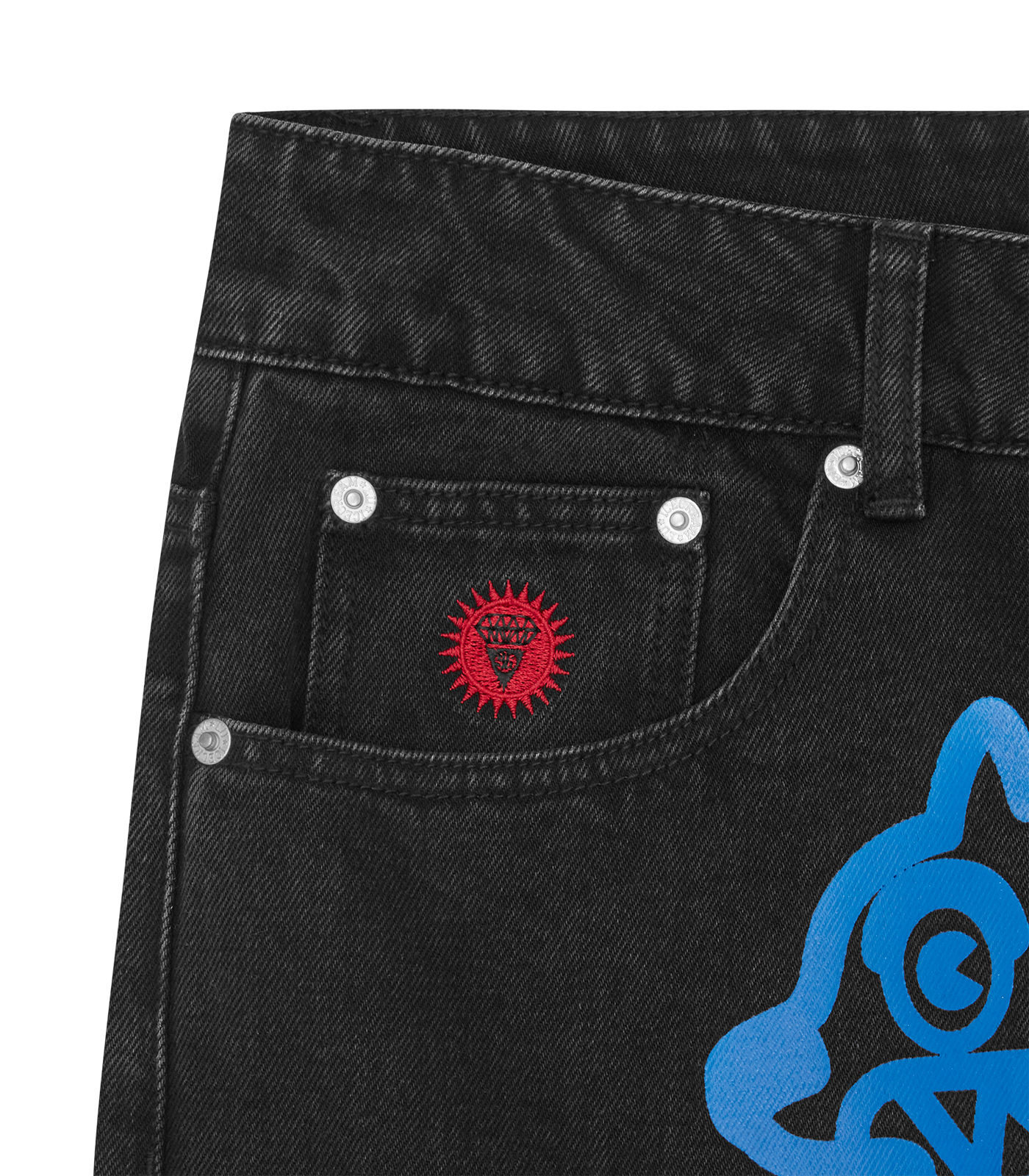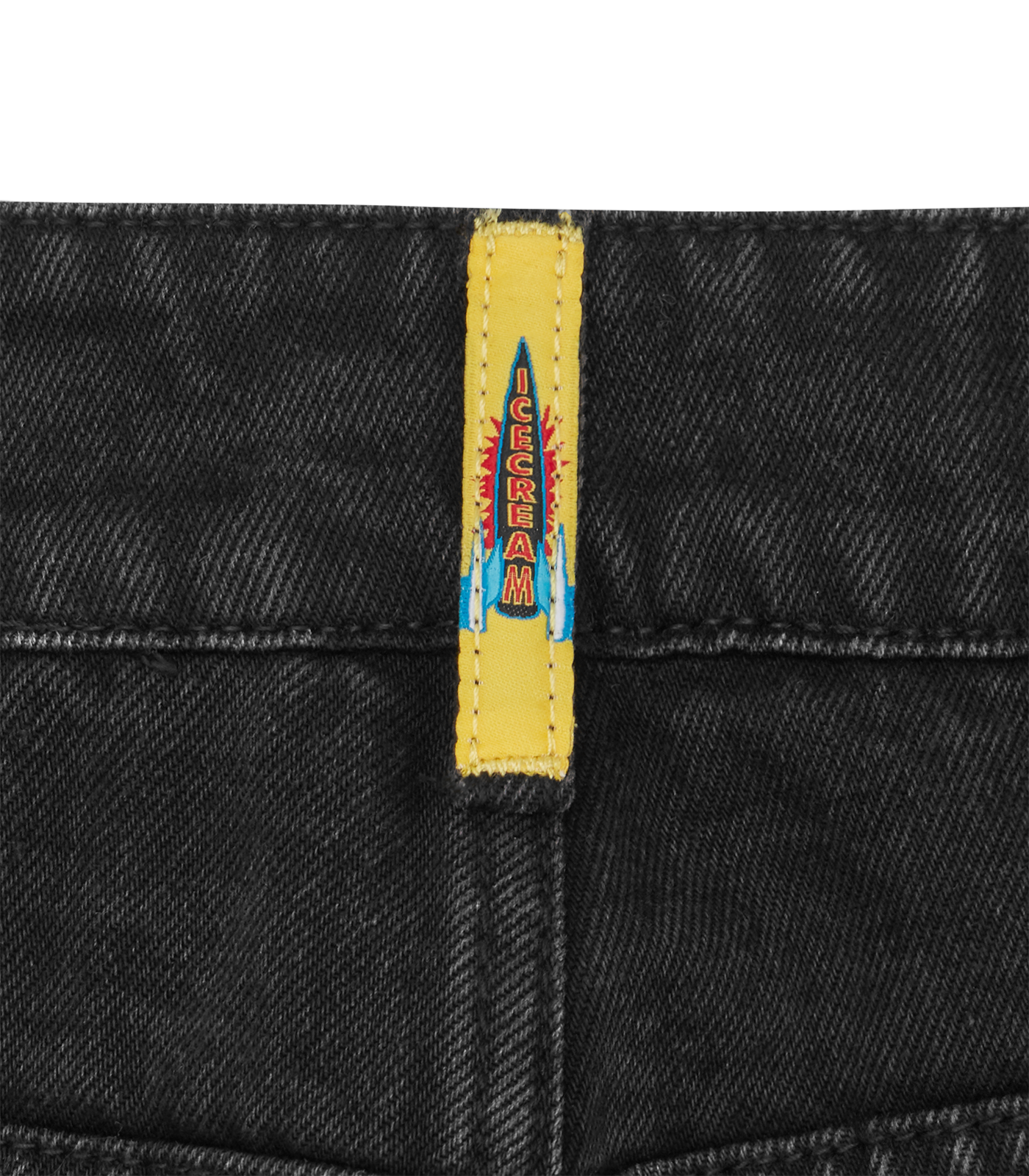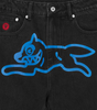 ICECREAM Pre-Fall '25 - Running Dog Denim Pant, feature a screen-printed running dog graphic on the front, embroidered IC signet, embroidered "IC" lettering on the back pockets, and a zip-fastened fly.