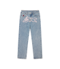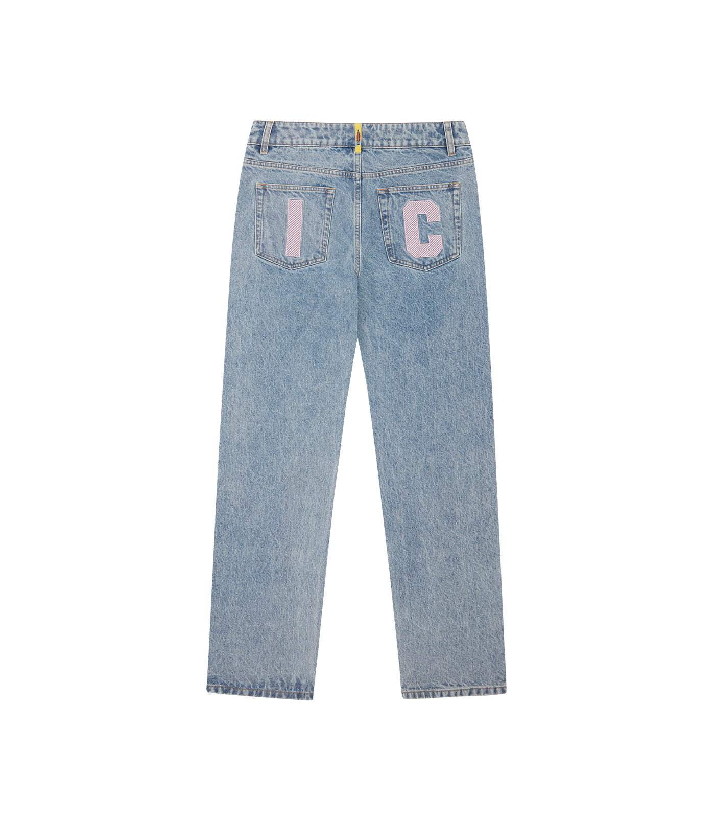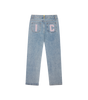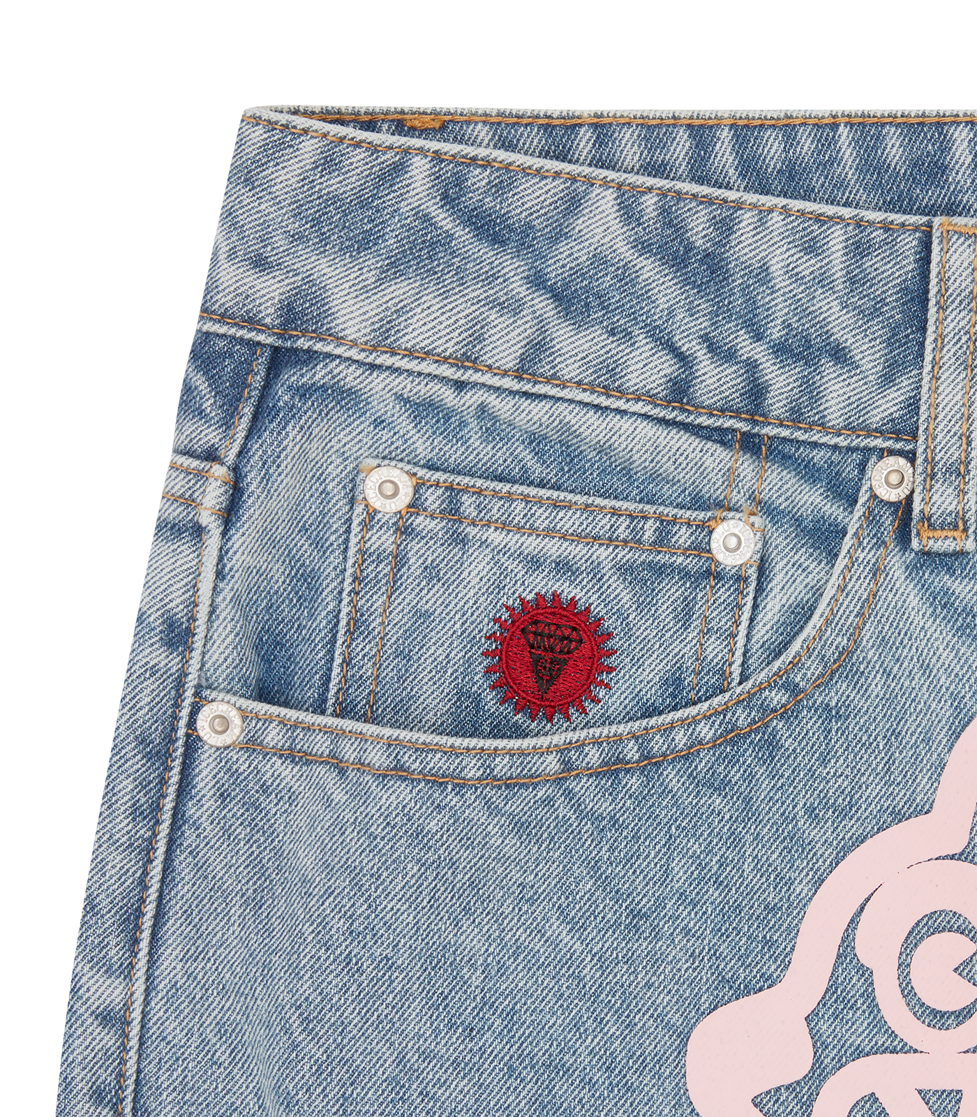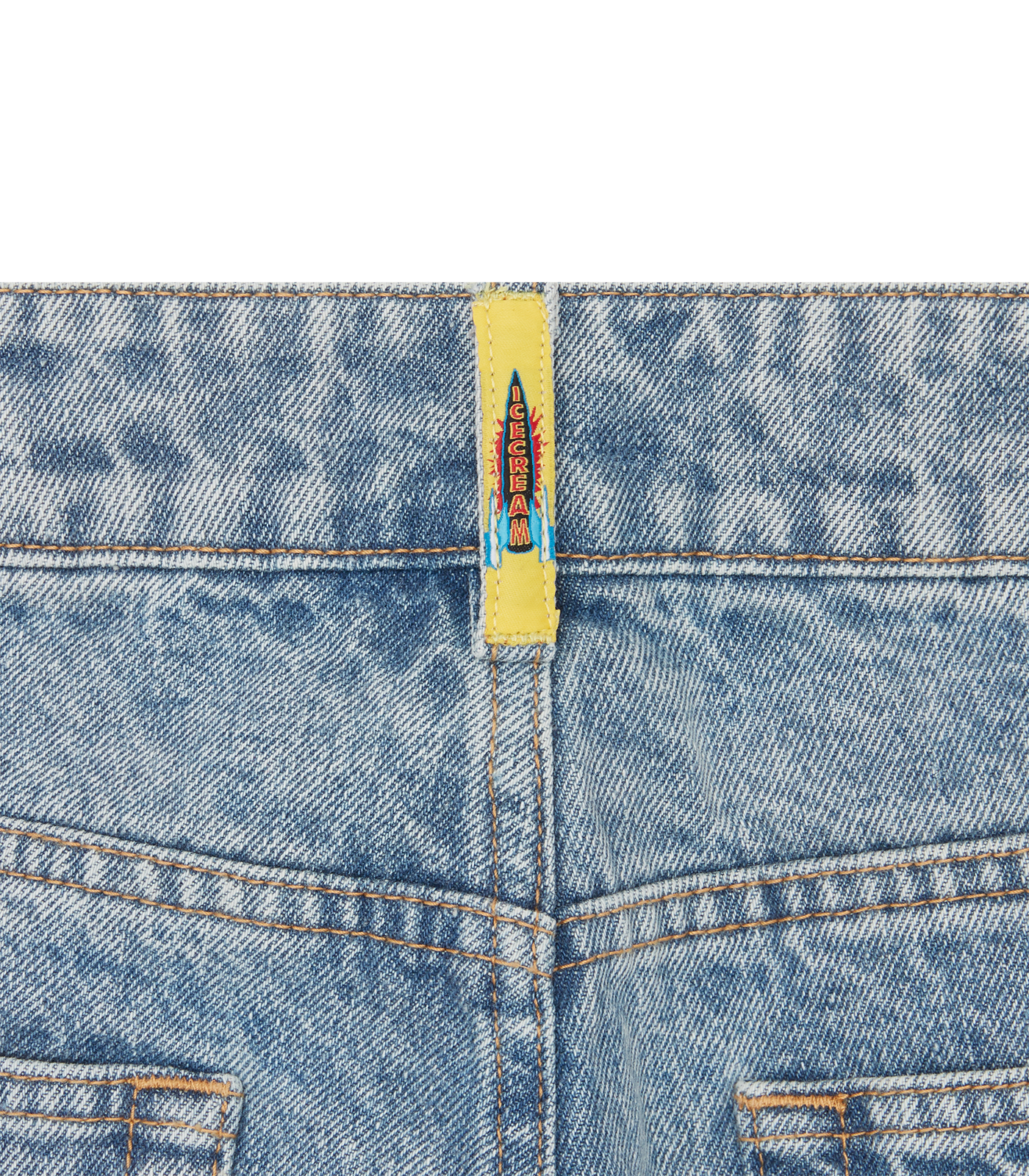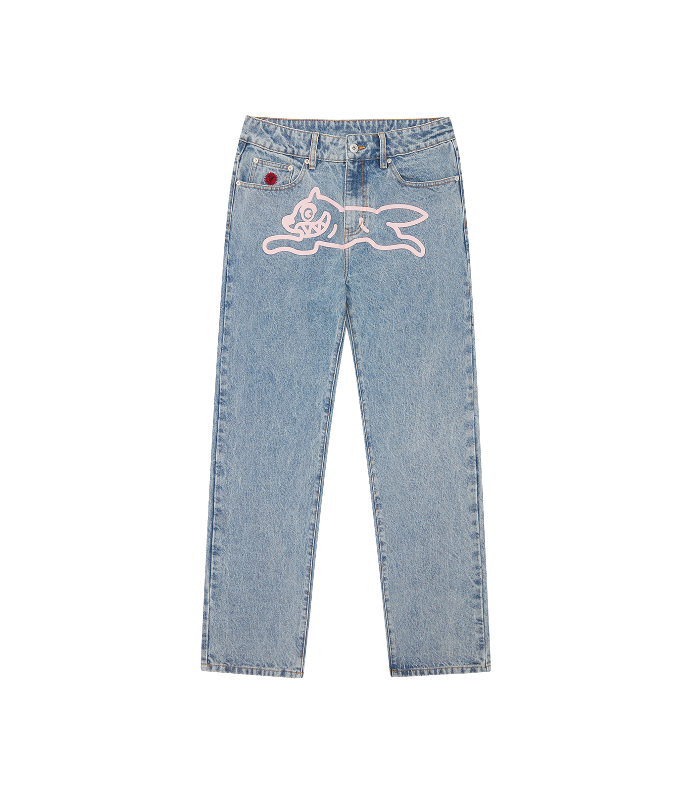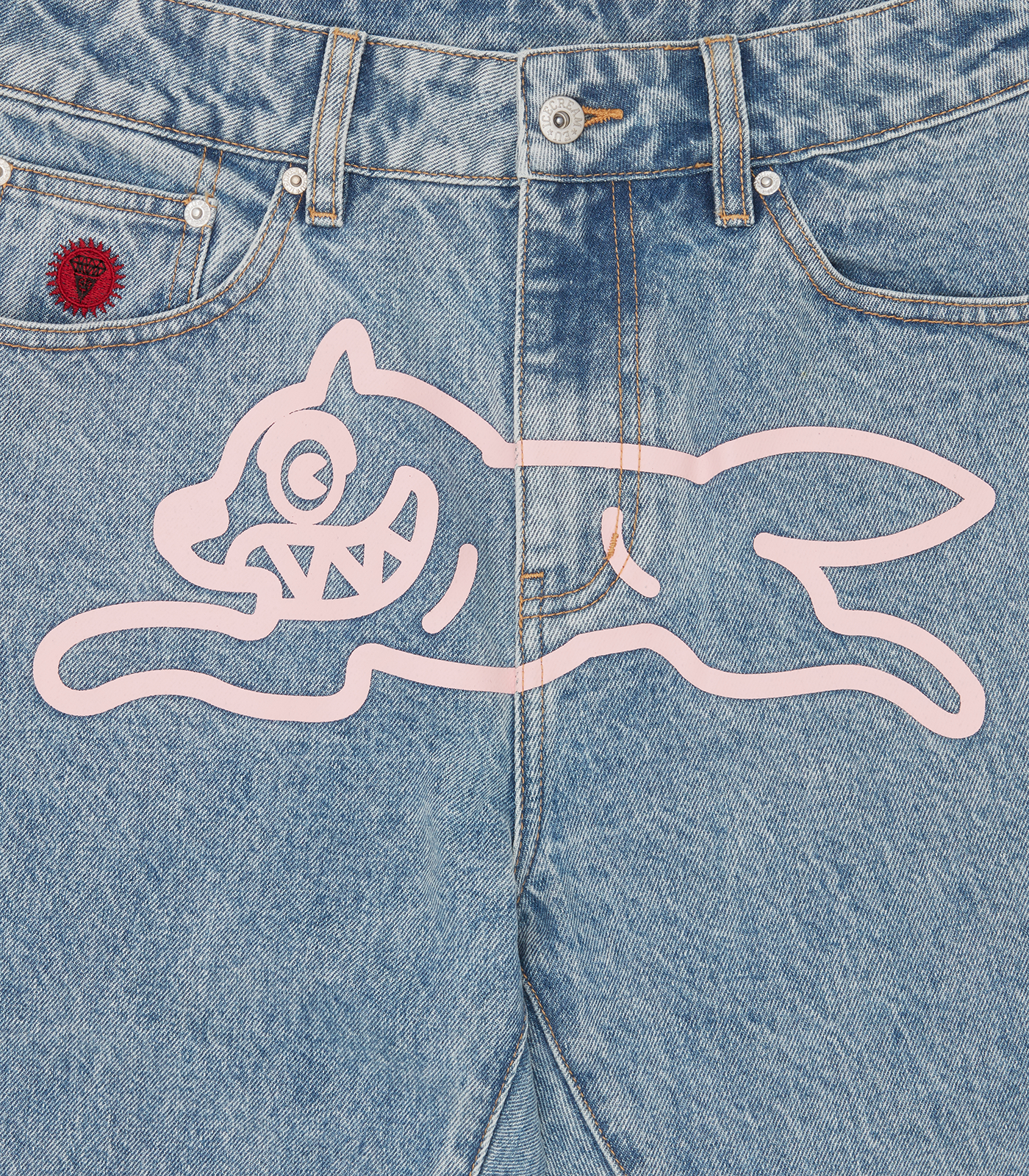 ICECREAM Fall '25 - Running Dog Denim Pants, feature a screen-printed running dog graphic on the front, embroidered IC signet, embroidered "IC" lettering on the back pockets, and a zip-fastened fly.