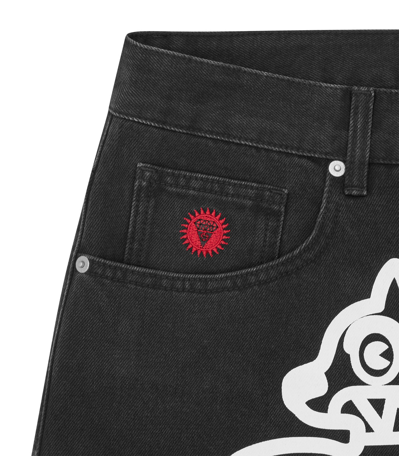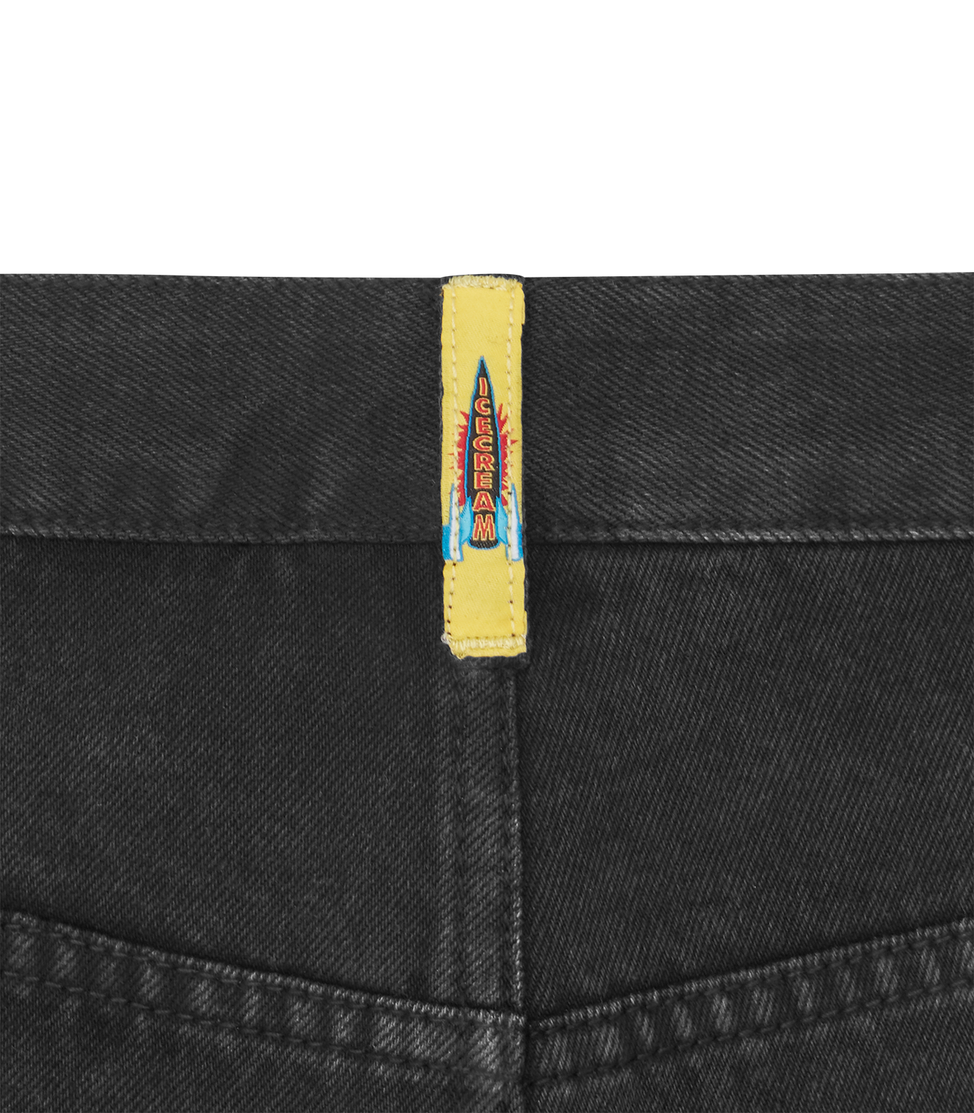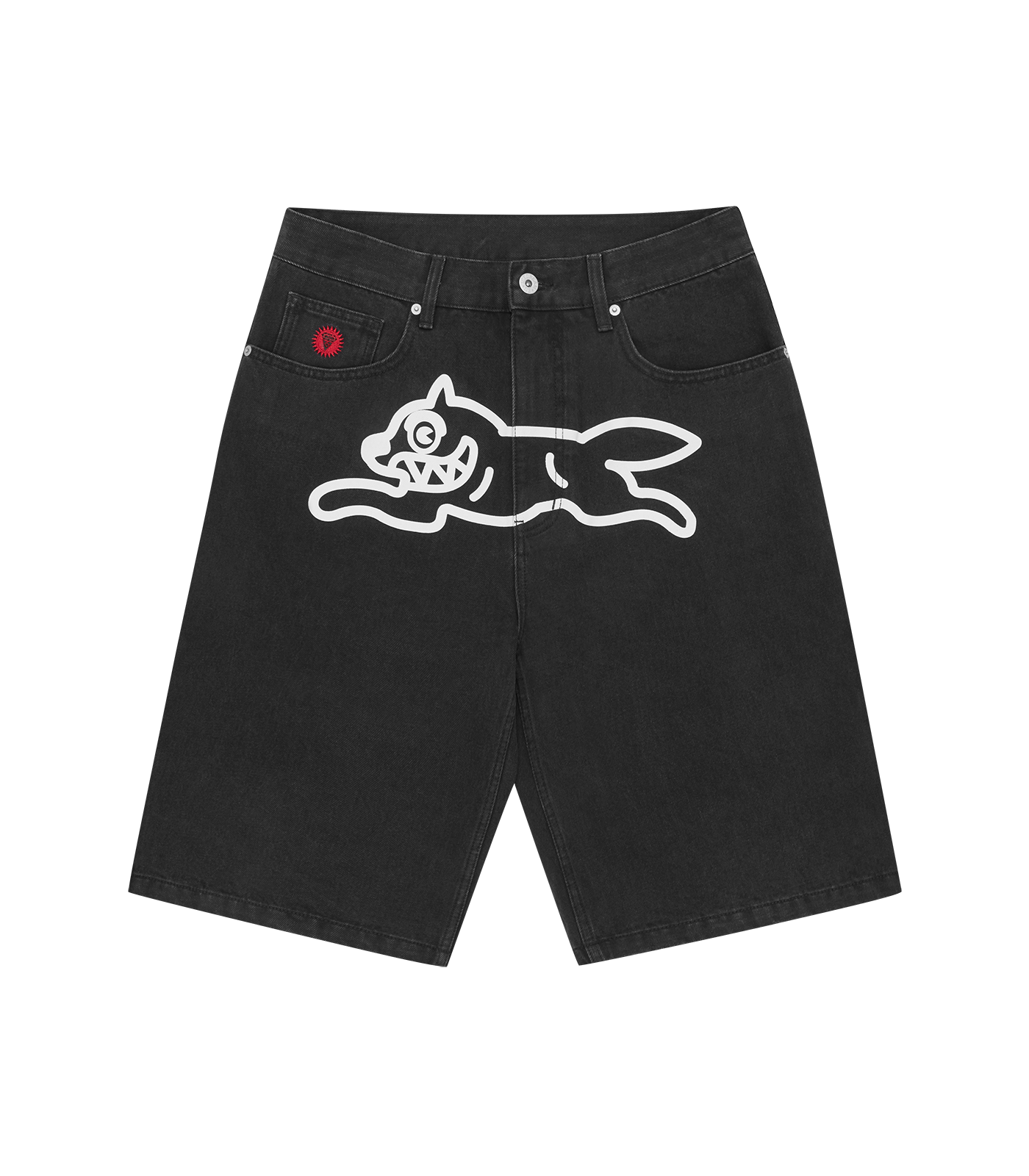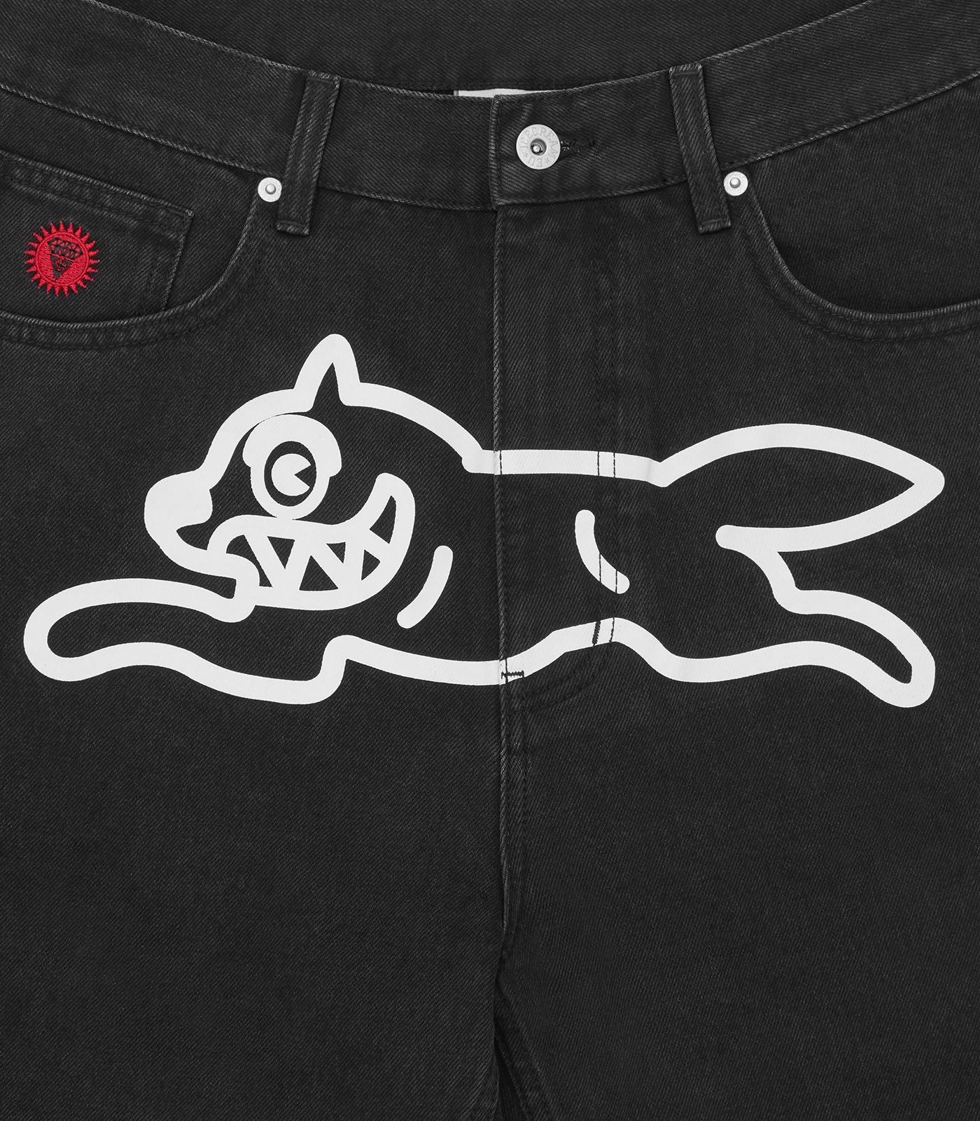 ICECREAM Fall '25 - Running Dog Denim Shorts, featuring the iconic screen-printed running dog graphic on the front, embroidered IC signet, embroidered "IC" lettering on the back pockets, and a zip-fastened fly.