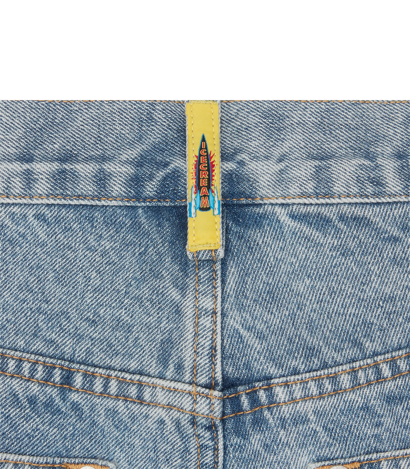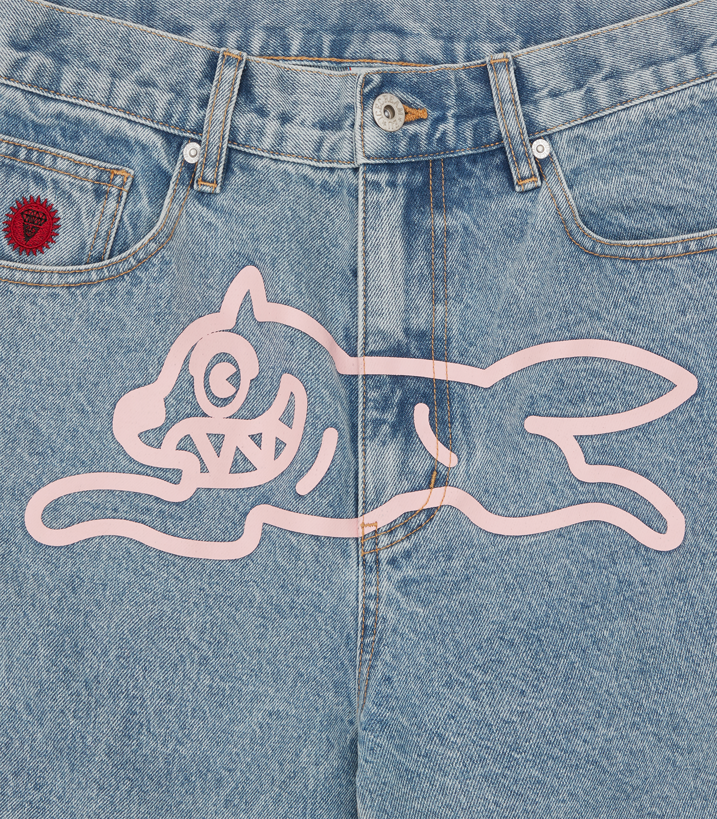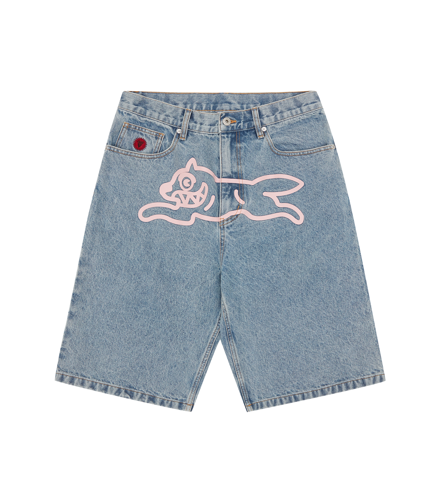 ICECREAM Fall '25 - Running Dog Denim Shorts, featuring the iconic screen-printed running dog graphic on the front, embroidered IC signet, embroidered "IC" lettering on the back pockets, and a zip-fastened fly.