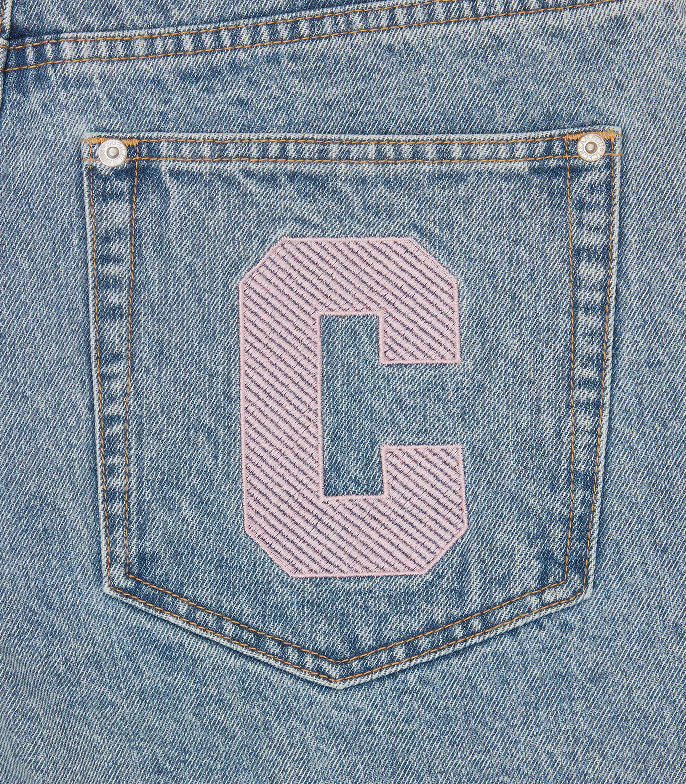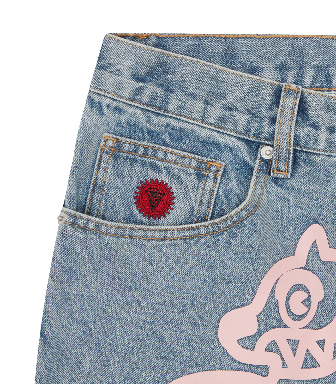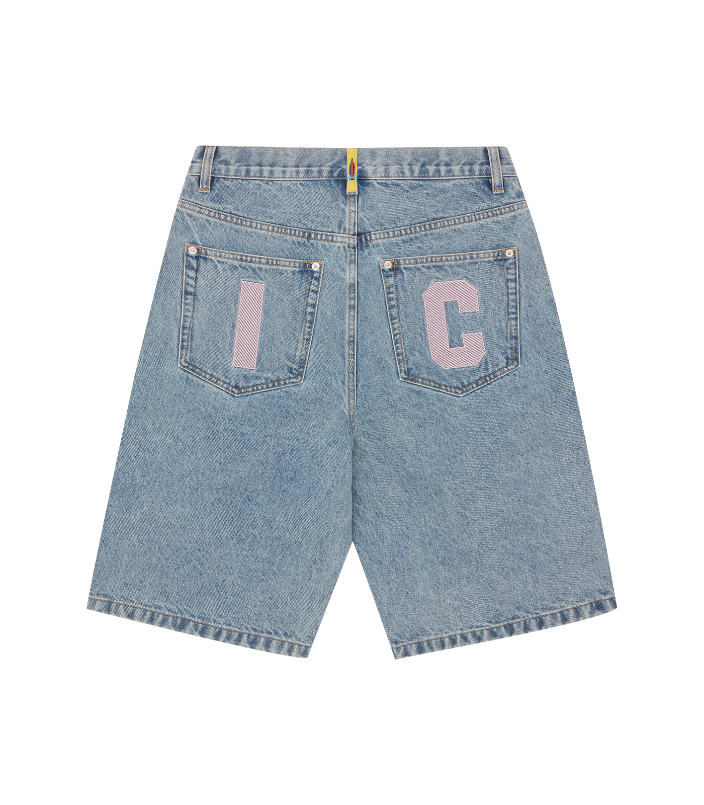 ICECREAM Fall '25 - Running Dog Denim Shorts, featuring the iconic screen-printed running dog graphic on the front, embroidered IC signet, embroidered "IC" lettering on the back pockets, and a zip-fastened fly.