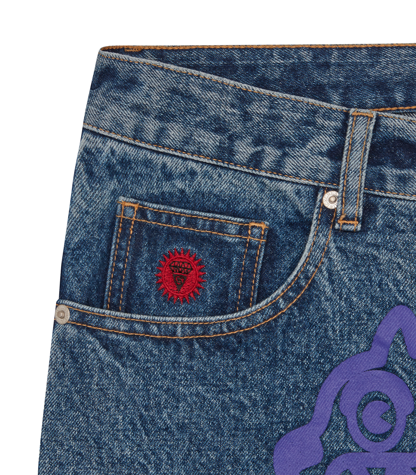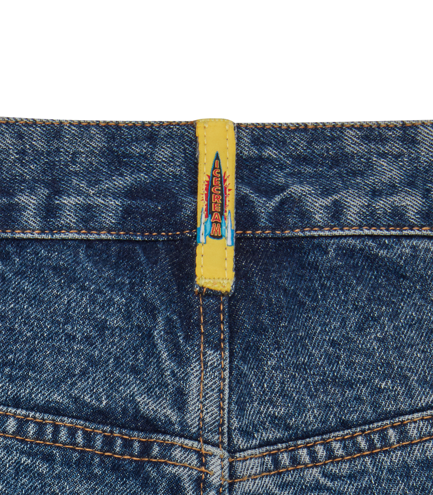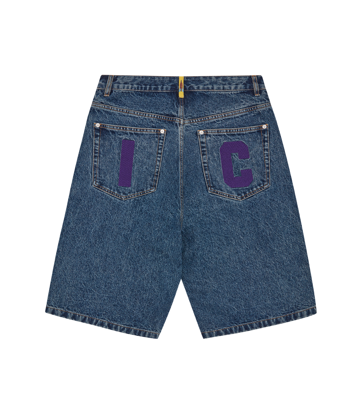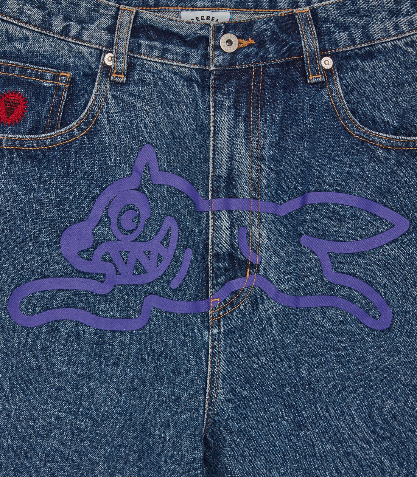 ICECREAM Pre-Fall '25 - Running Dog Denim Shorts, featuring the iconic screen-printed running dog graphic on the front, embroidered IC signet, embroidered "IC" lettering on the back pockets, and a zip-fastened fly.