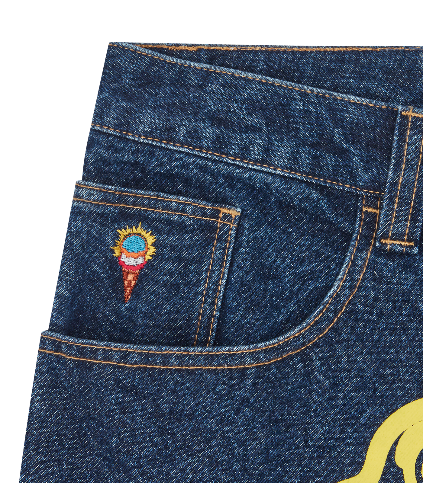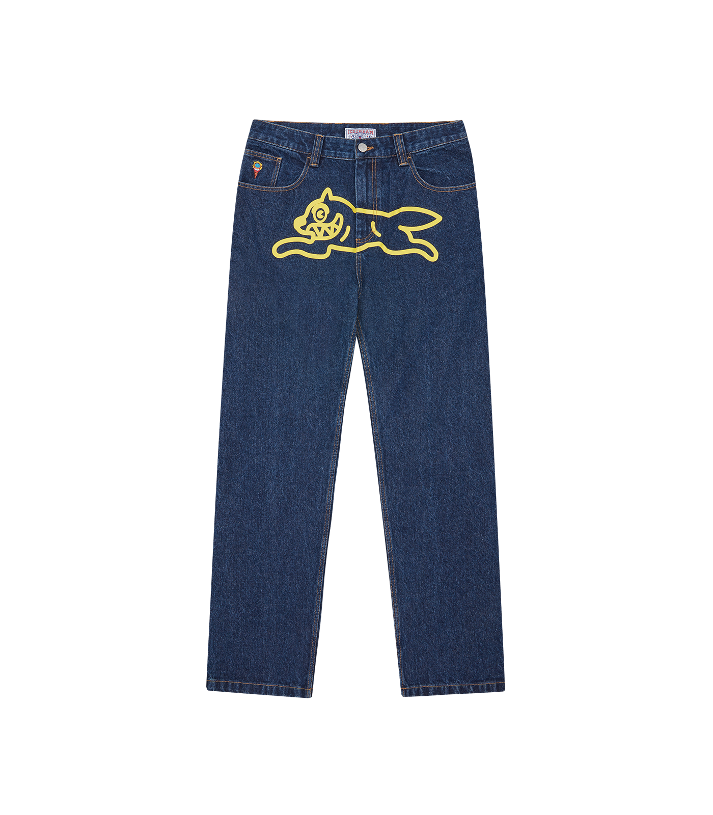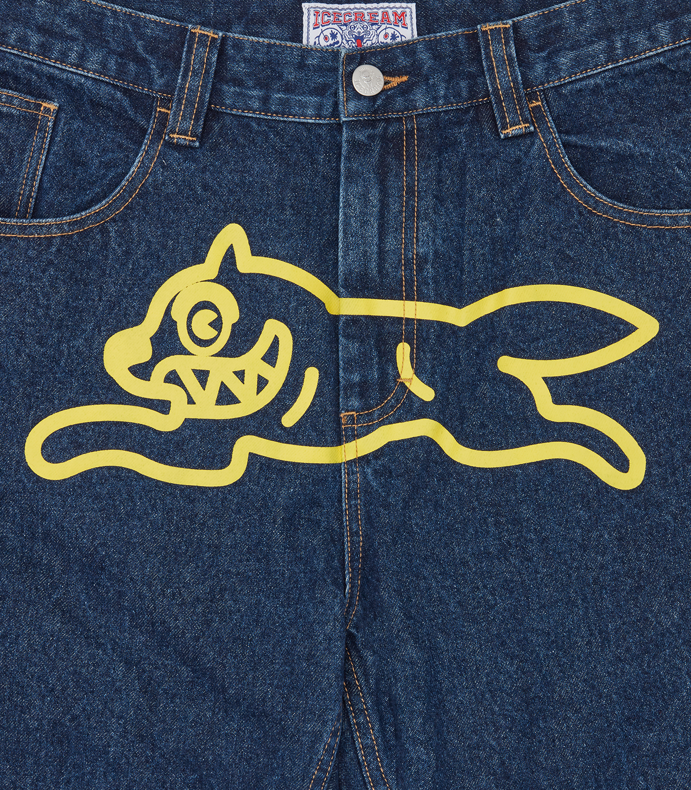 ICECREAM Fall '25 - Running Dog Double Scoop Denim Pants, feature a screen-printed running dog graphic on the front, embroidered double scoop signet at coin pocket and drip detailing on the back pockets. Zip-fastened fly. Loose fit.