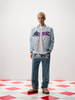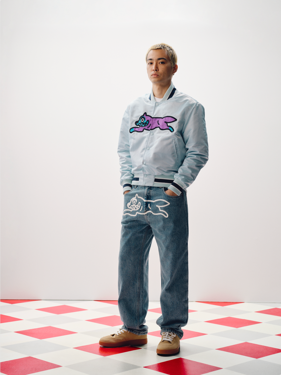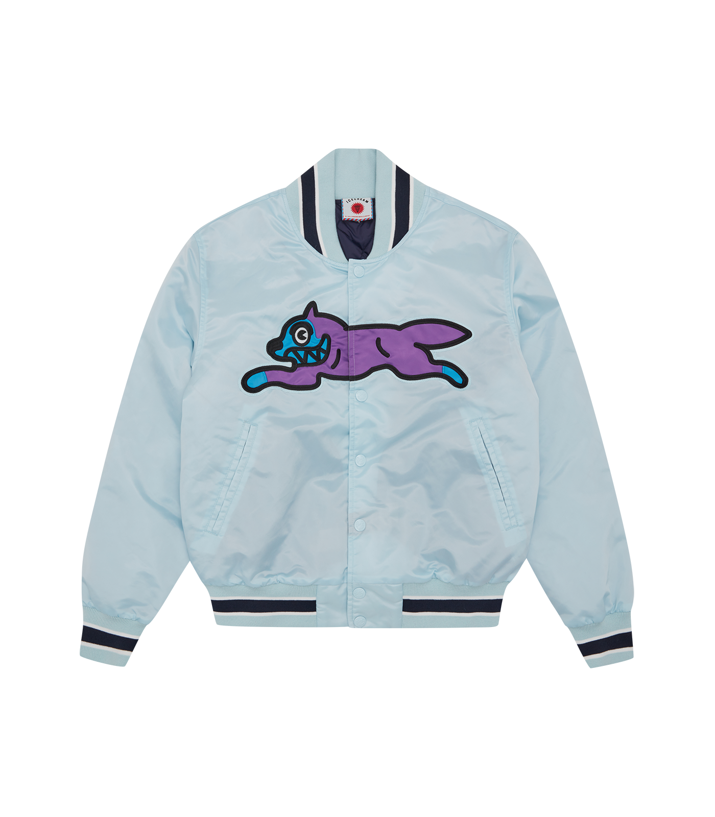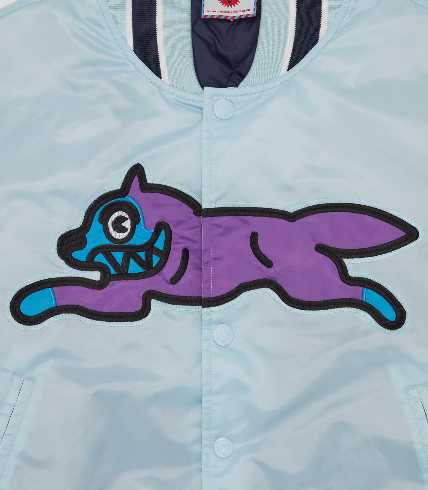 ICECREAM Pre-Fall '25 - With a classic varsity jacket fit, ribbed collar, sleeves and waist hem, quilted lining, the Running Dog Satin Bomber Jacket presents the Running Dog appliqué all-over the chest.