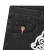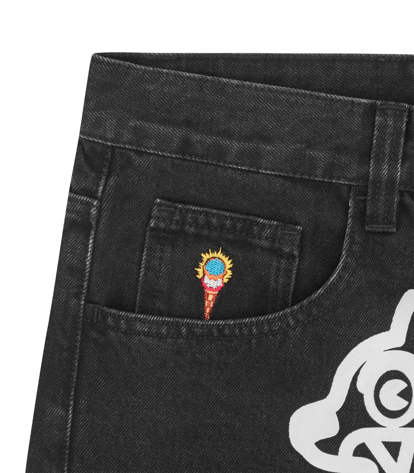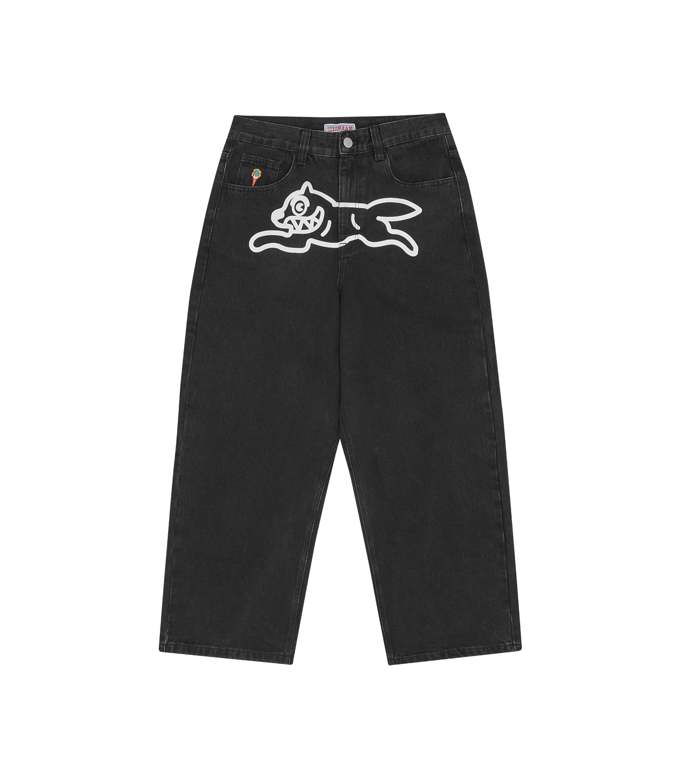ICECREAM Pre-Spring '26 - Running Dog Triple Scoop Denim Pants, feature a screen-printed running dog graphic on the front, embroidered double scoop signet and drip detailing on the back pockets, and a zip-fastened fly.