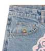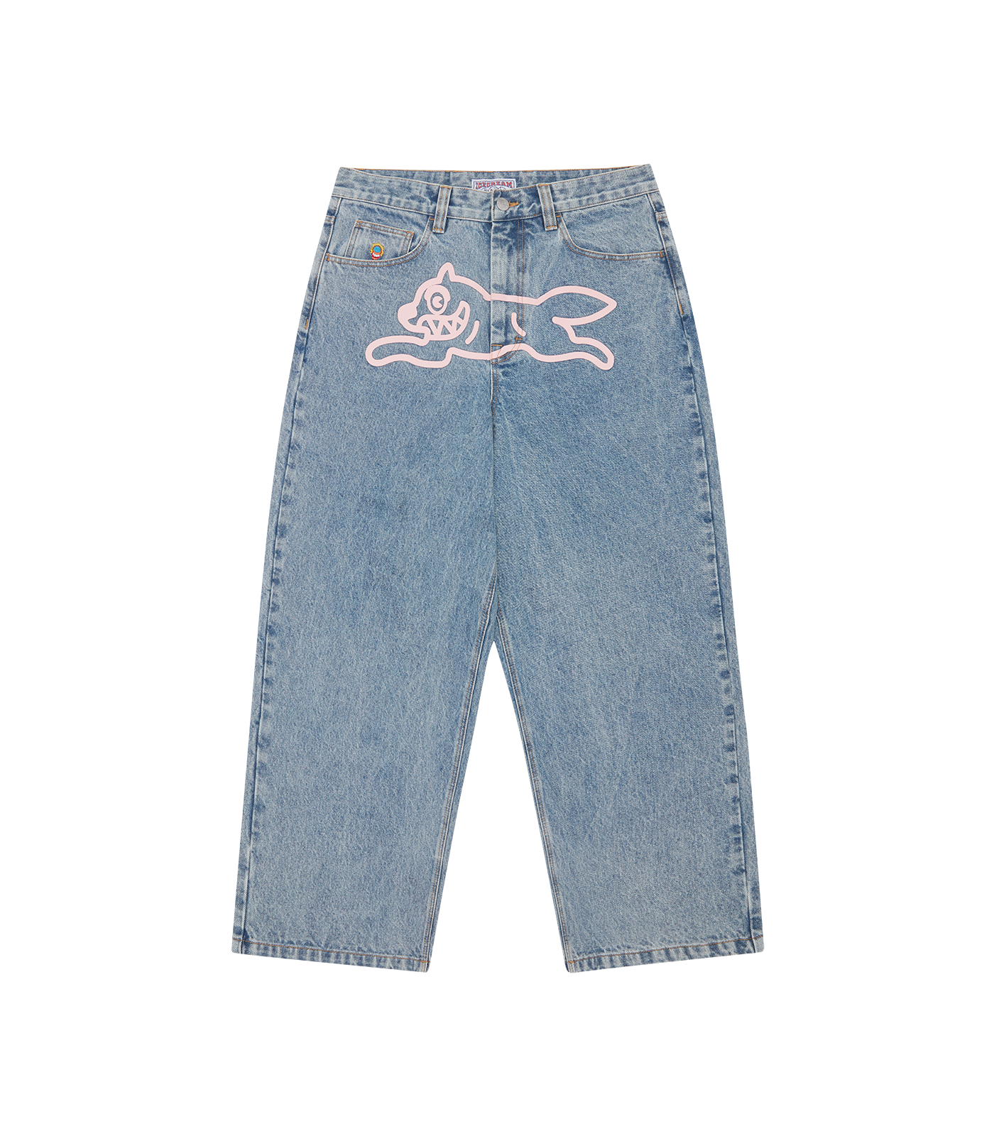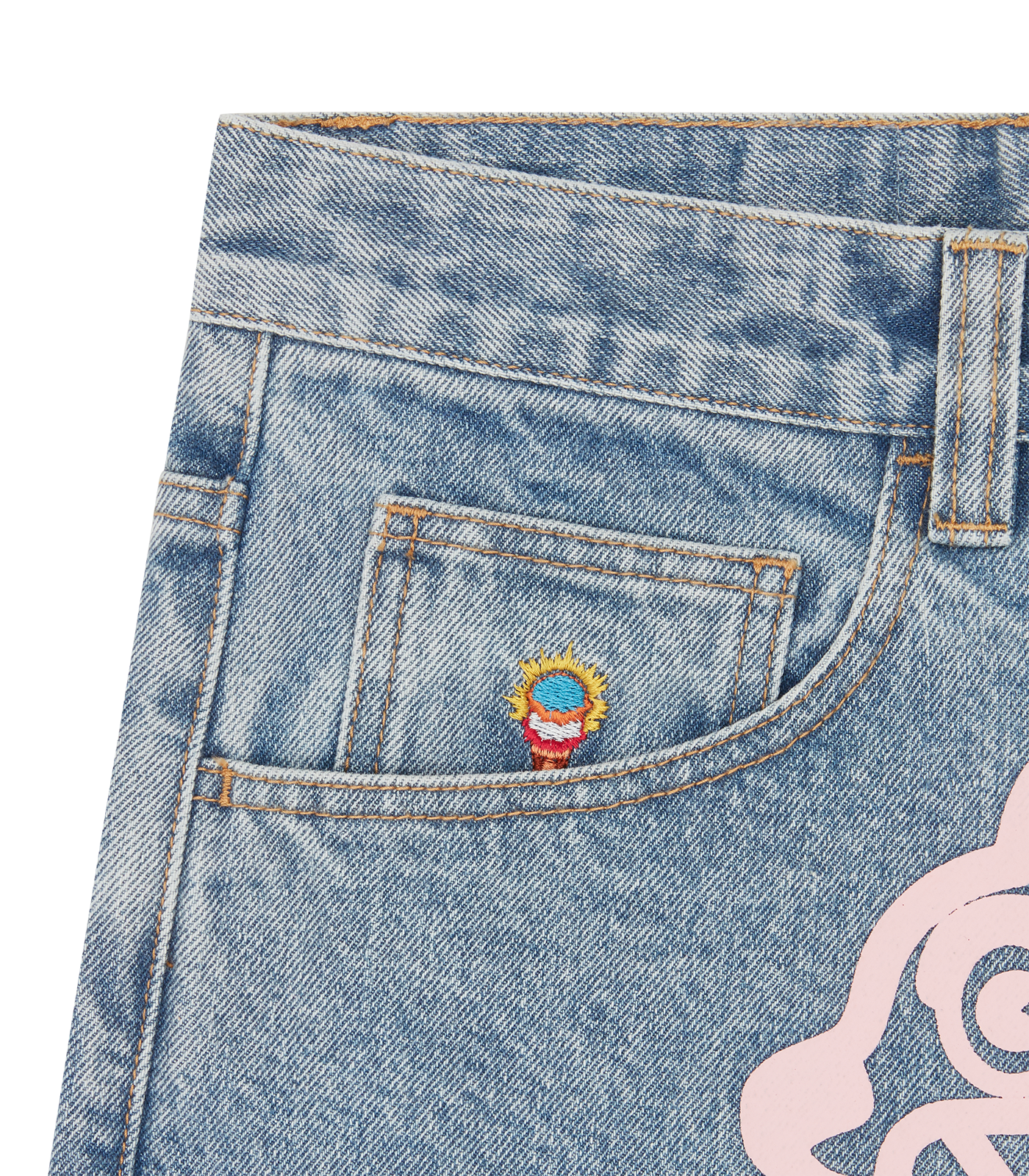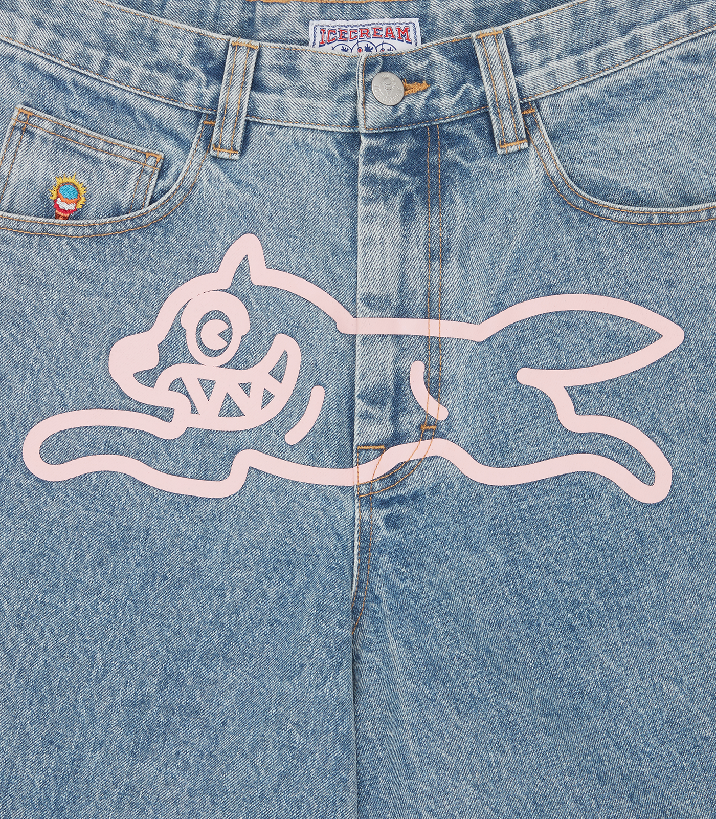 ICECREAM Fall '25 - Running Dog Triple Scoop Denim Pants, feature a screen-printed running dog graphic on the front, embroidered double scoop signet and drip detailing on the back pockets, and a zip-fastened fly.