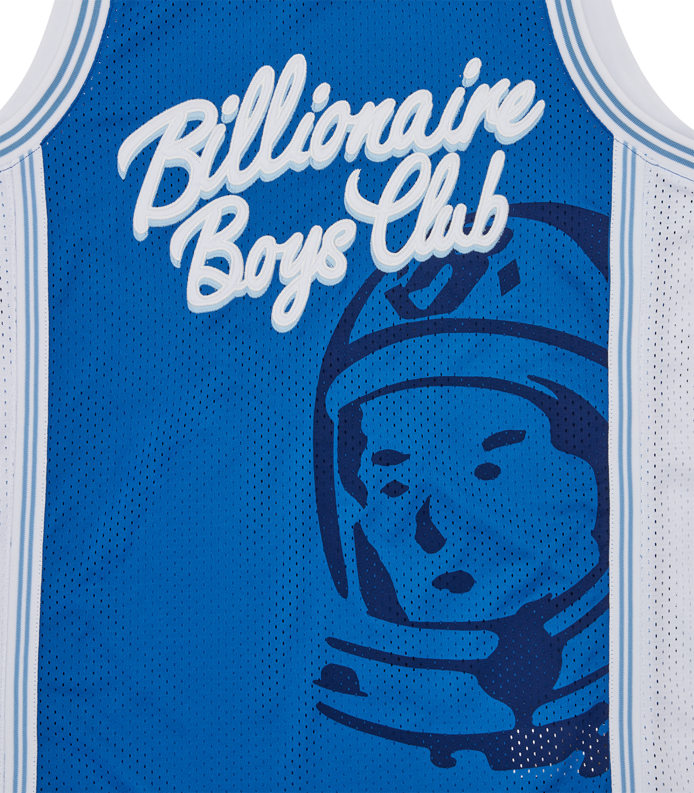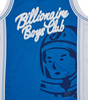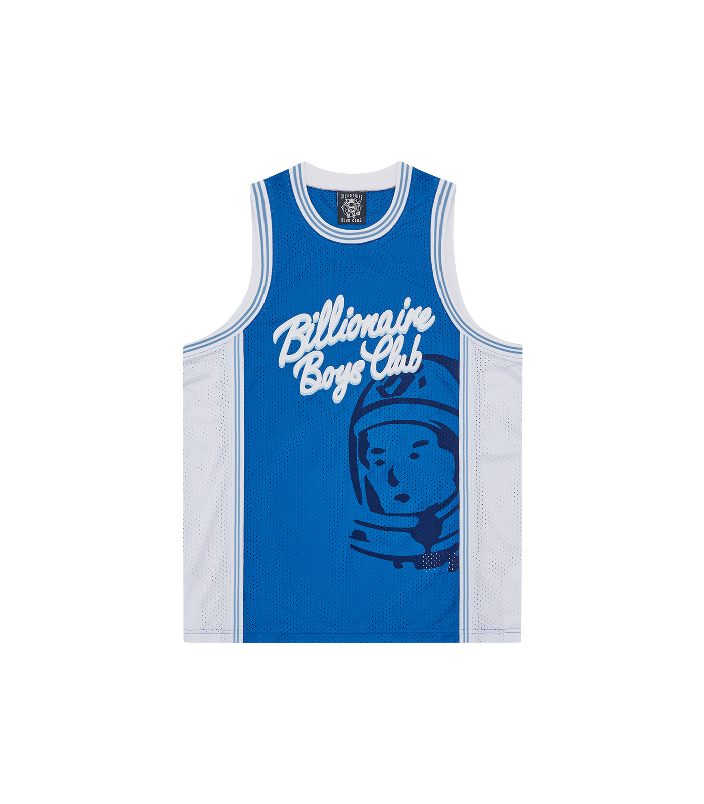 Billionaire Boys Club Pre-Fall '25 - Script Logo Astro Basketball Jersey with a satin Billionaire Boys Club Script logo patch and Astro helmet print at front, detailed with a knitted stripe tape around the neck, armholes and side panels.