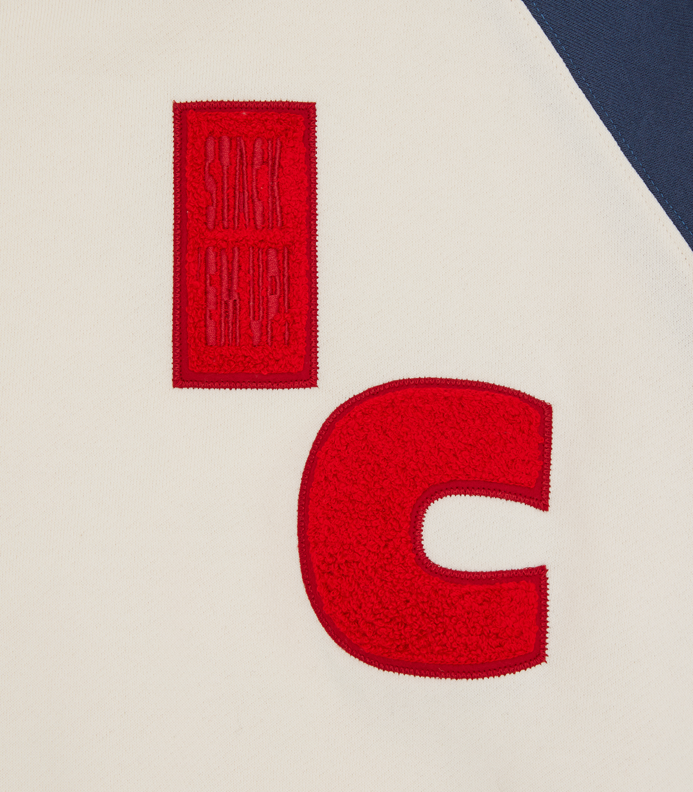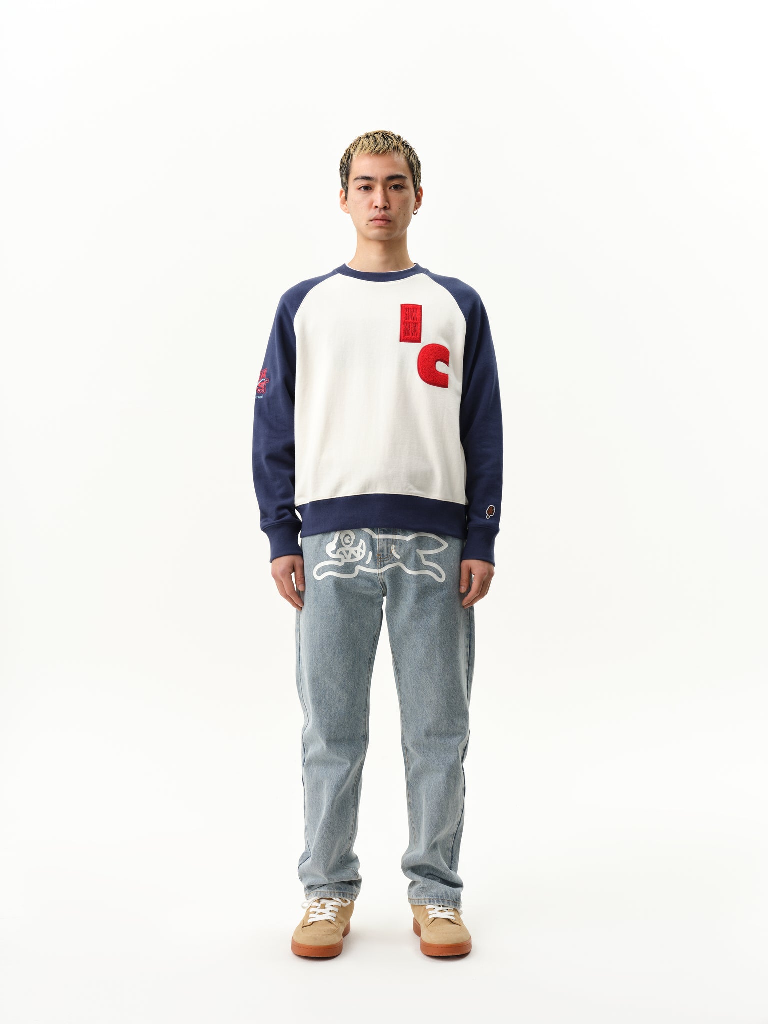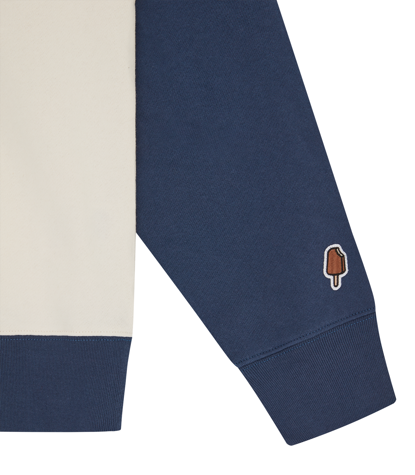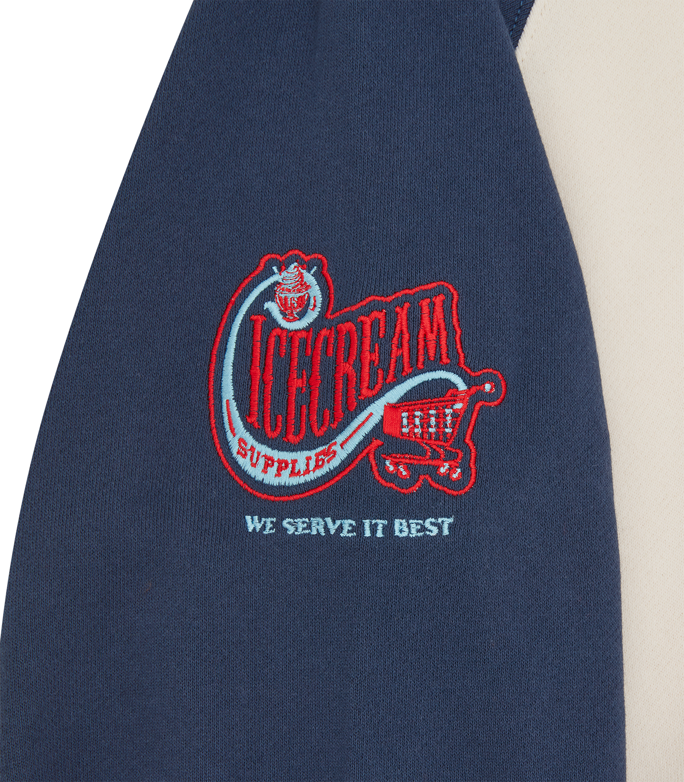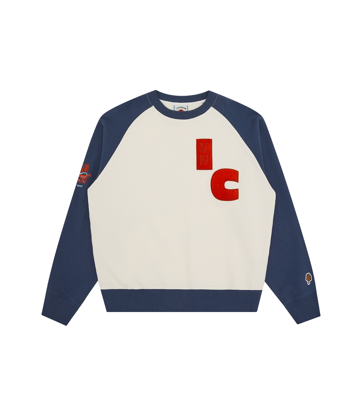 ICECREAM Fall '25 - The Stack Em Up Crewneck presents contrasting sleeves and rib panels, the IC chenille patch on the front chest and the ICECREAM branded graphic on the right sleeve.