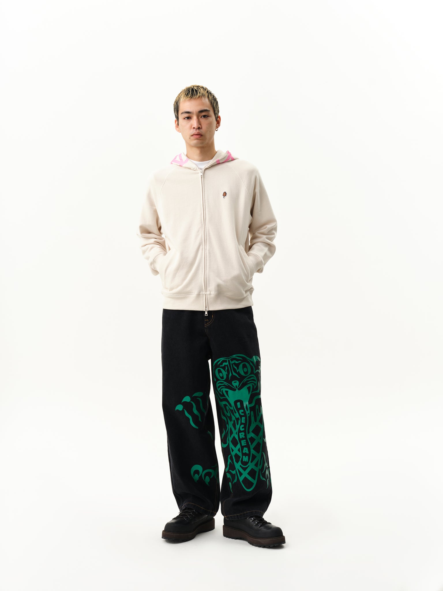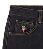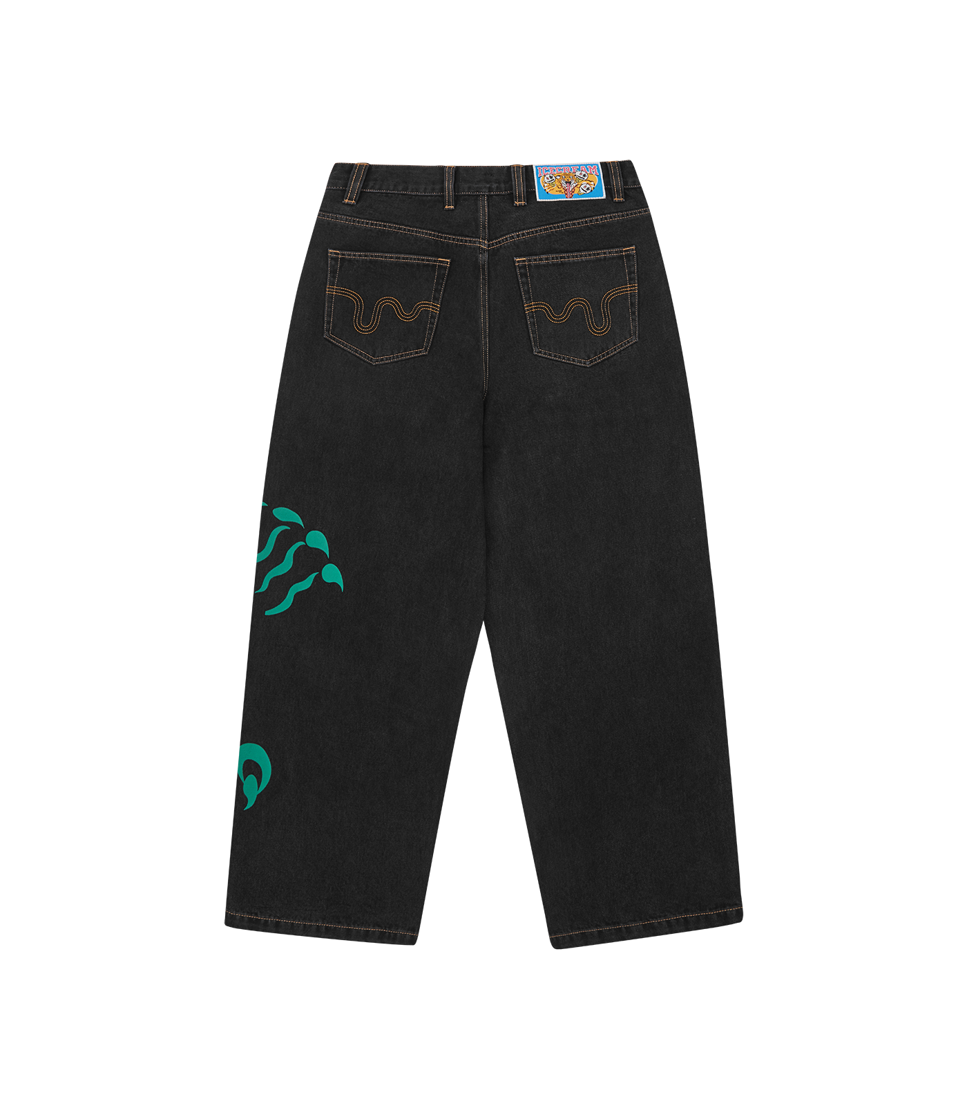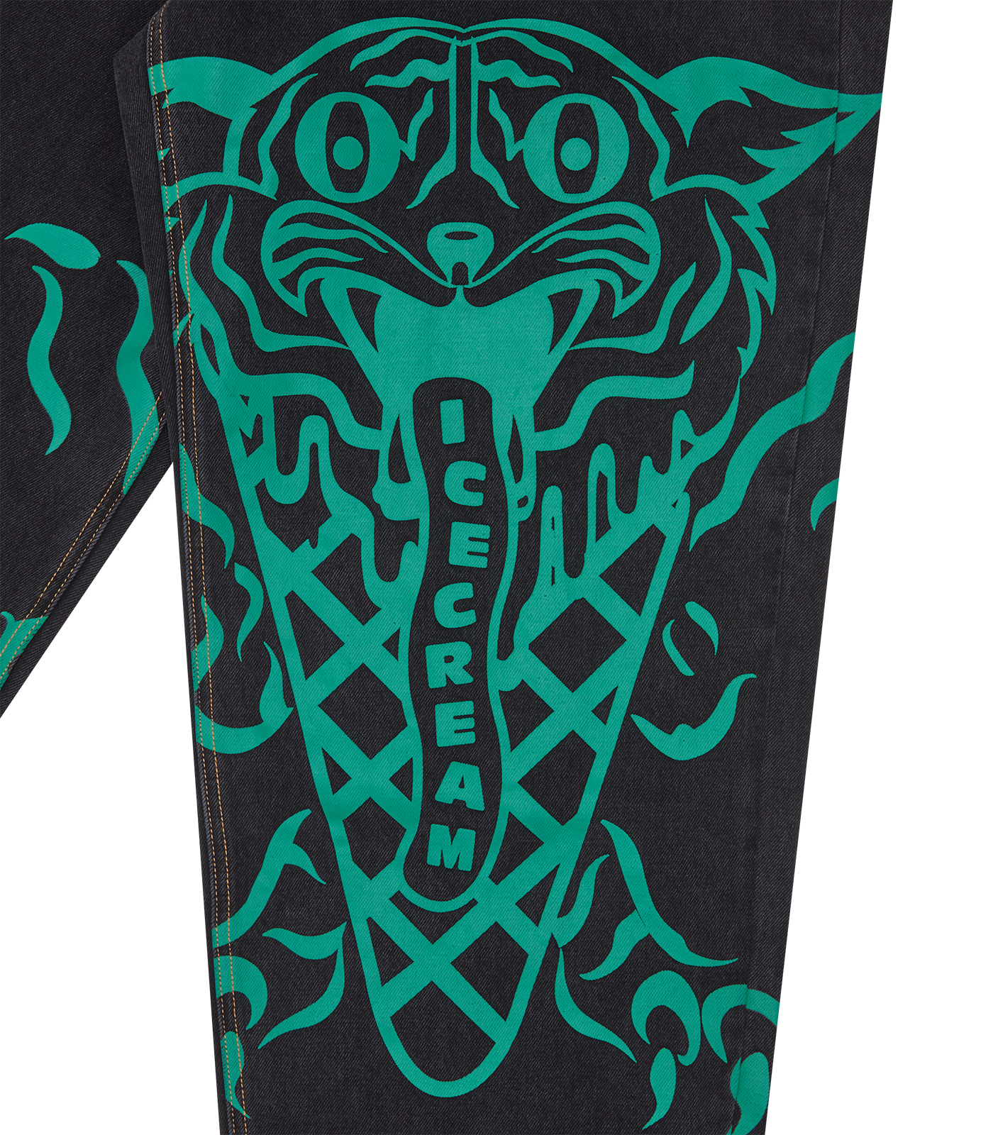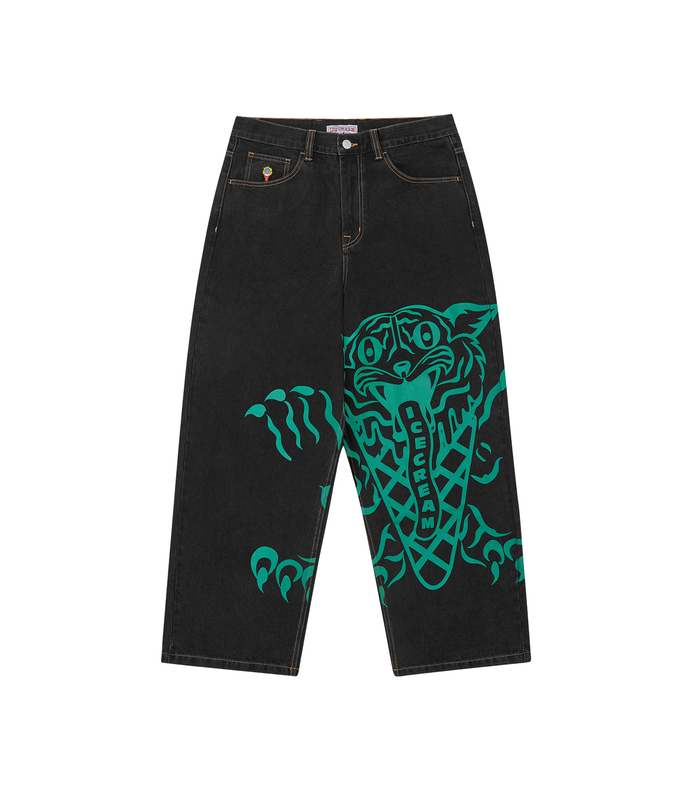 ICECREAM Fall '25 - Triple Scoop Denim Pants, feature a screen-printed graphic on the front, embroidered triple scoop signet and drip detailing on the back pockets, and a zip-fastened fly.