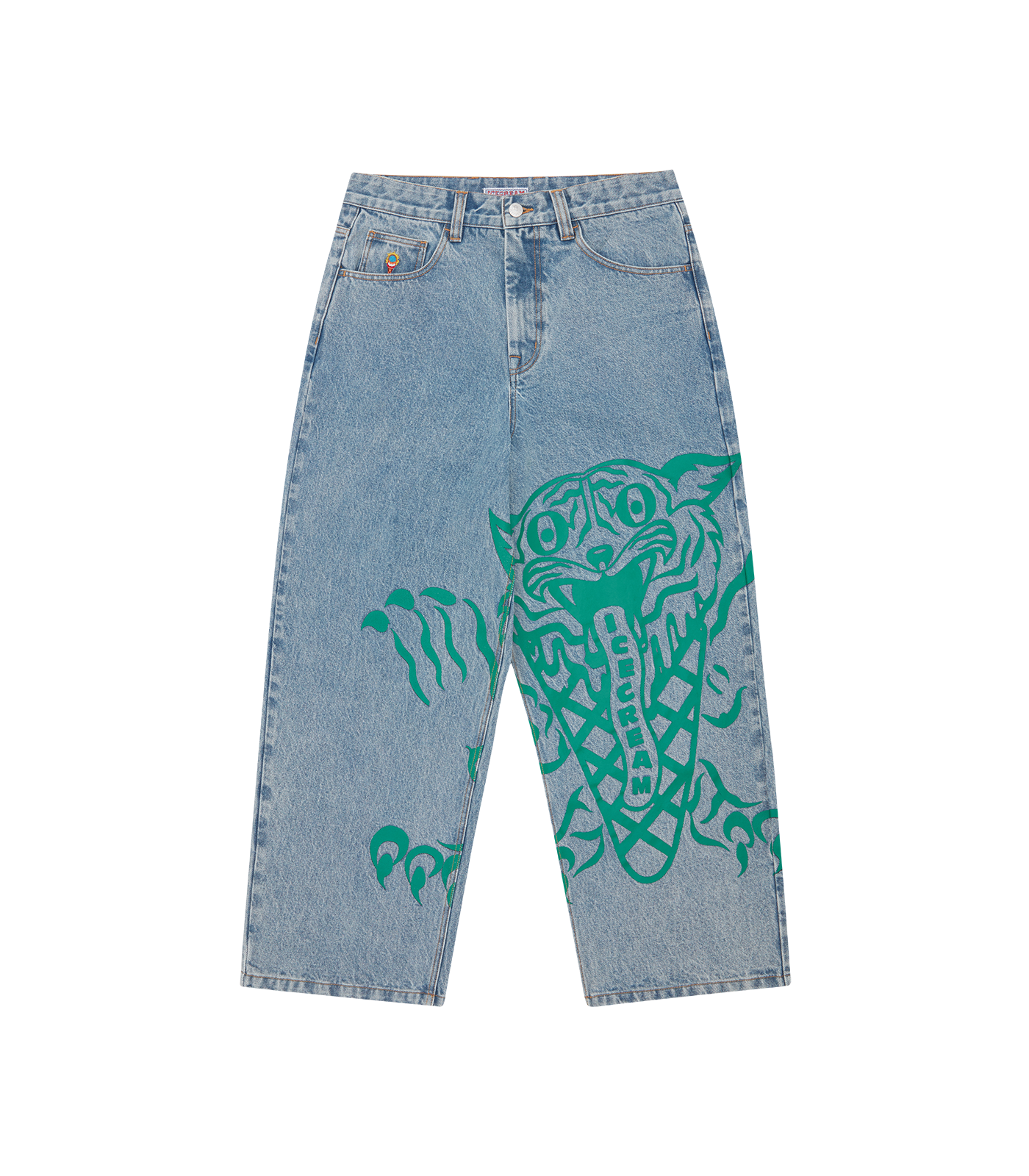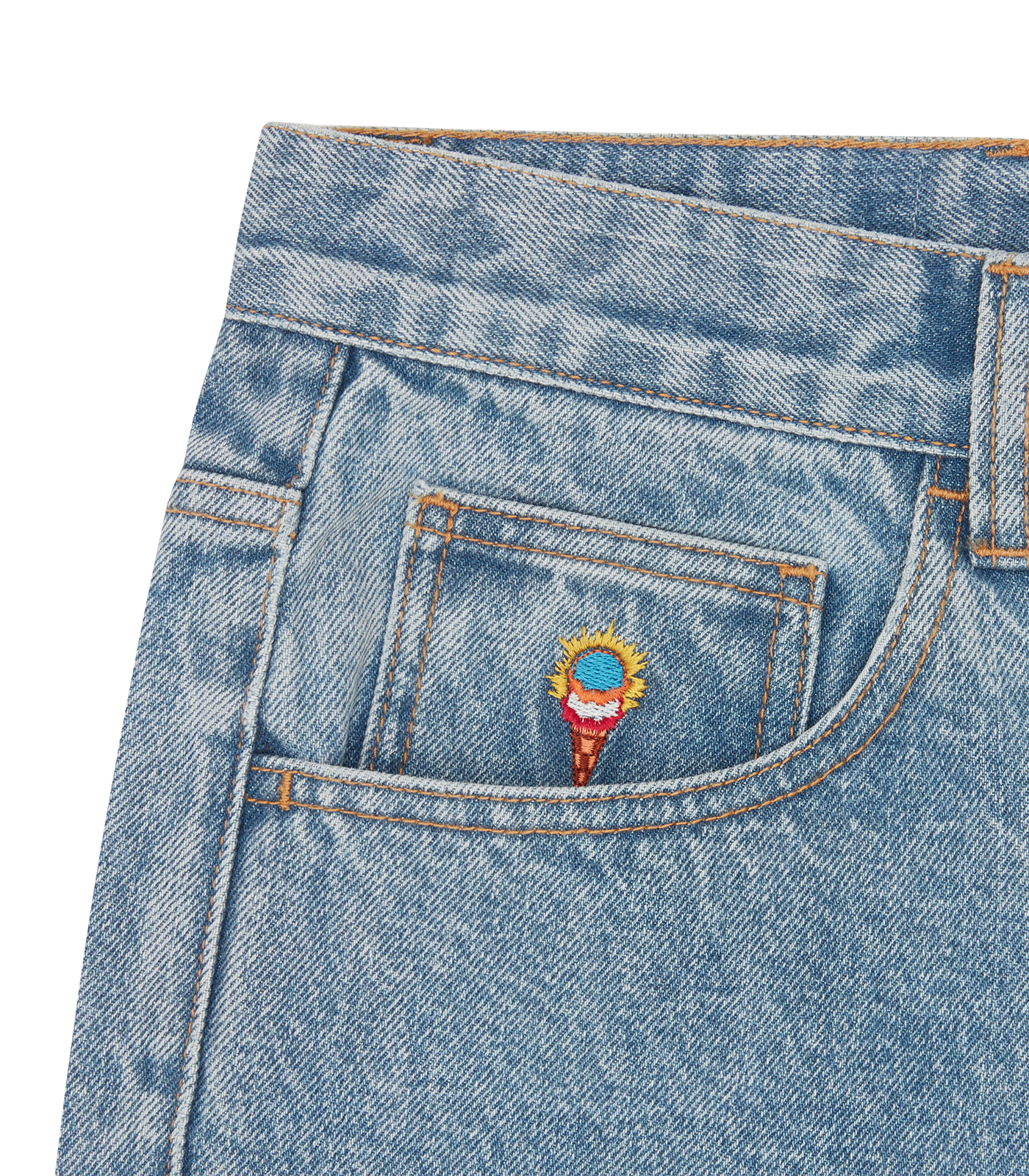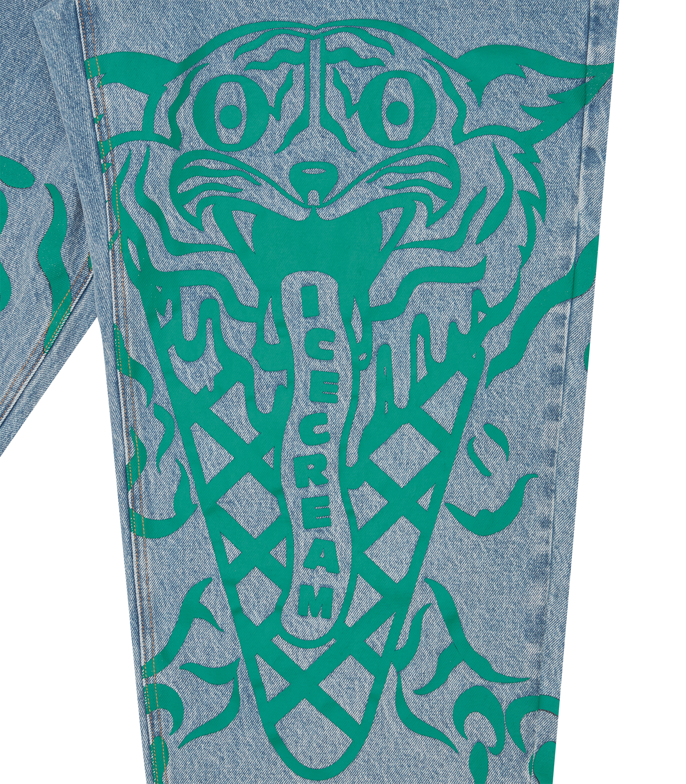 ICECREAM Fall '25 - Triple Scoop Denim Pants, feature a screen-printed graphic on the front, embroidered triple scoop signet and drip detailing on the back pockets, and a zip-fastened fly.